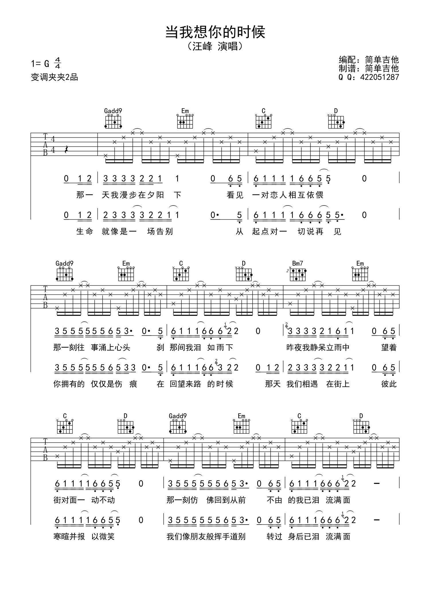 曲谱介绍: 变调夹夹第二品,汪峰略带忧伤的歌总可以唱出岁月的沧桑,一首《当我想你的时候》唱出男人对于生活的承受,又有多少的来自于你不忍触碰到的伤痛。那一刻往事涌上心头刹那间我泪如雨下。有故事的人,才能用真挚的情感唱出最动人的歌!