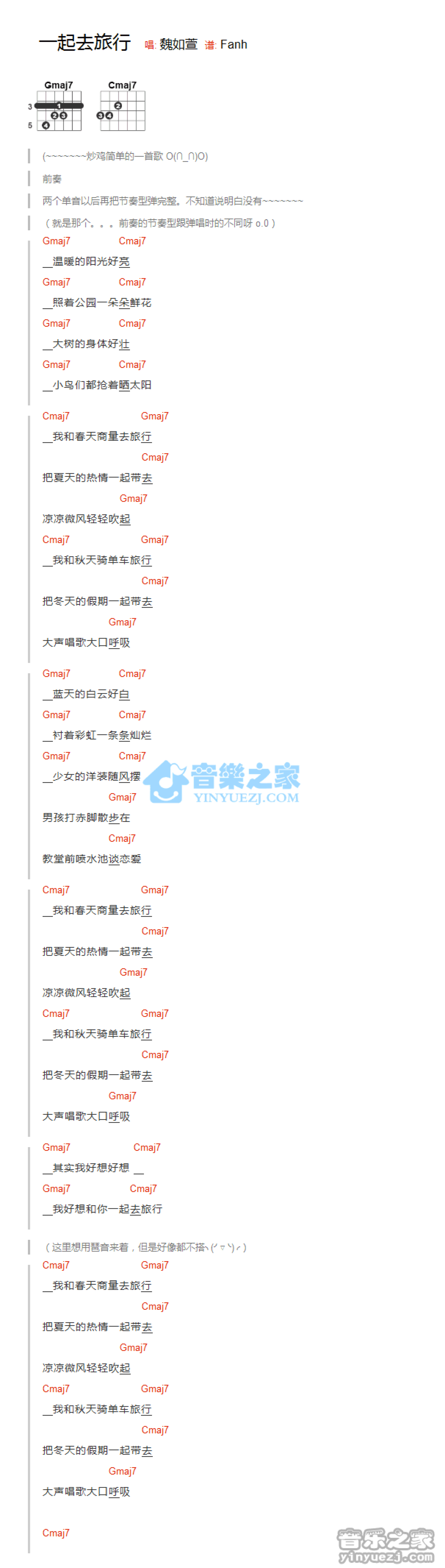 曲谱介绍: 魏如萱《一起去旅行》吉他和弦弹唱谱