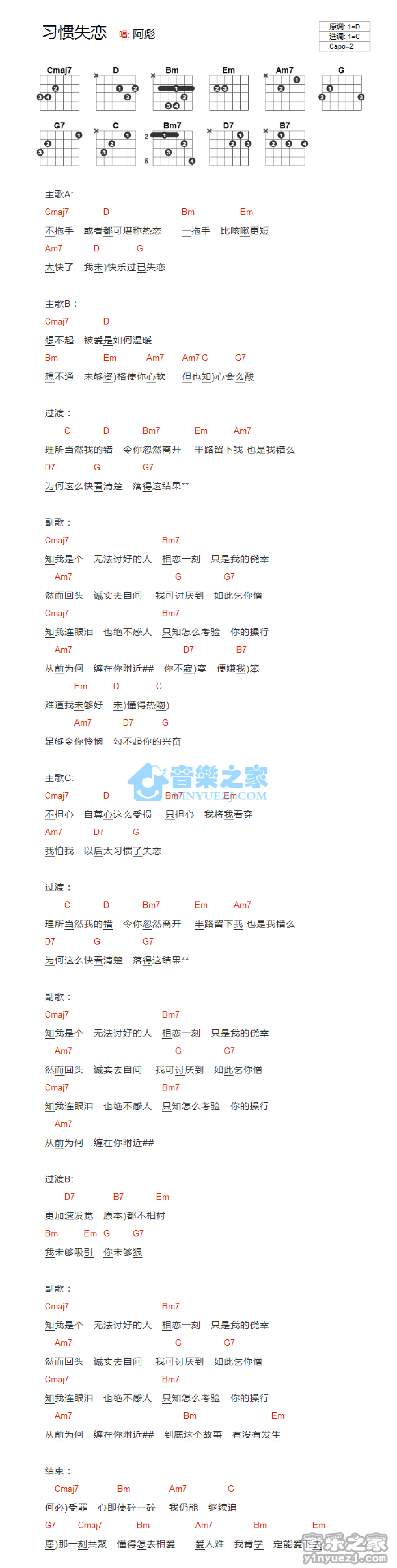 曲谱介绍: C调版《习惯失恋》吉他和弦弹唱谱