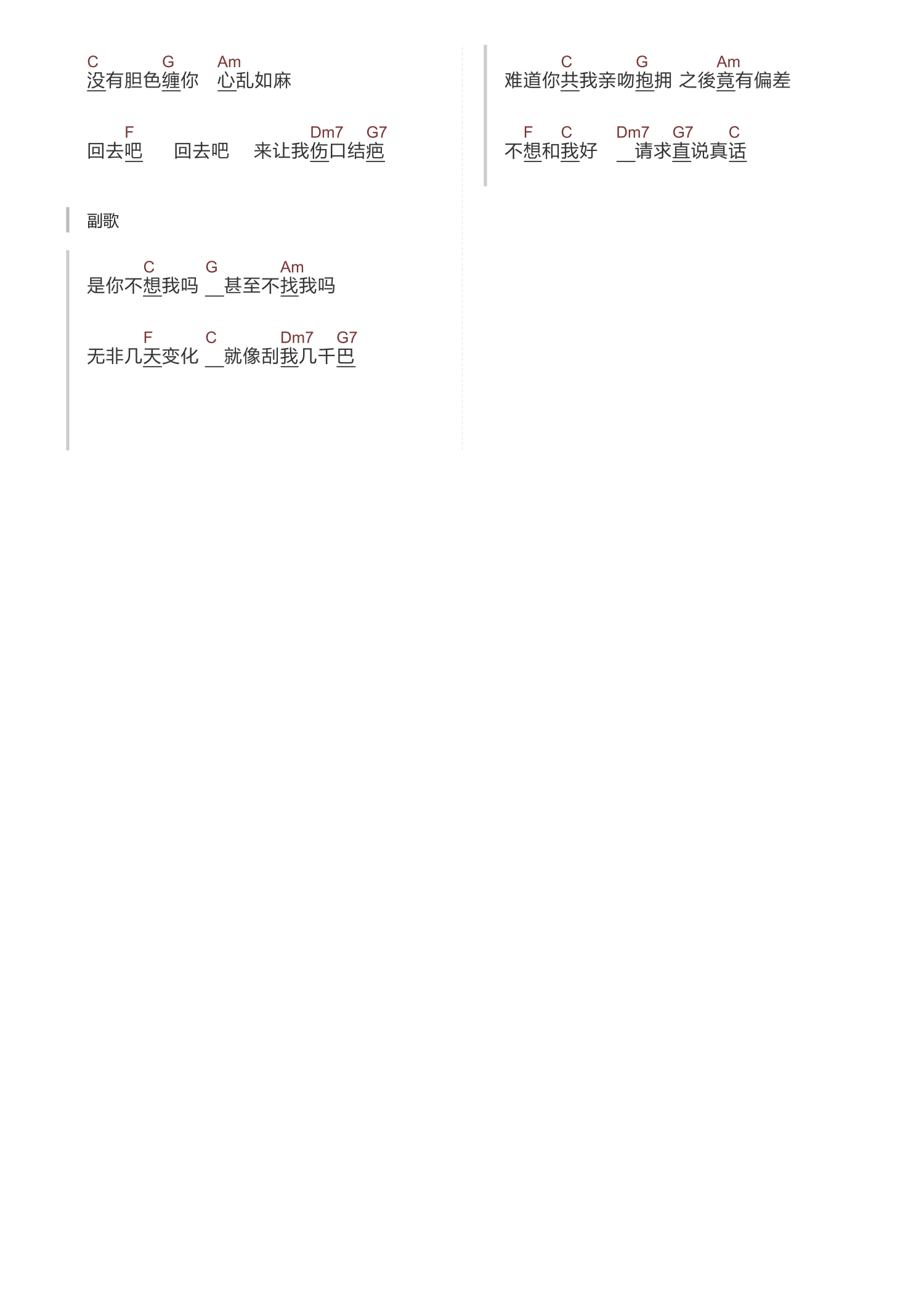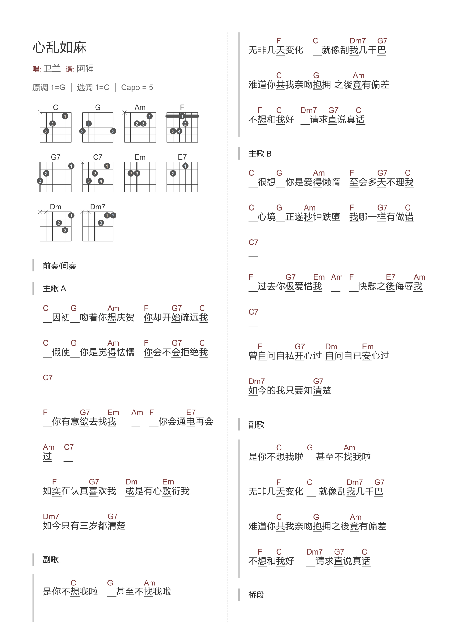 曲谱介绍: 卫兰《心乱如麻》吉他谱_C调吉他弹唱谱_和弦谱