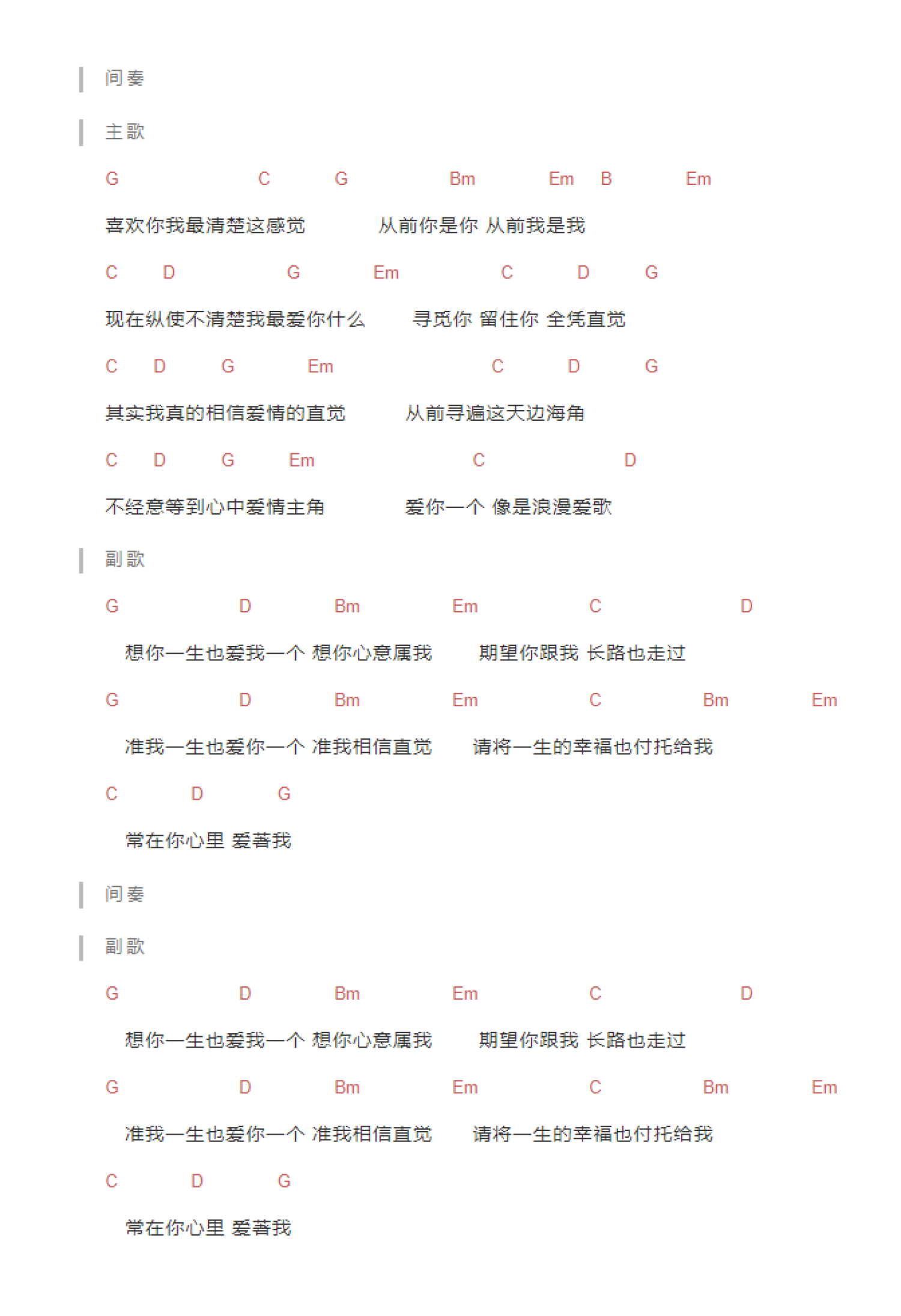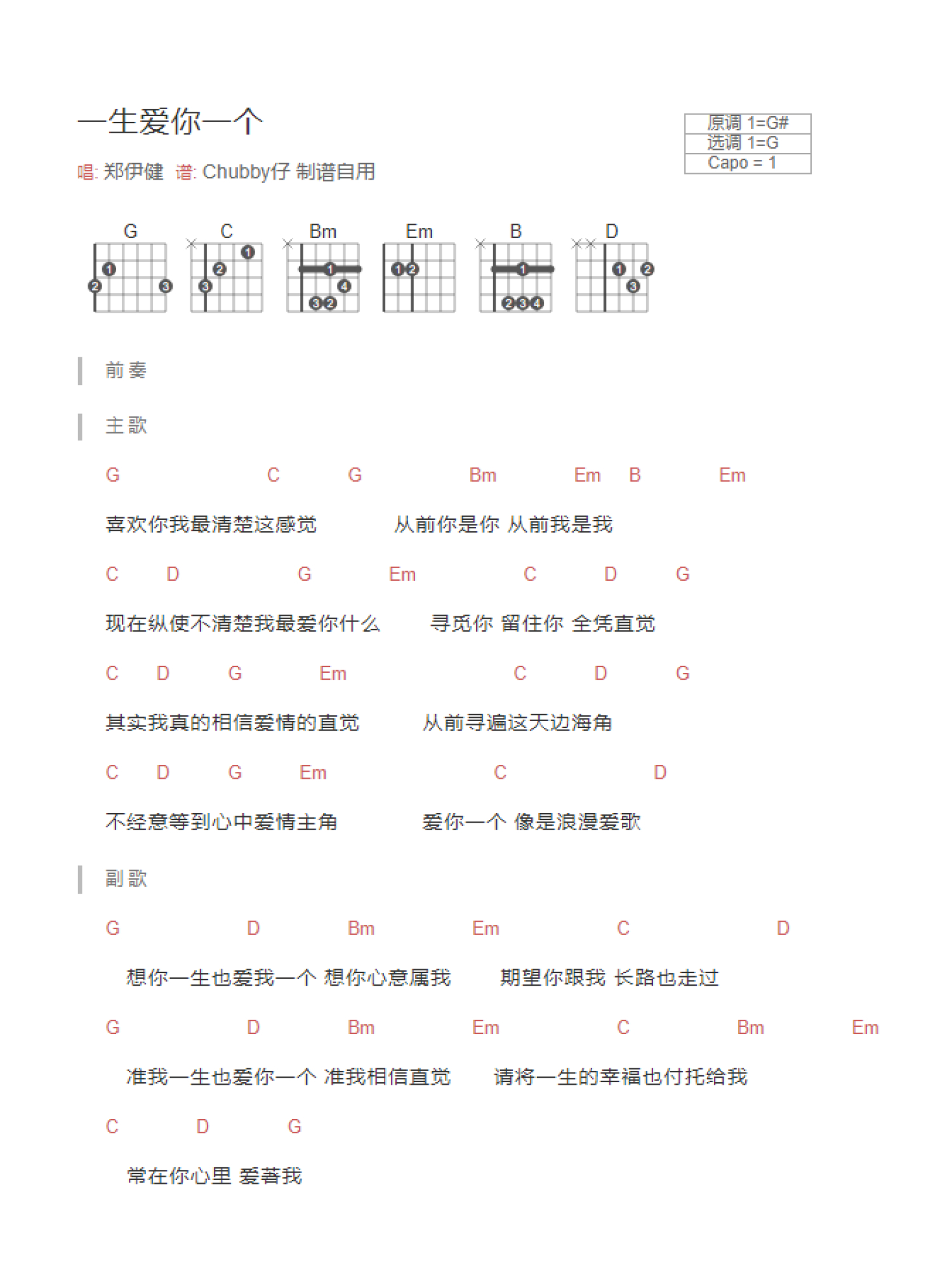曲谱介绍: G调版《一生爱你一个》吉他和弦弹唱谱