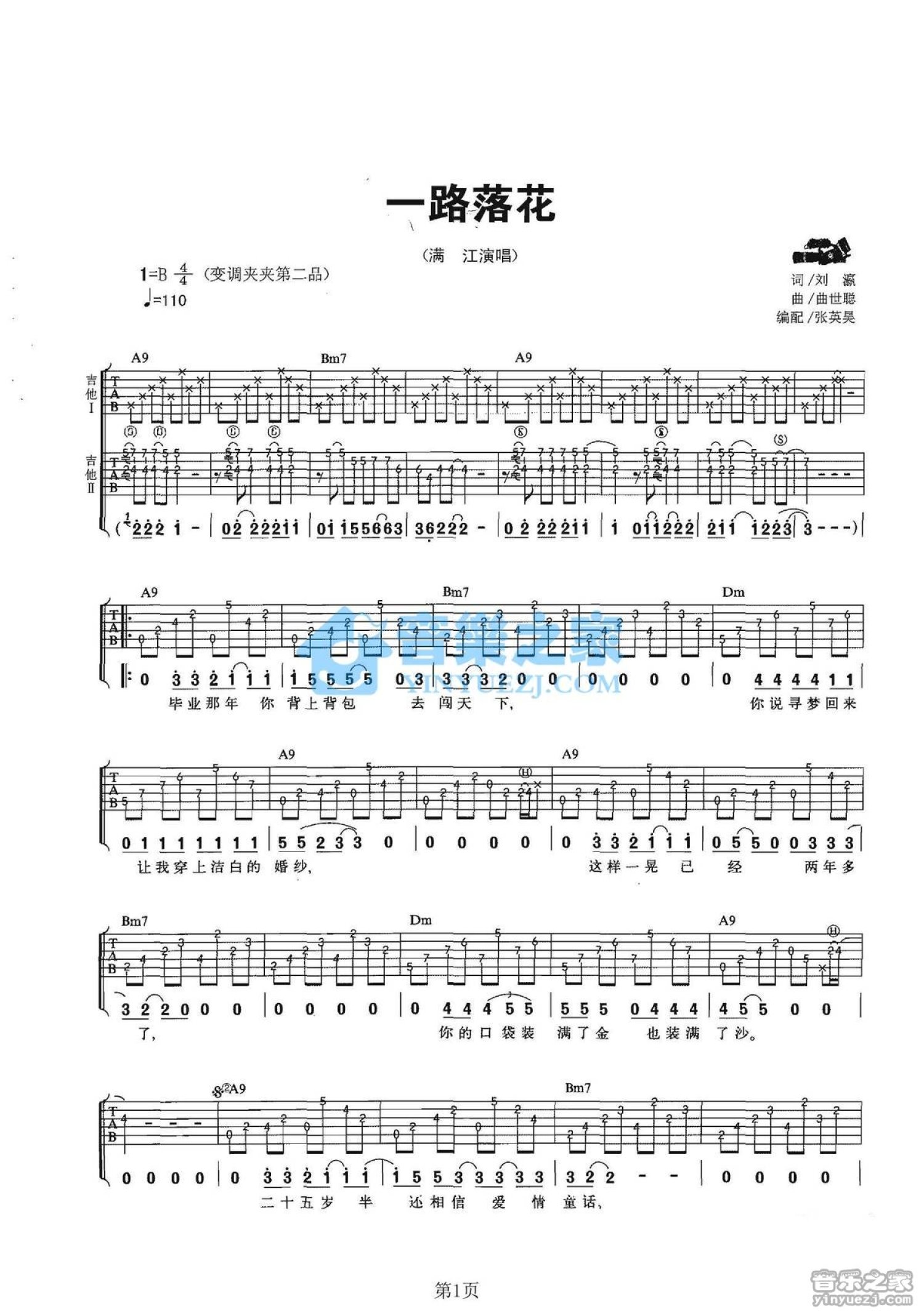 曲谱介绍: B调双吉他版满江《一路落花》吉他弹唱六线谱