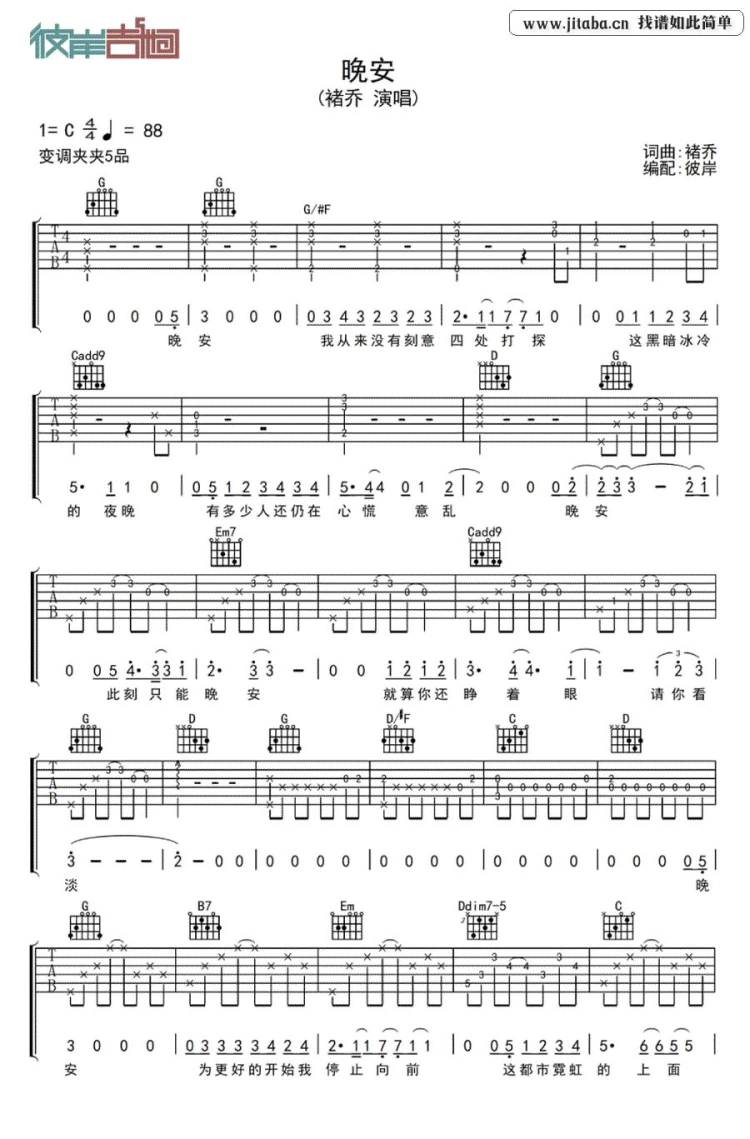 褚乔 晚安吉他谱 - 褚乔 - G调吉他弹唱谱