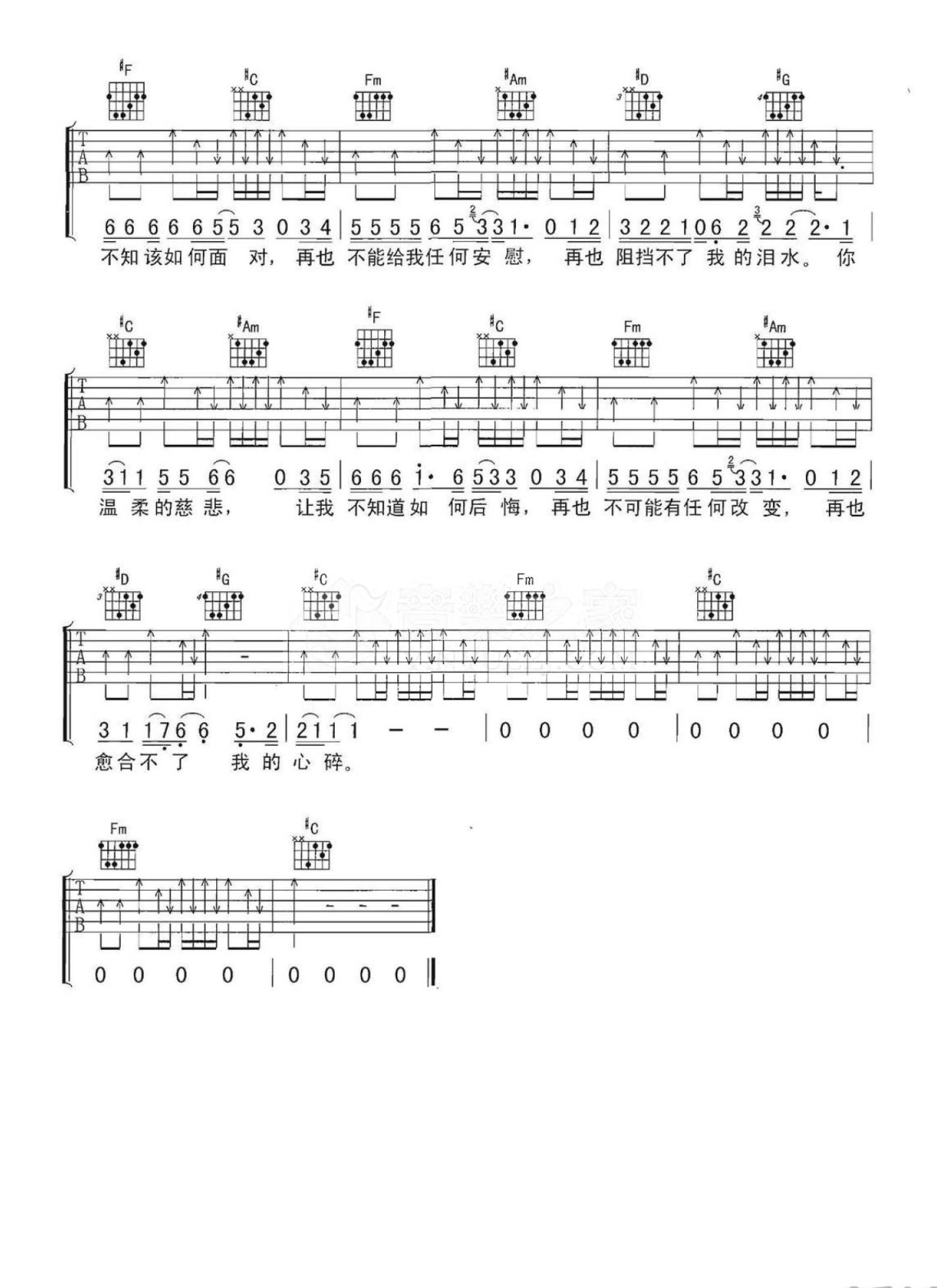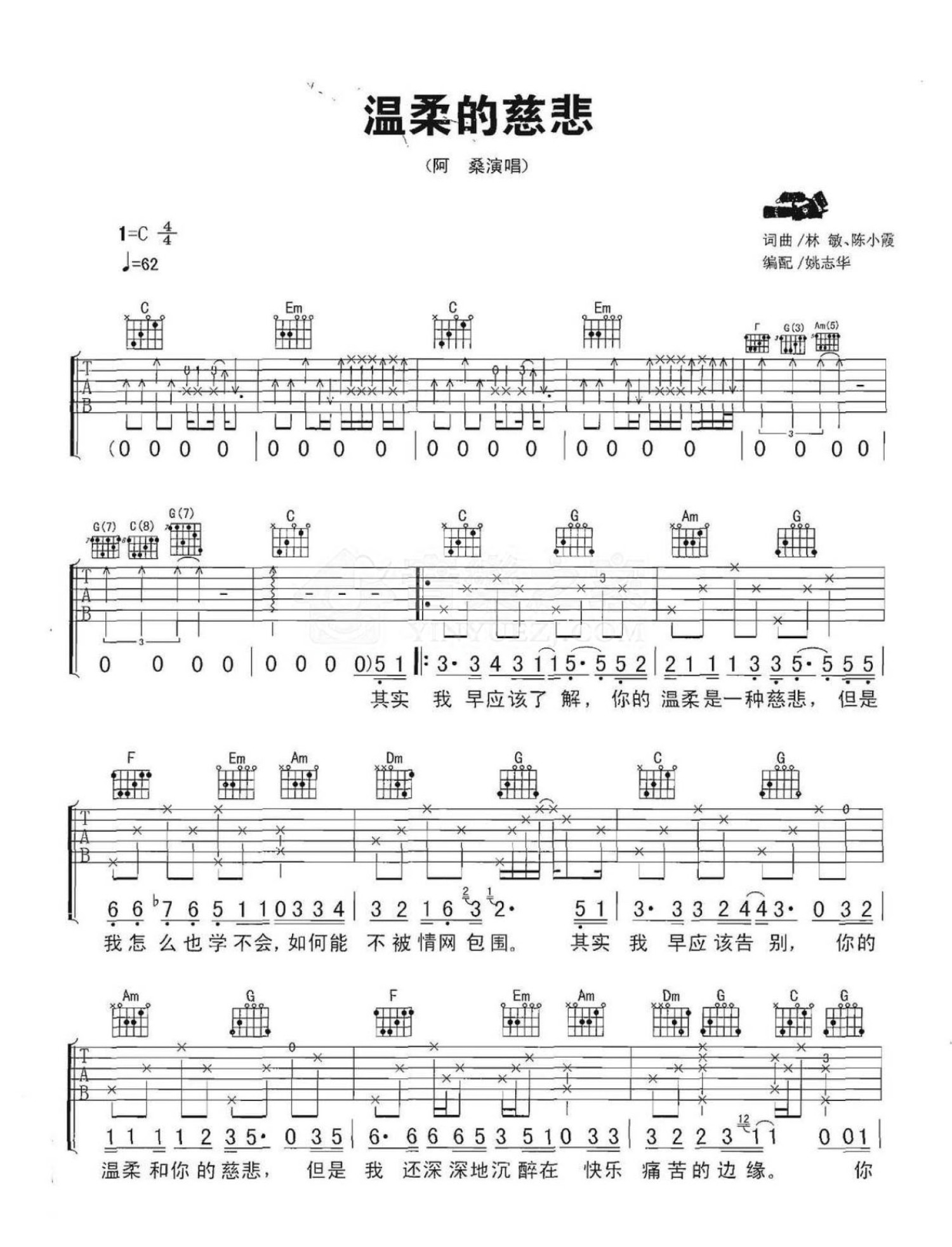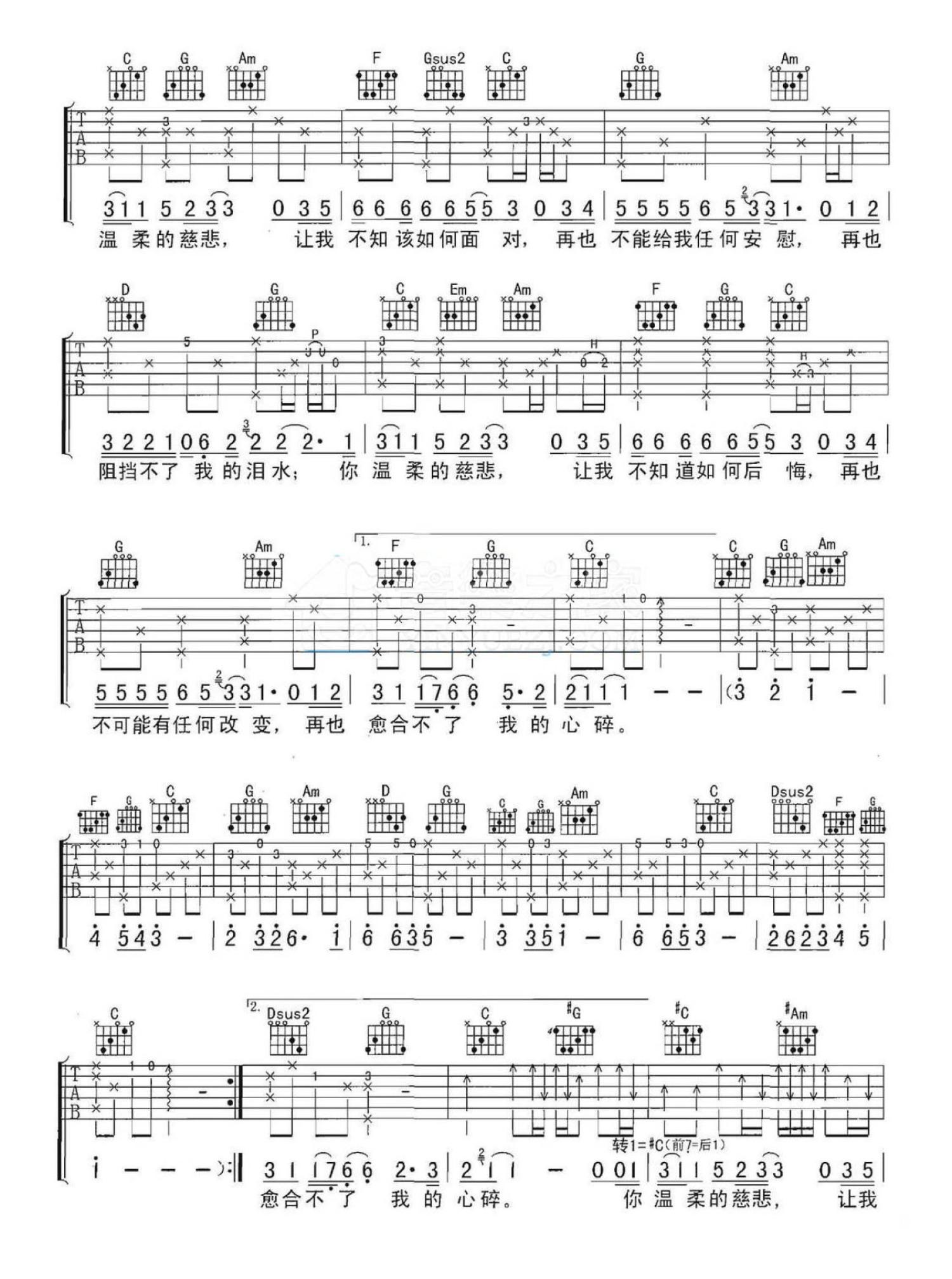 曲谱介绍: C调版《温柔的慈悲》吉他弹唱六线谱