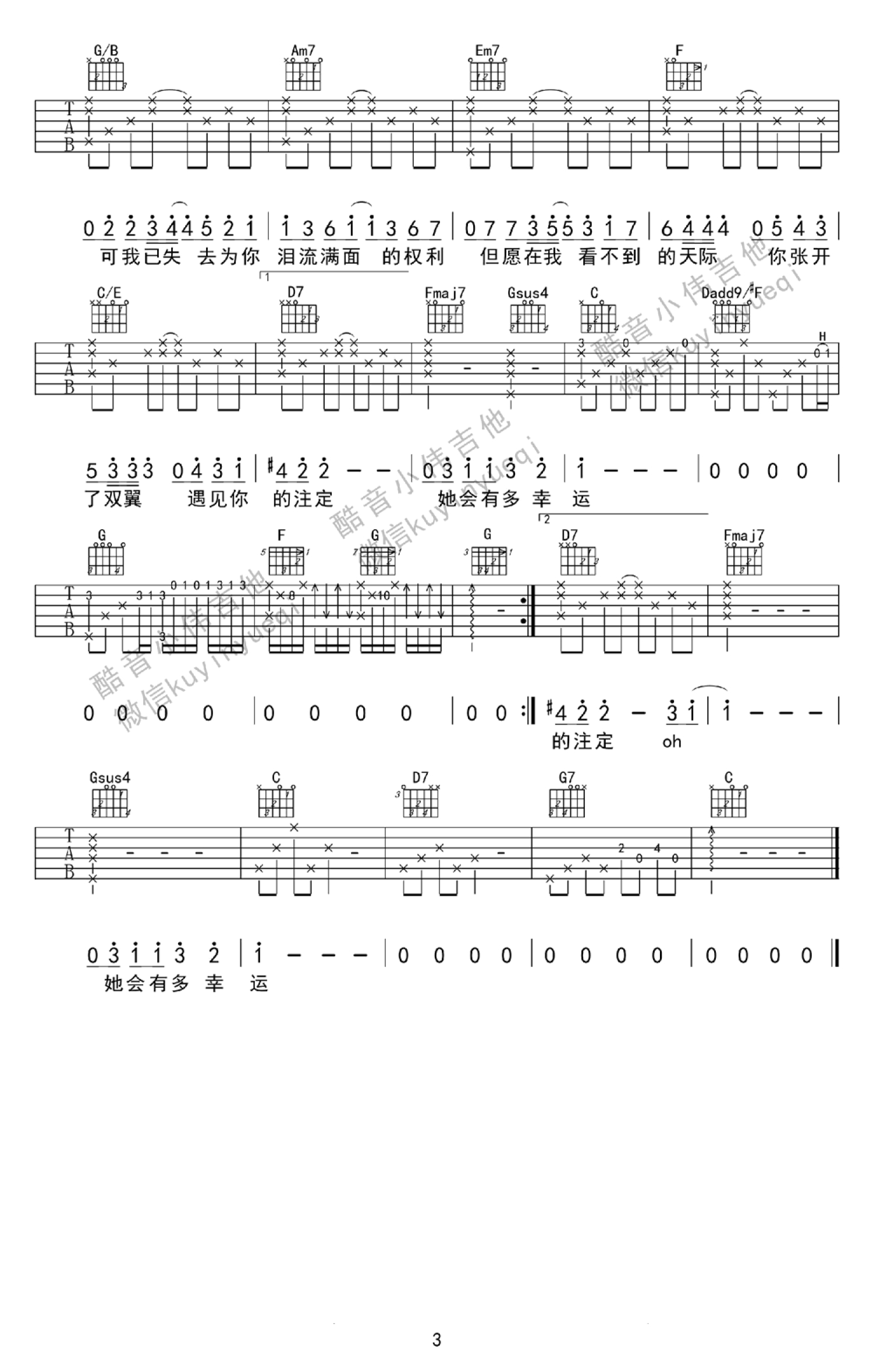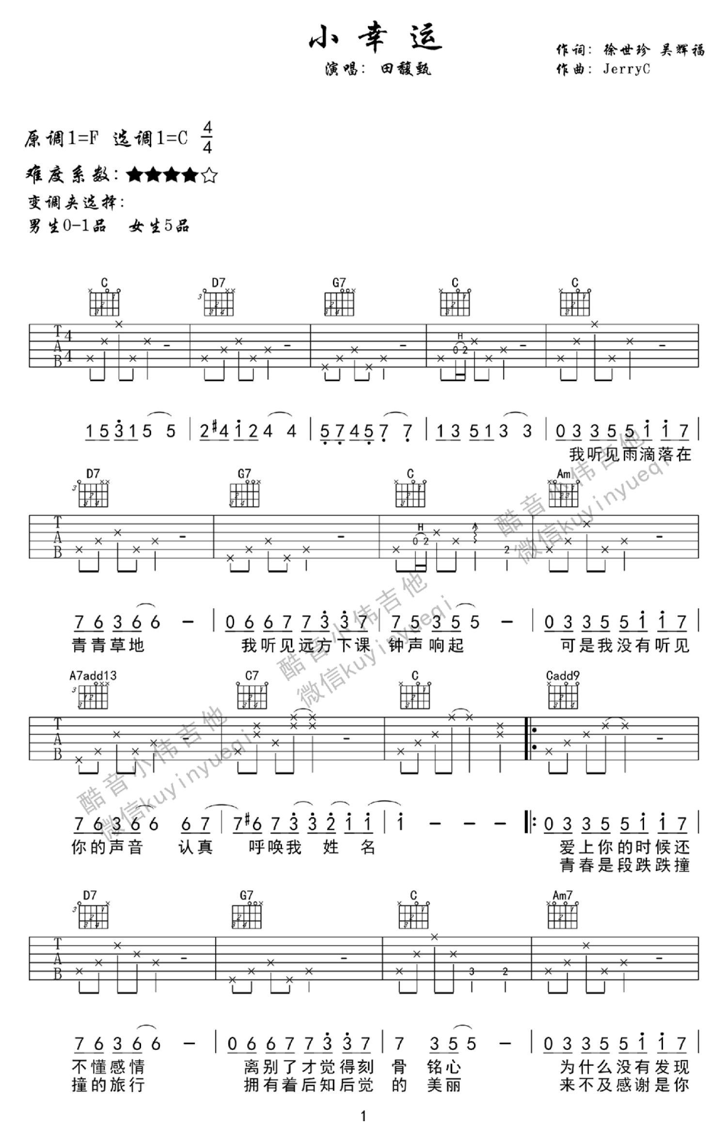 曲谱介绍: 带间奏六线谱,原调F选调C调,难度系数四颗星,变调夹选择,男生0-1品,女生5品。台湾一部清新的青春电影《我的少女时代》主题曲,无论你的青春有沒有过那份小幸运,在田馥甄清澈哀伤的嗓音下,你都能感同身受,歌曲弹唱看似简单,实则要唱出那份悸动不是那么容易。