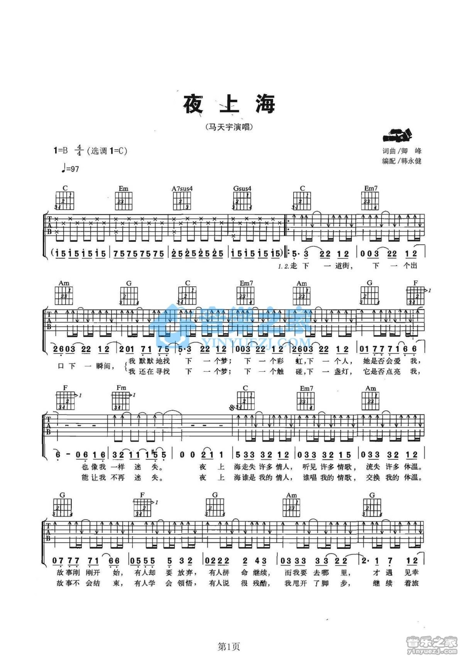 曲谱介绍: C调版马天宇《夜上海》吉他弹唱六线谱