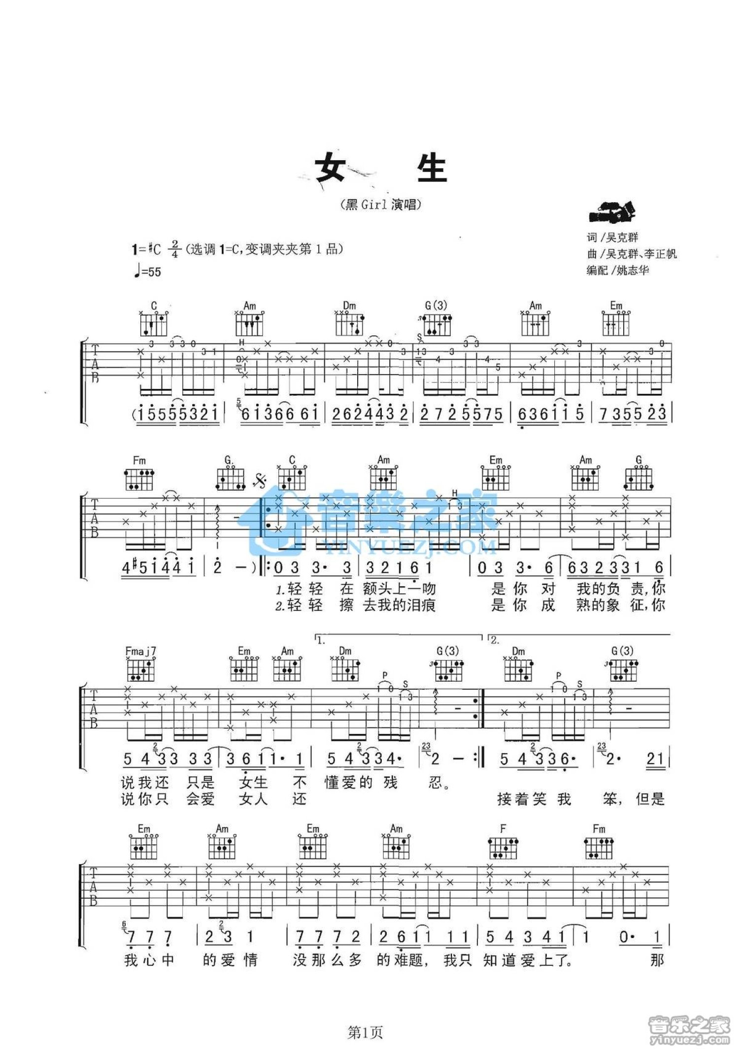 曲谱介绍: C调版黑Girl《女生》吉他弹唱六线谱