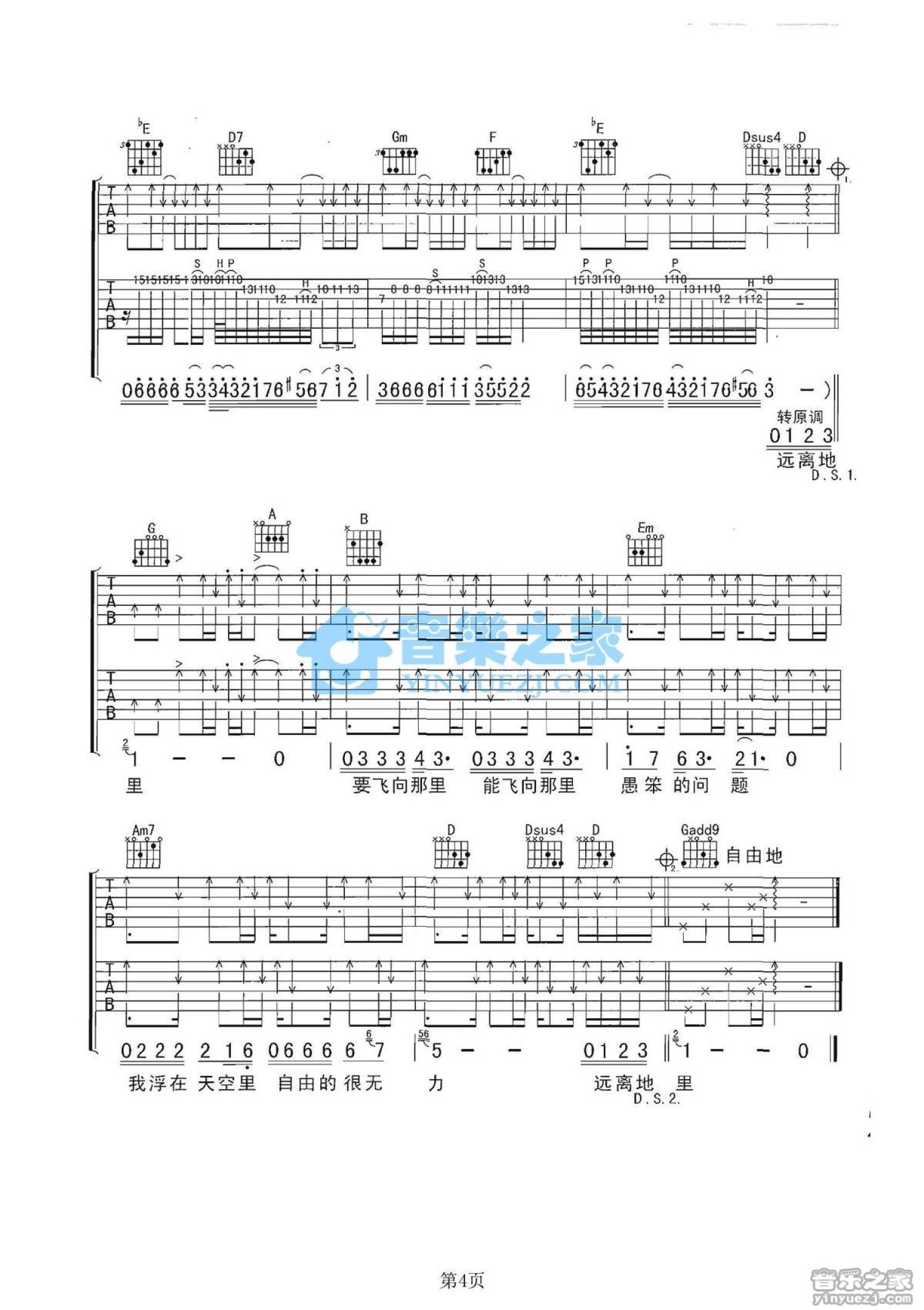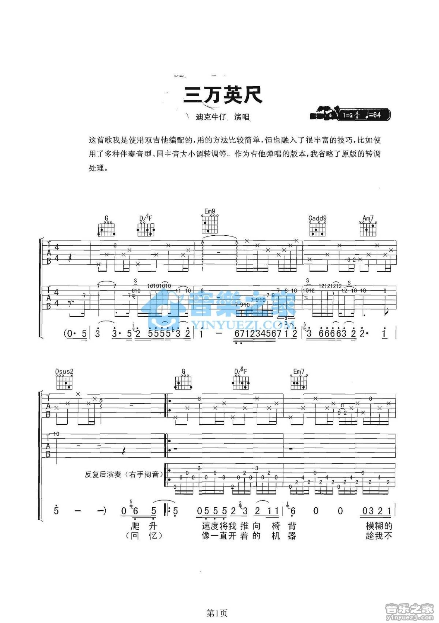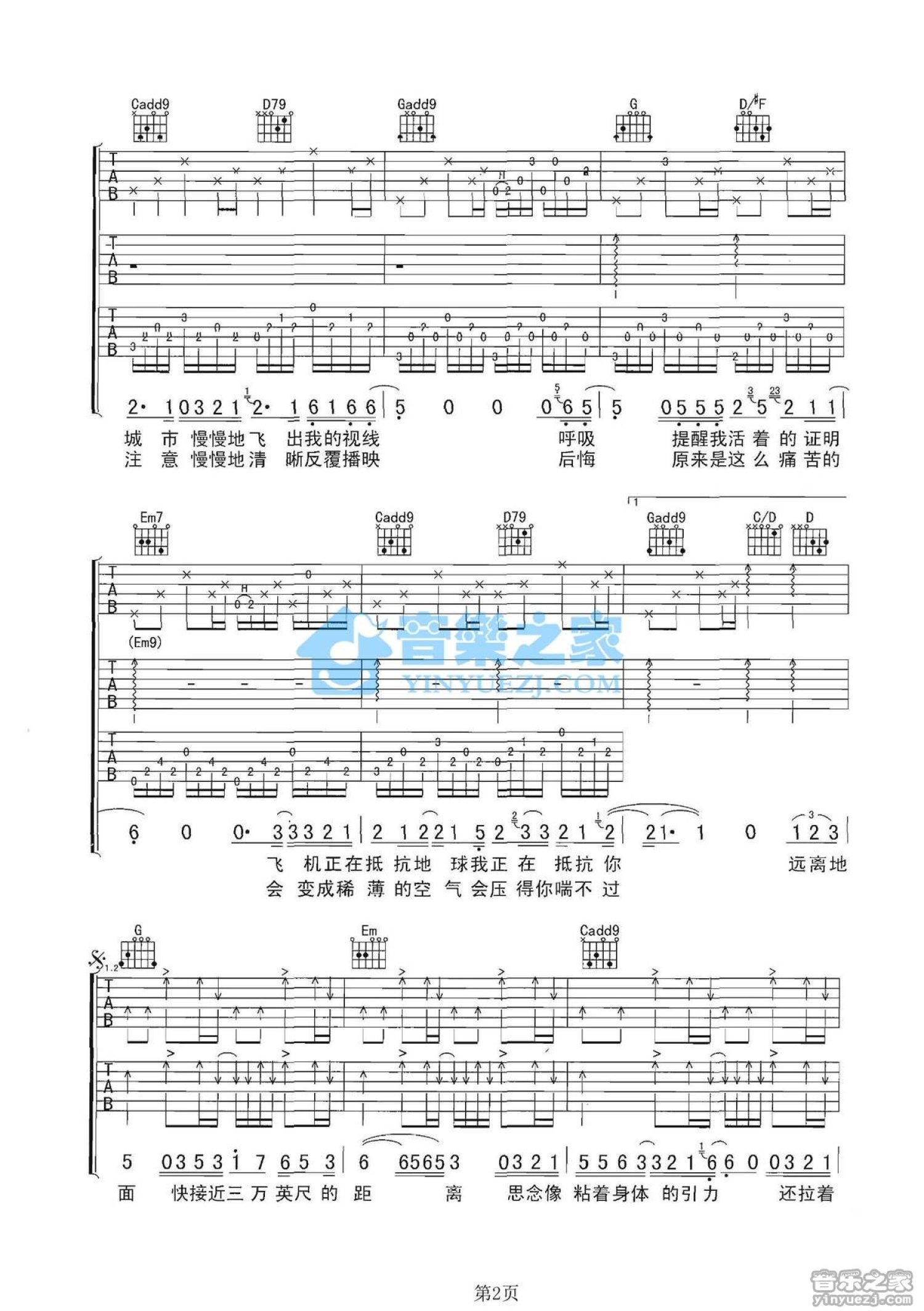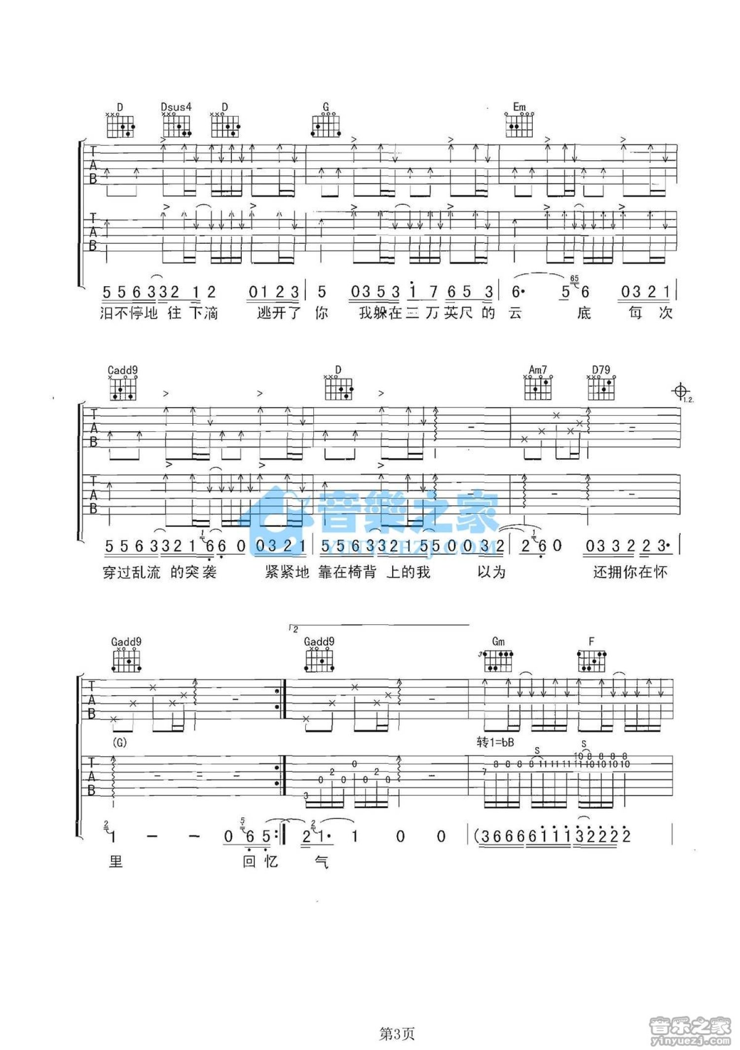 曲谱介绍: G调《三万英尺》吉他弹唱六线谱