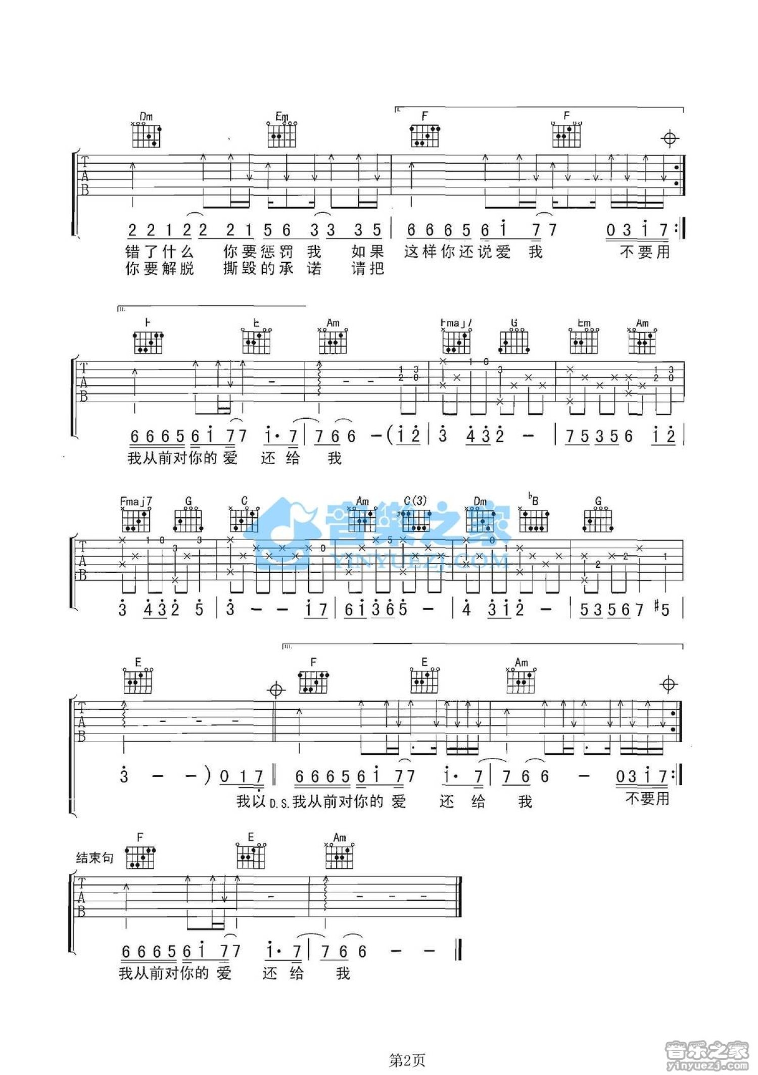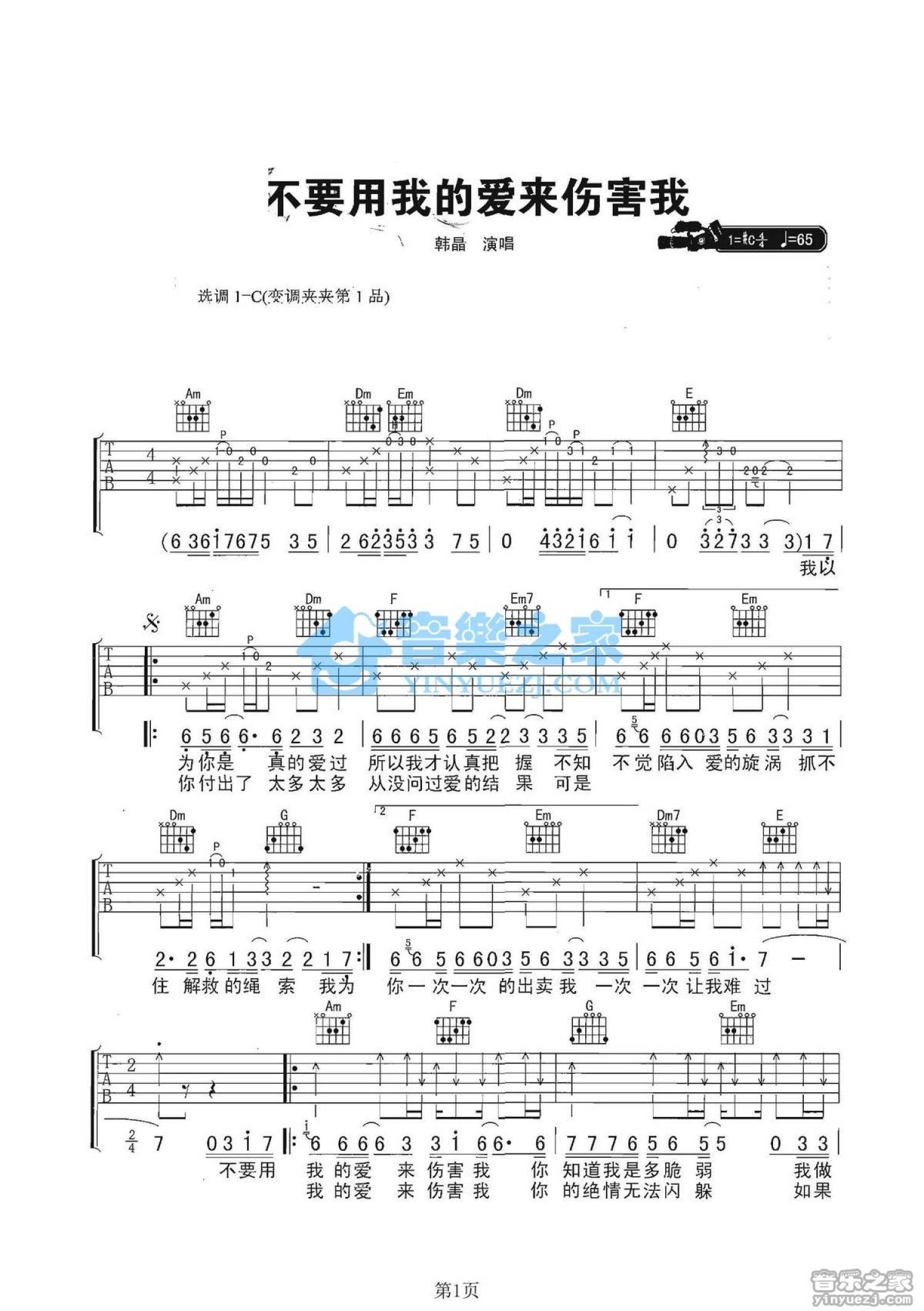 曲谱介绍: C调版《不要用我的爱来伤害我》吉他弹唱六线谱