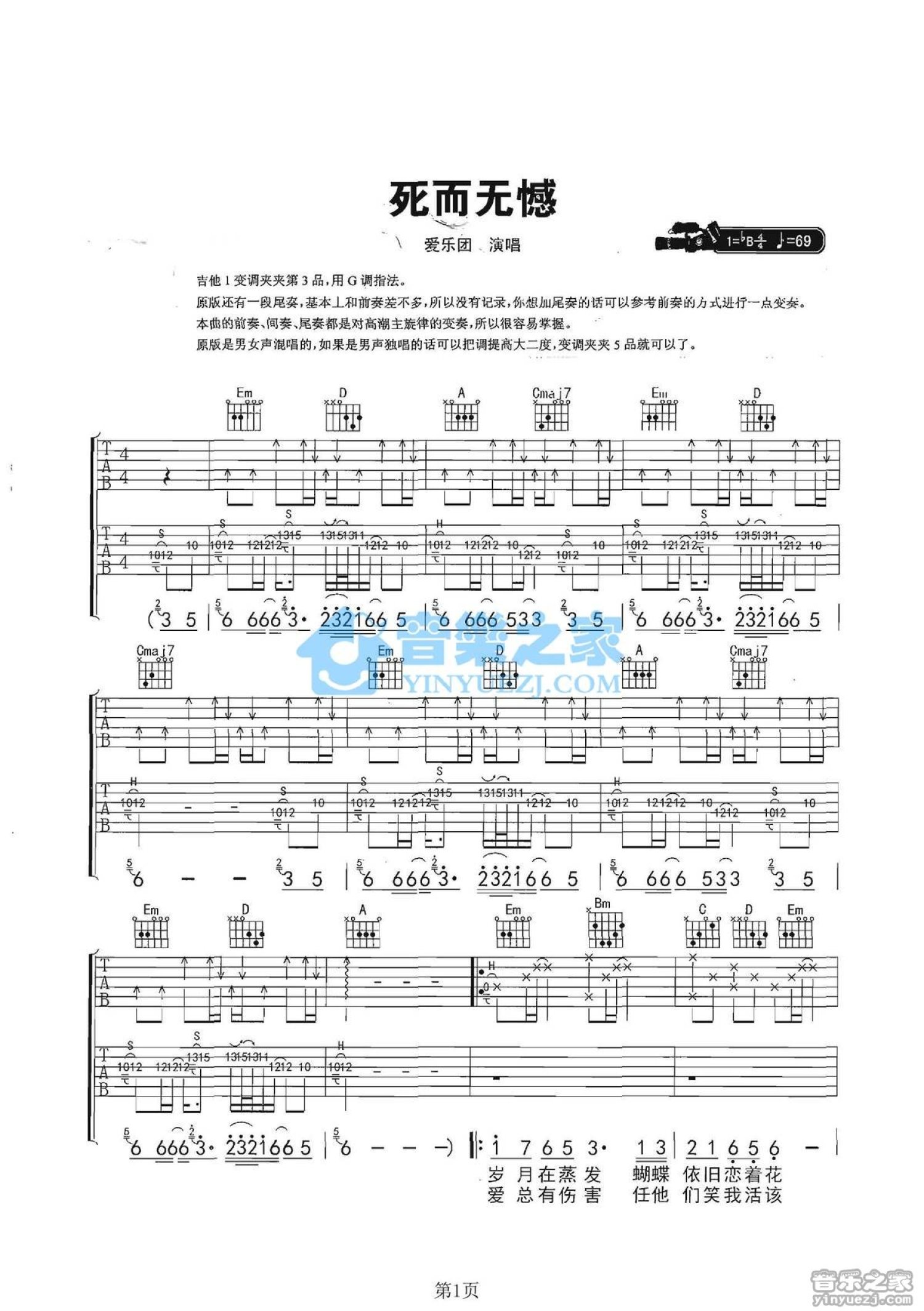曲谱介绍: G调双吉他版爱乐团《死而无憾》吉他弹唱六线谱