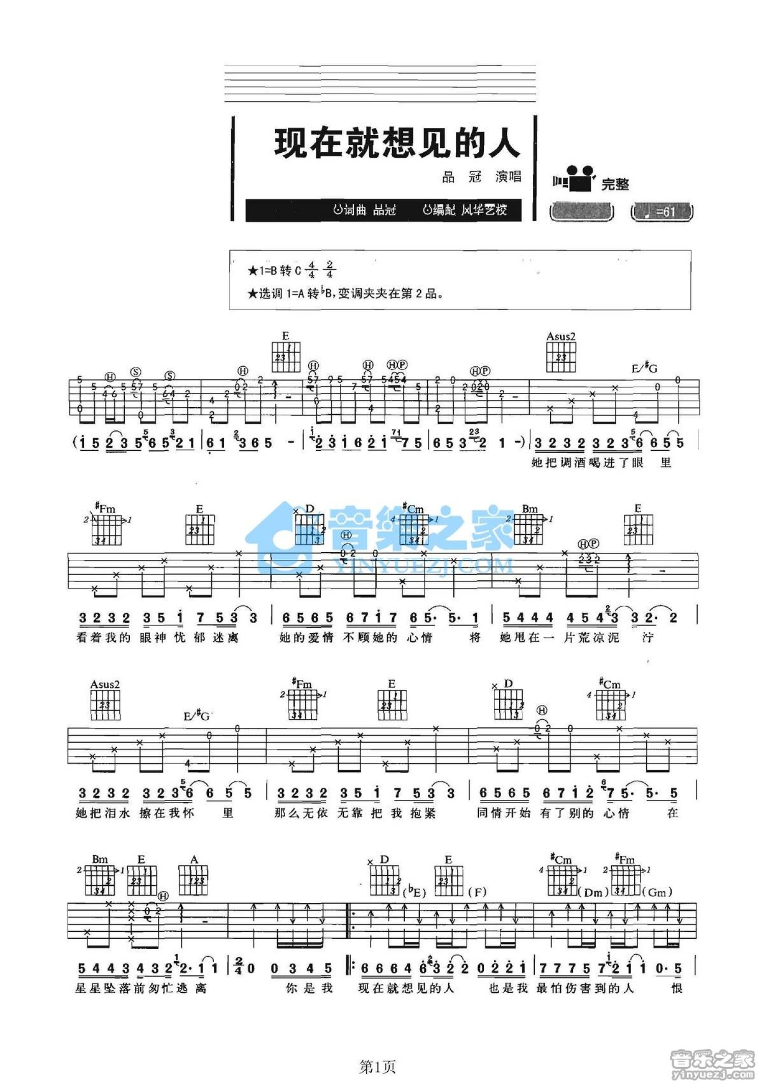曲谱介绍: B转C调版品冠《现在就想见的人》吉他弹唱六线谱