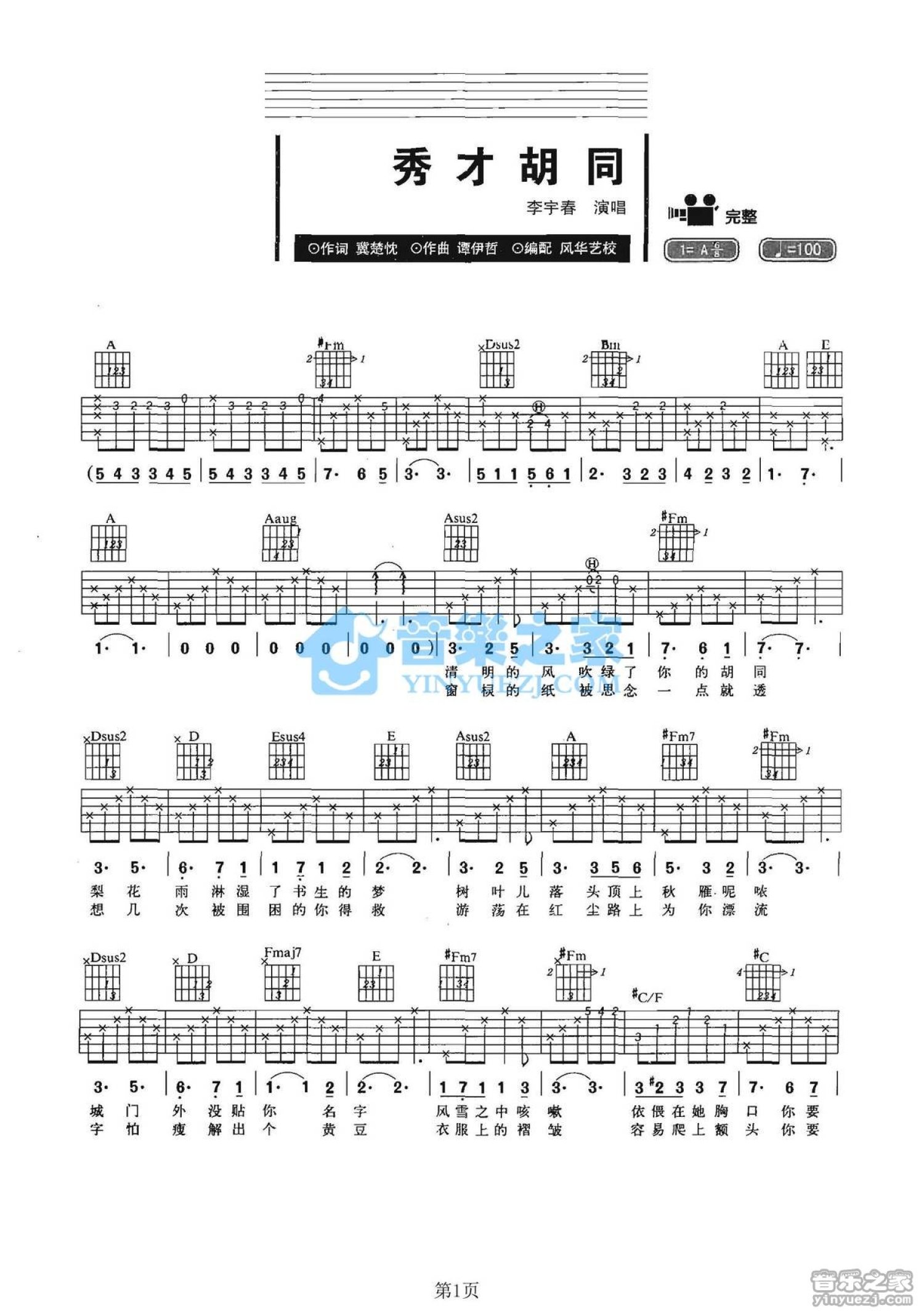 曲谱介绍: A调版李宇春《秀才胡同》吉他弹唱六线谱