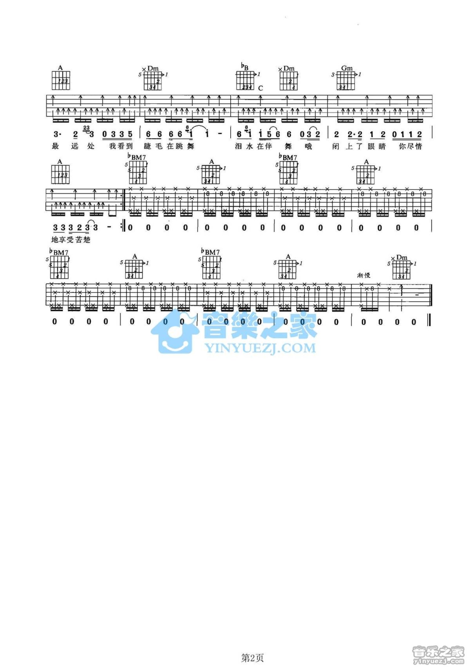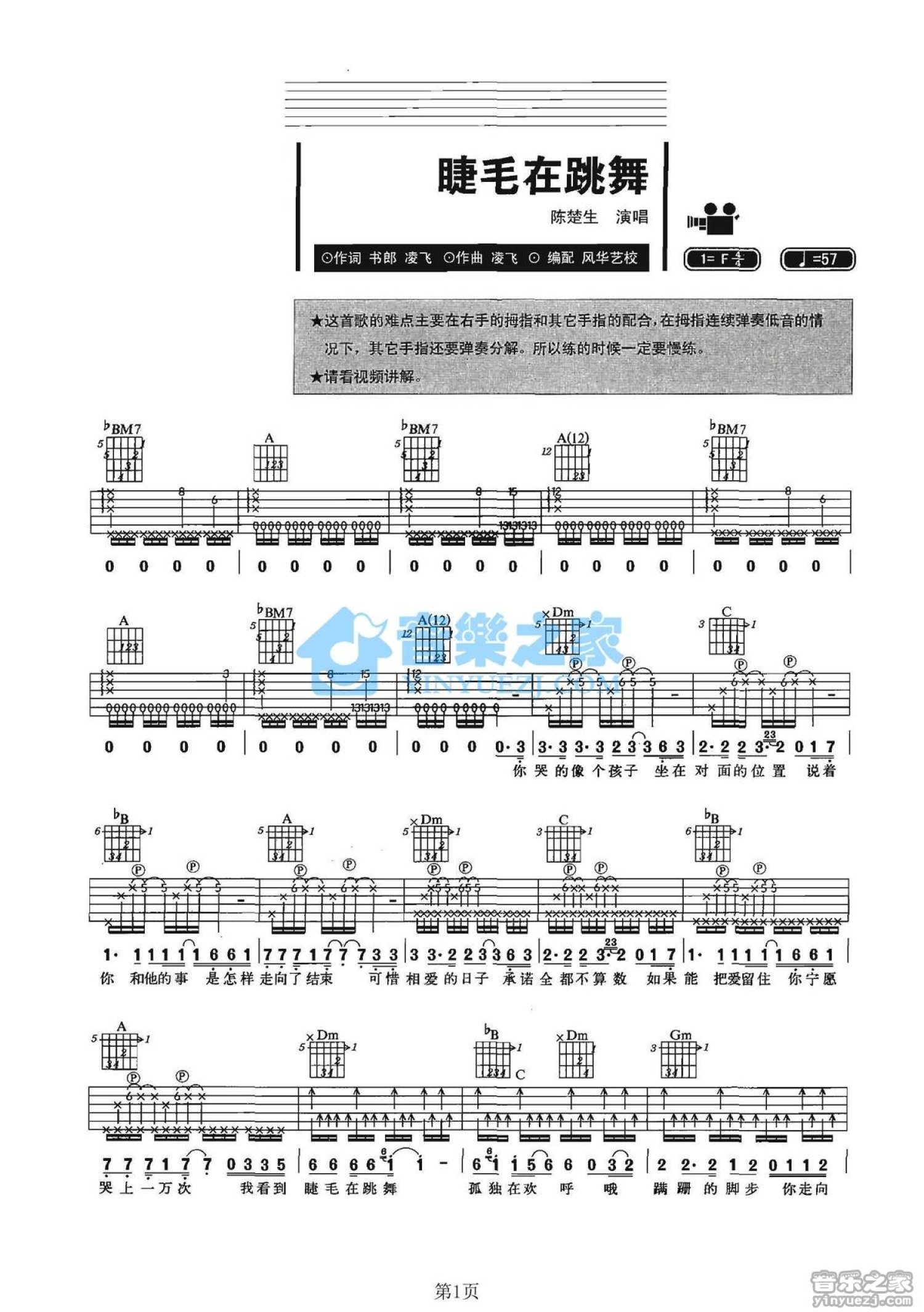 曲谱介绍: F调版陈楚生《睫毛在跳舞》吉他弹唱六线谱