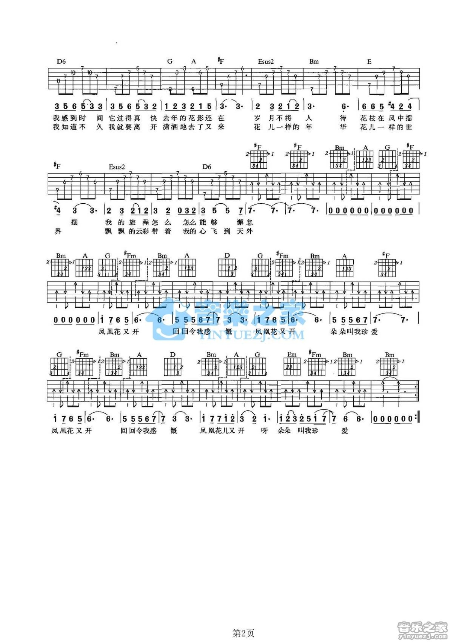 曲谱介绍: D调版陈楚生《凤凰花又开》吉他弹唱六线谱