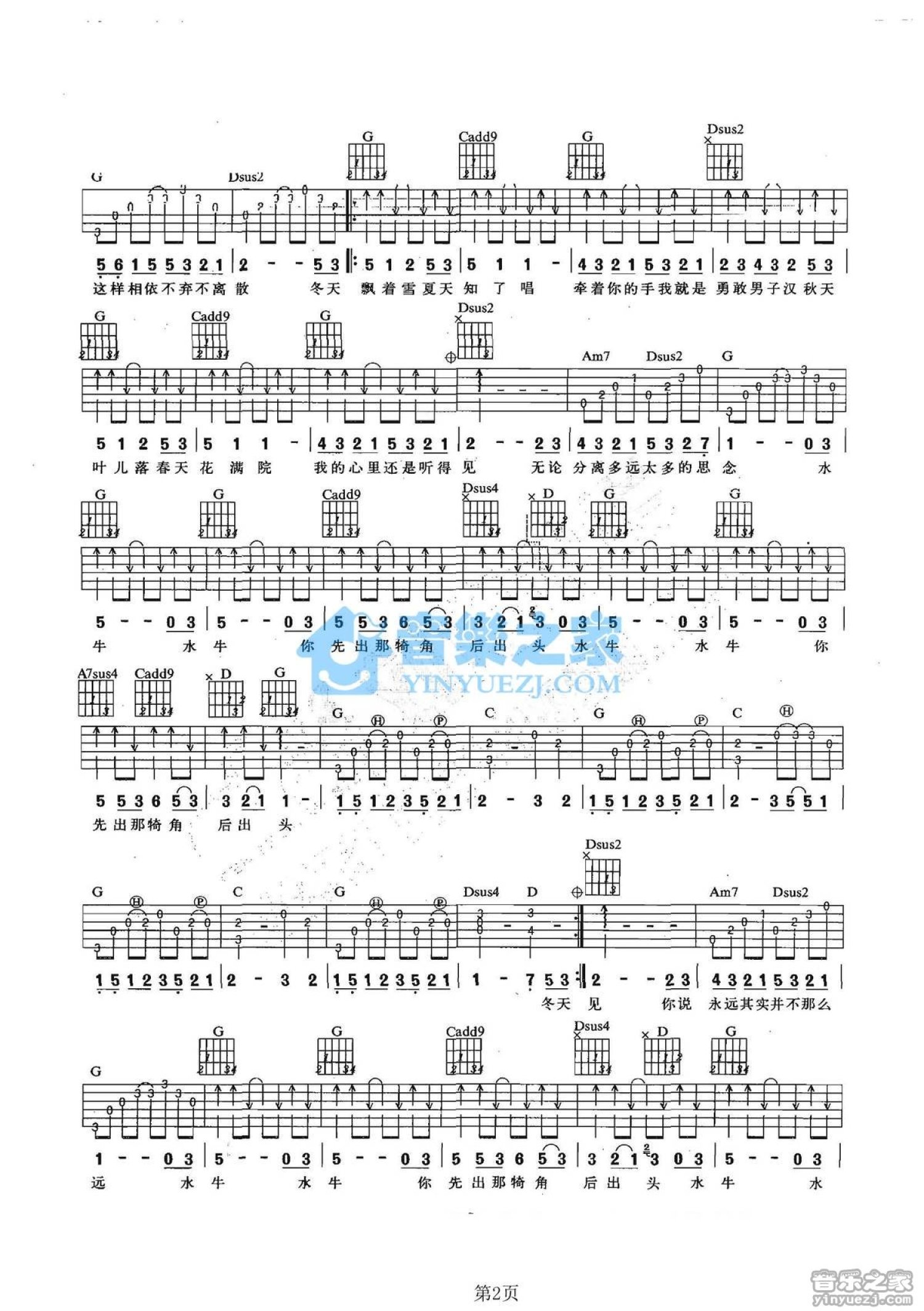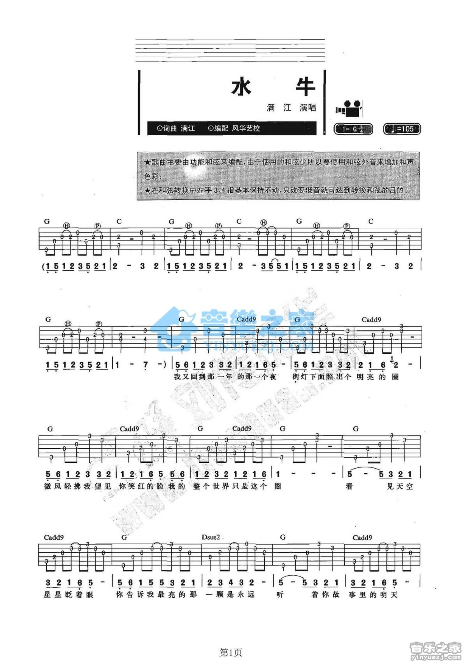 曲谱介绍: G调版满江《水牛》吉他弹唱六线谱