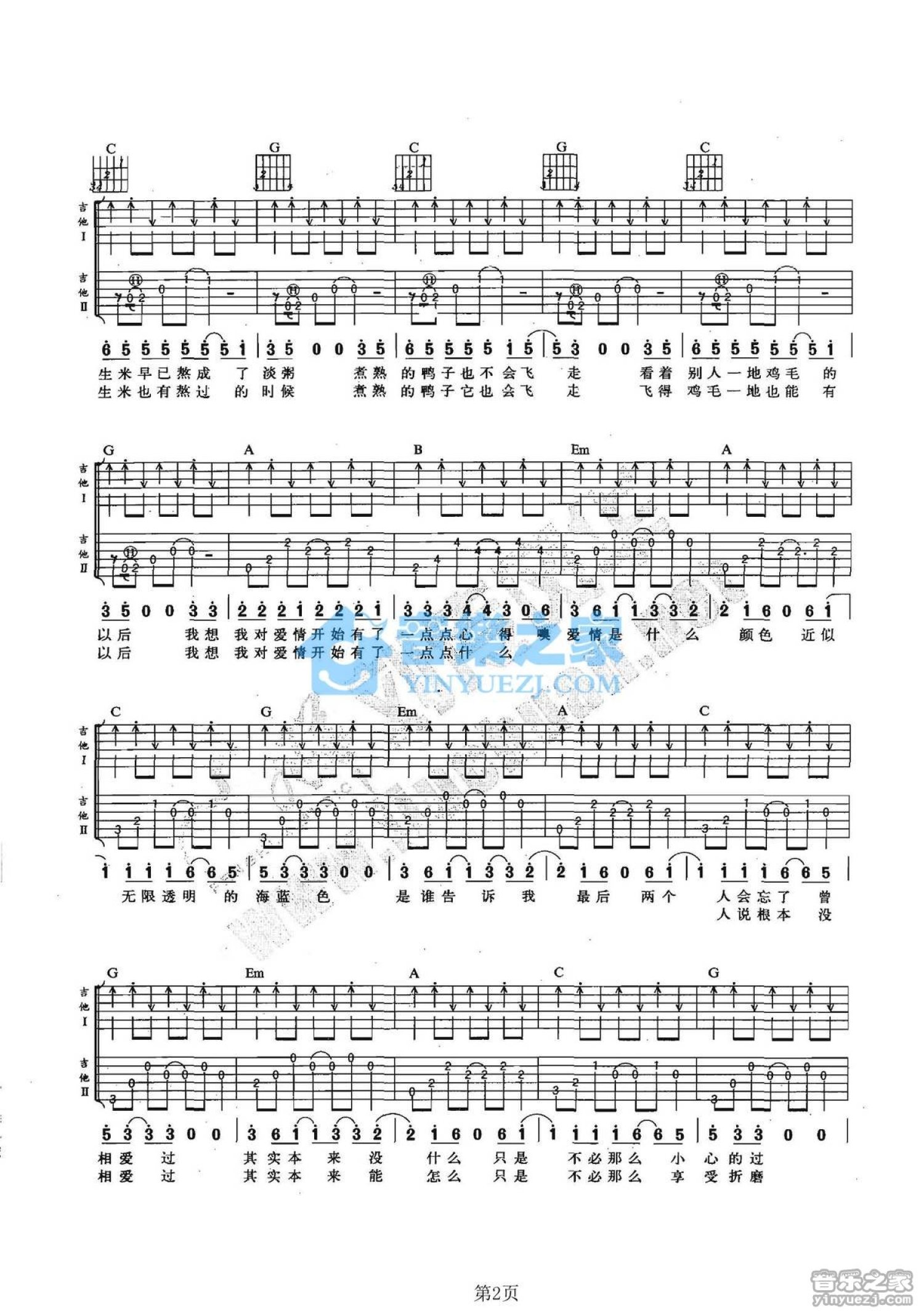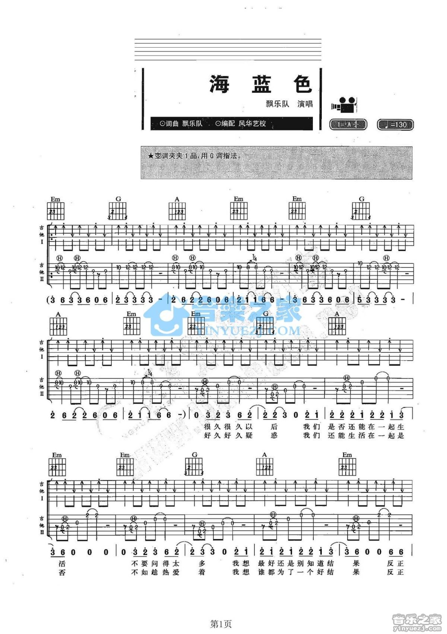 曲谱介绍: G调双吉他版飘乐队《海蓝色》吉他弹唱六线谱