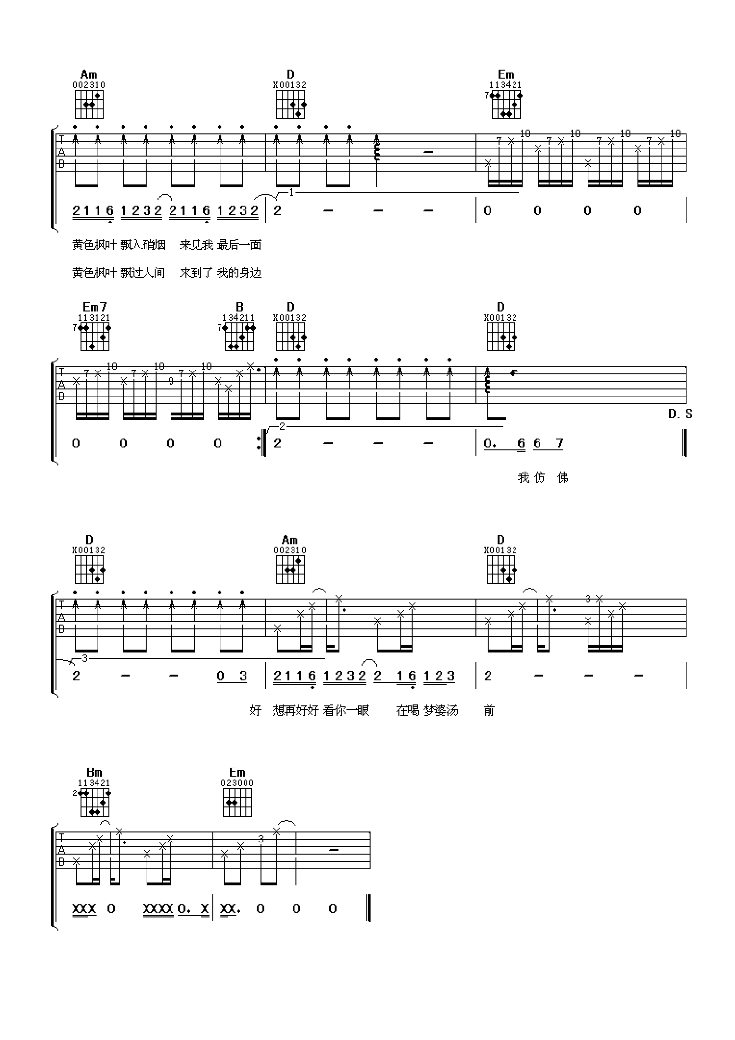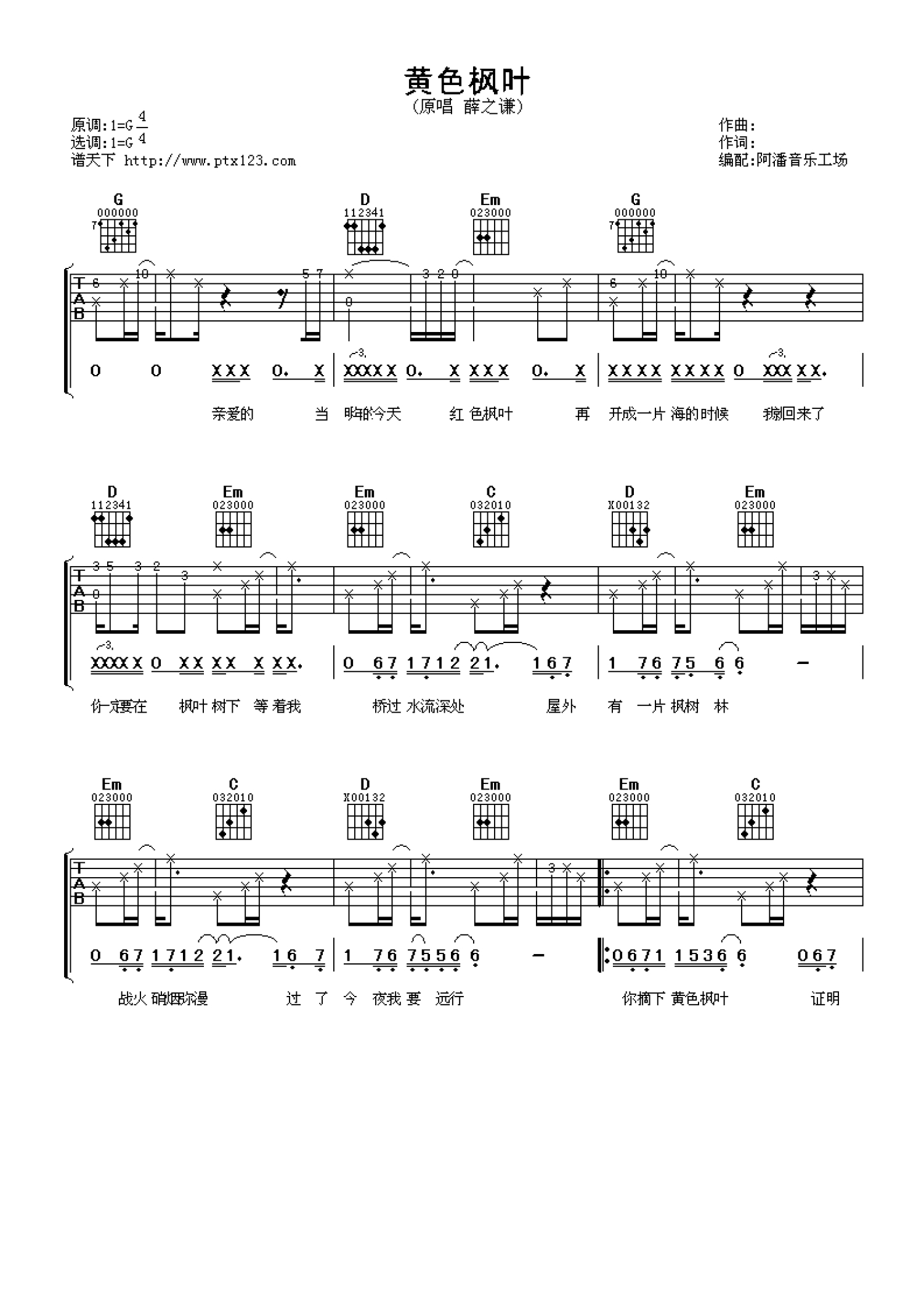 曲谱介绍: G调简单版薛之谦《黄色枫叶》吉他弹唱六线谱