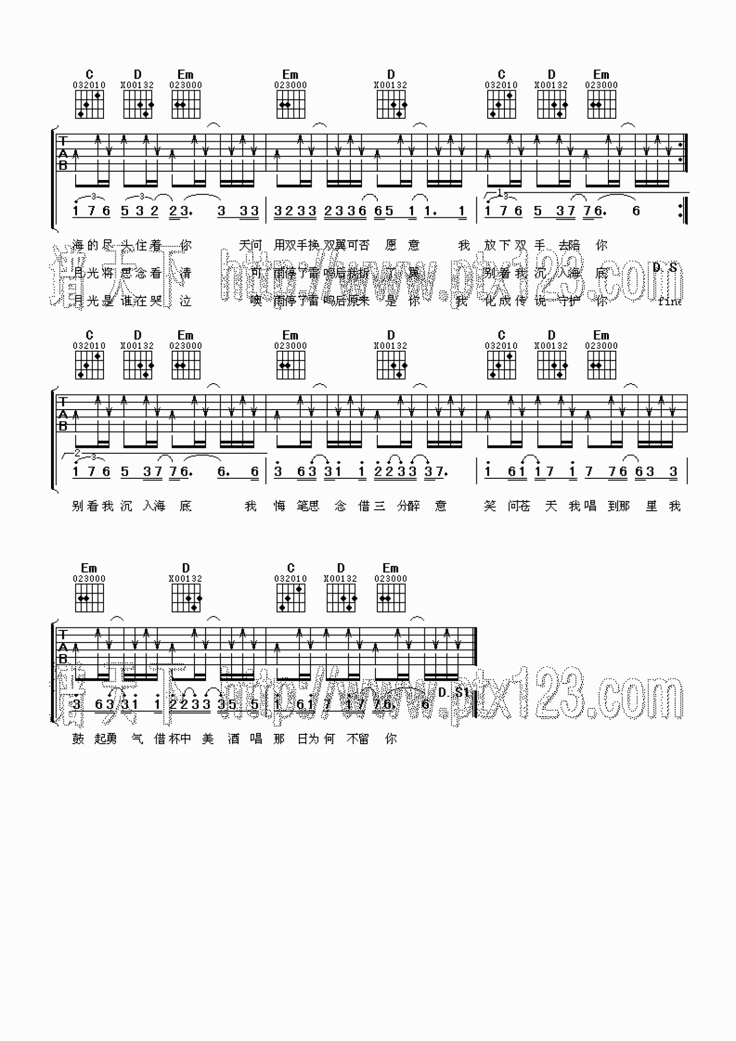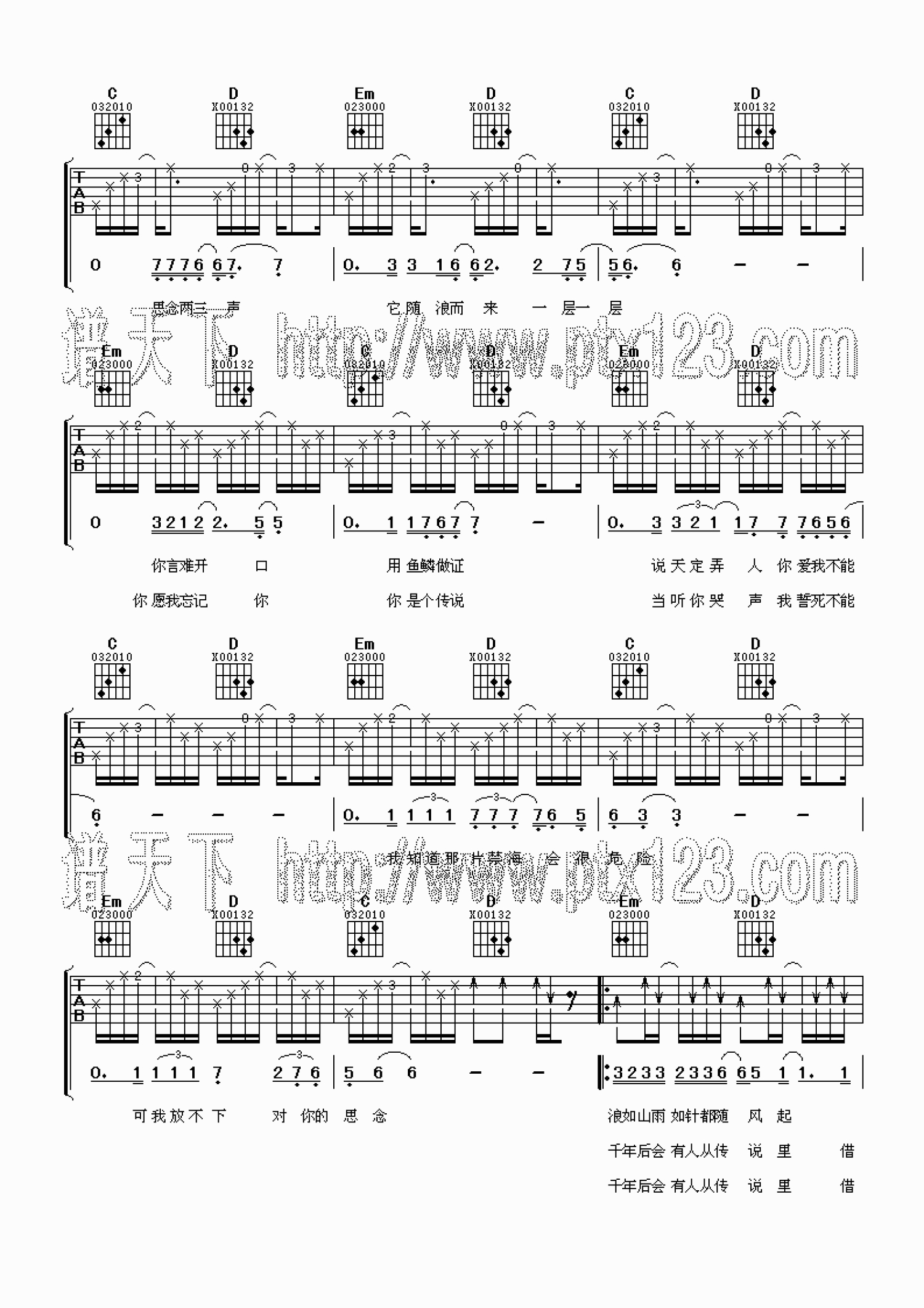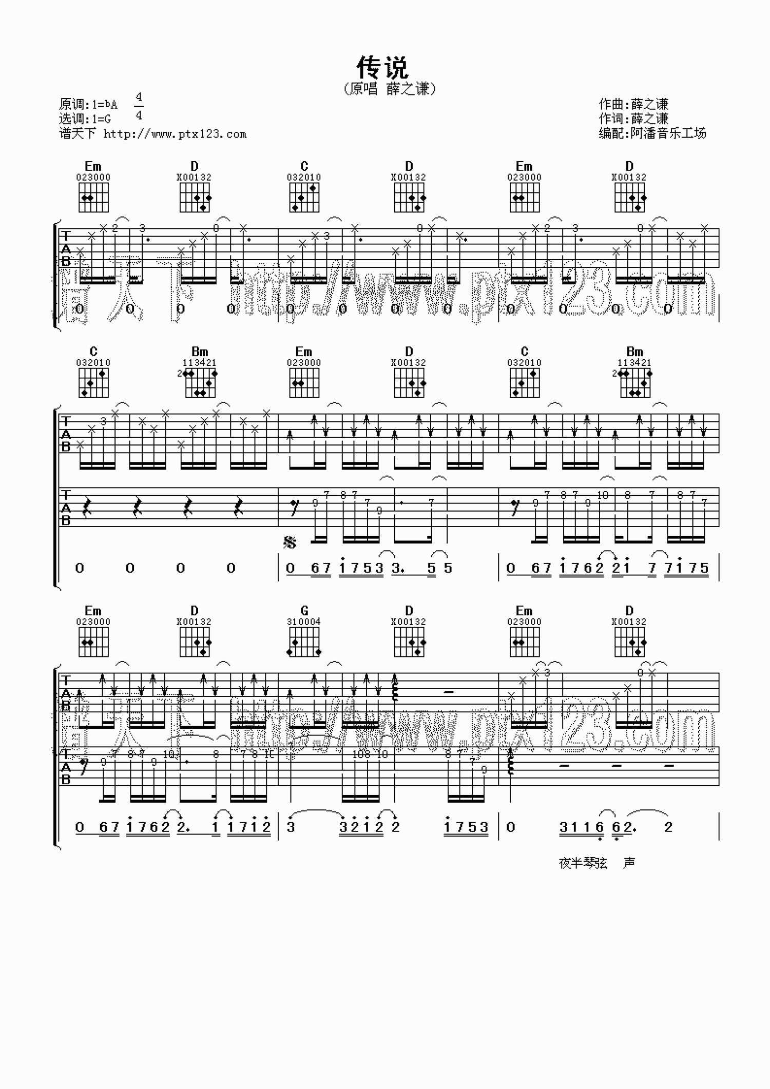 曲谱介绍: G调版薛之谦《传说》吉他弹唱六线谱