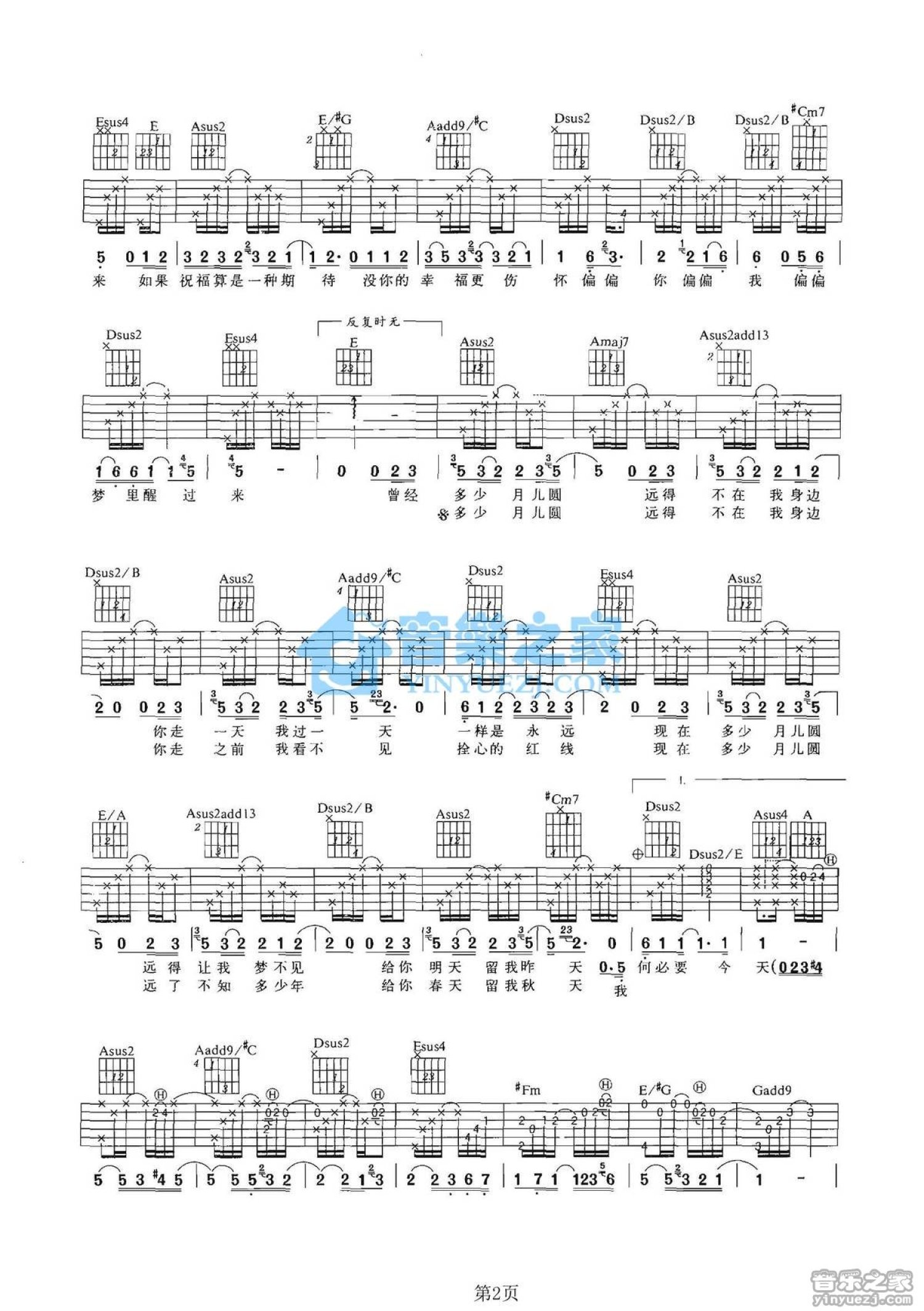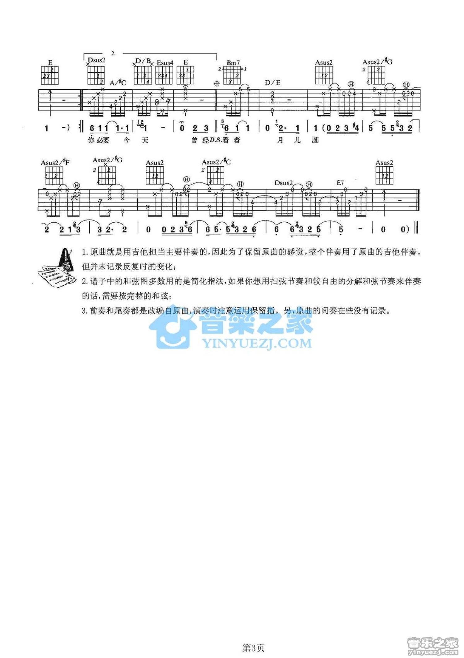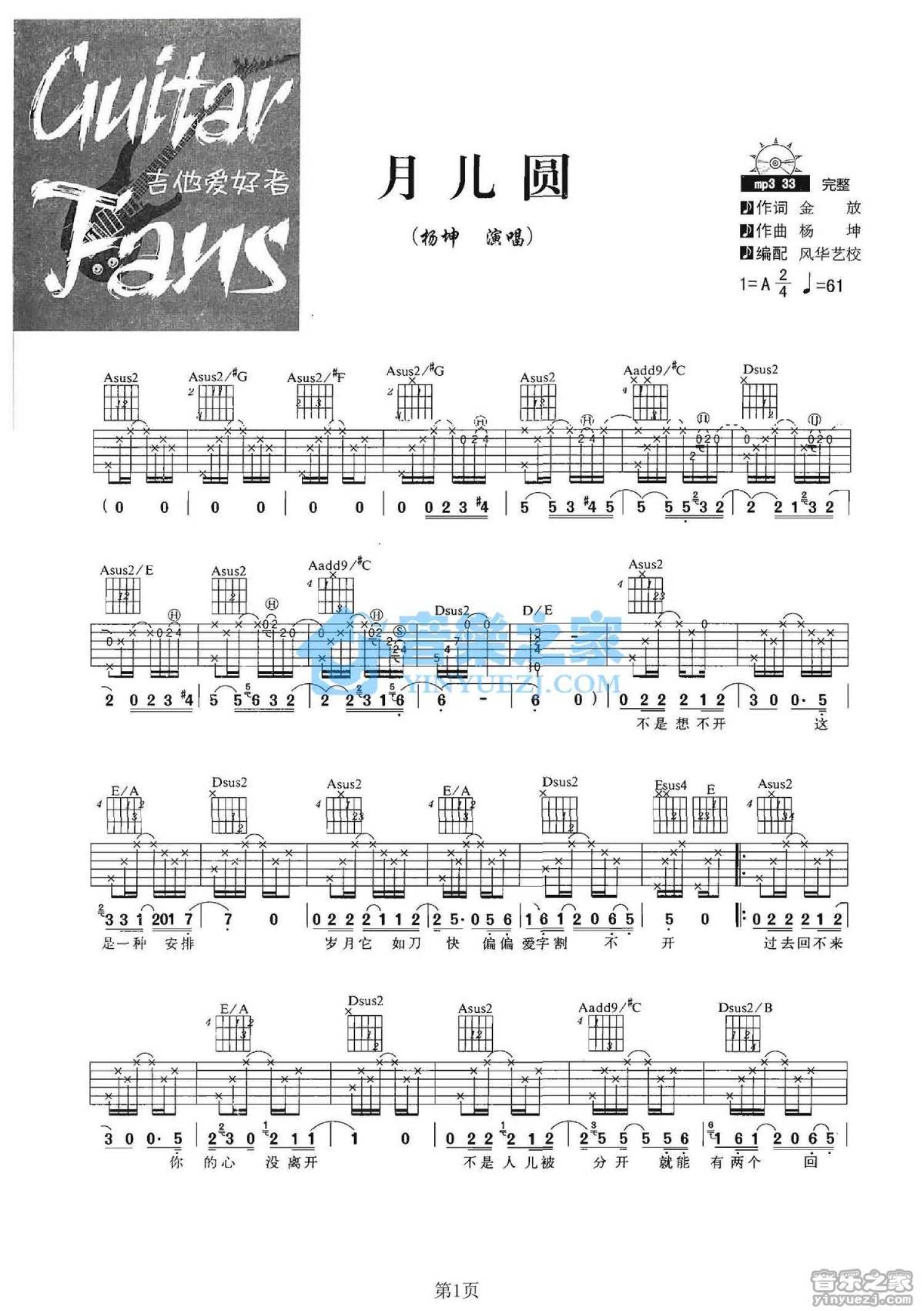 曲谱介绍: A调版杨坤《月儿圆》吉他弹唱六线谱