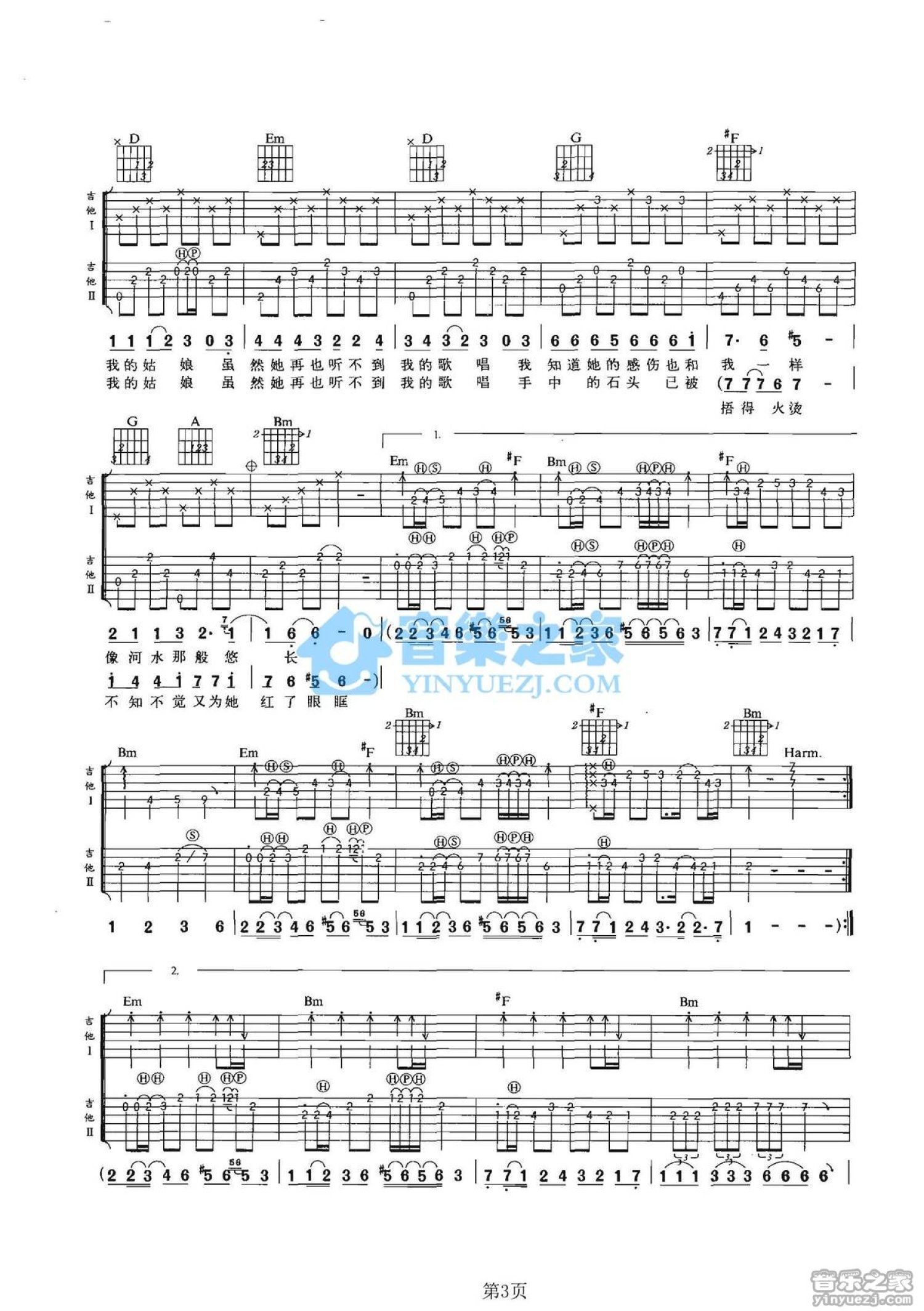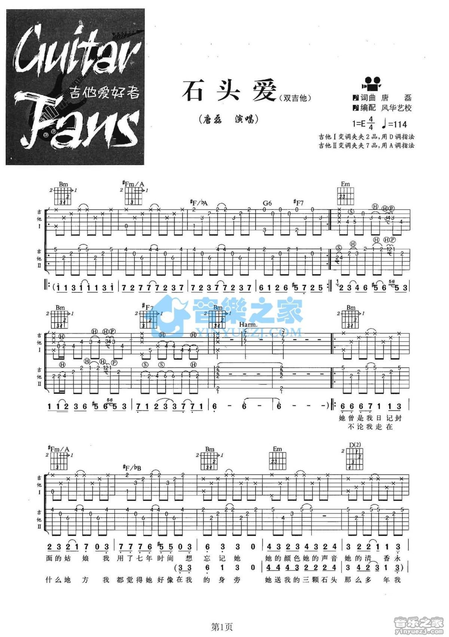 曲谱介绍: D调双吉他版唐磊《石头爱》吉他弹唱六线谱