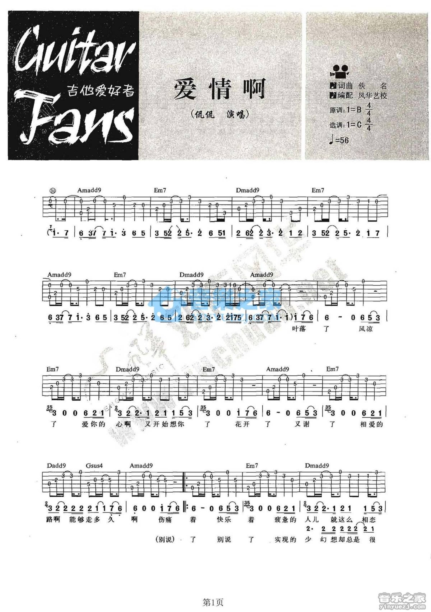 曲谱介绍: C调版《爱情啊》吉他弹唱六线谱