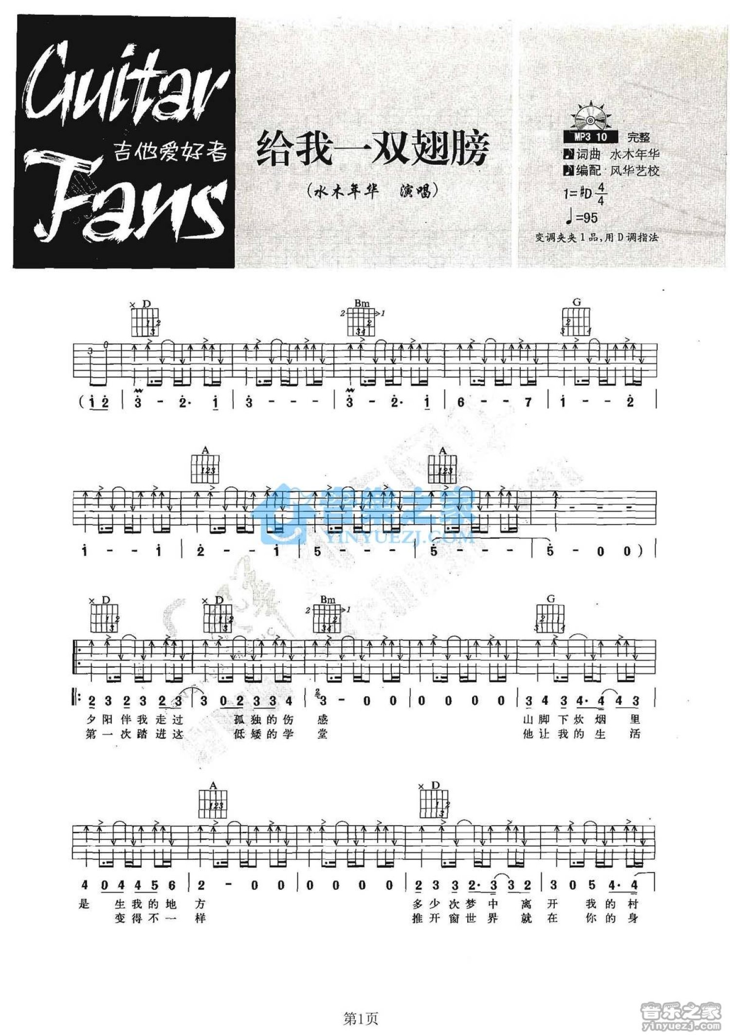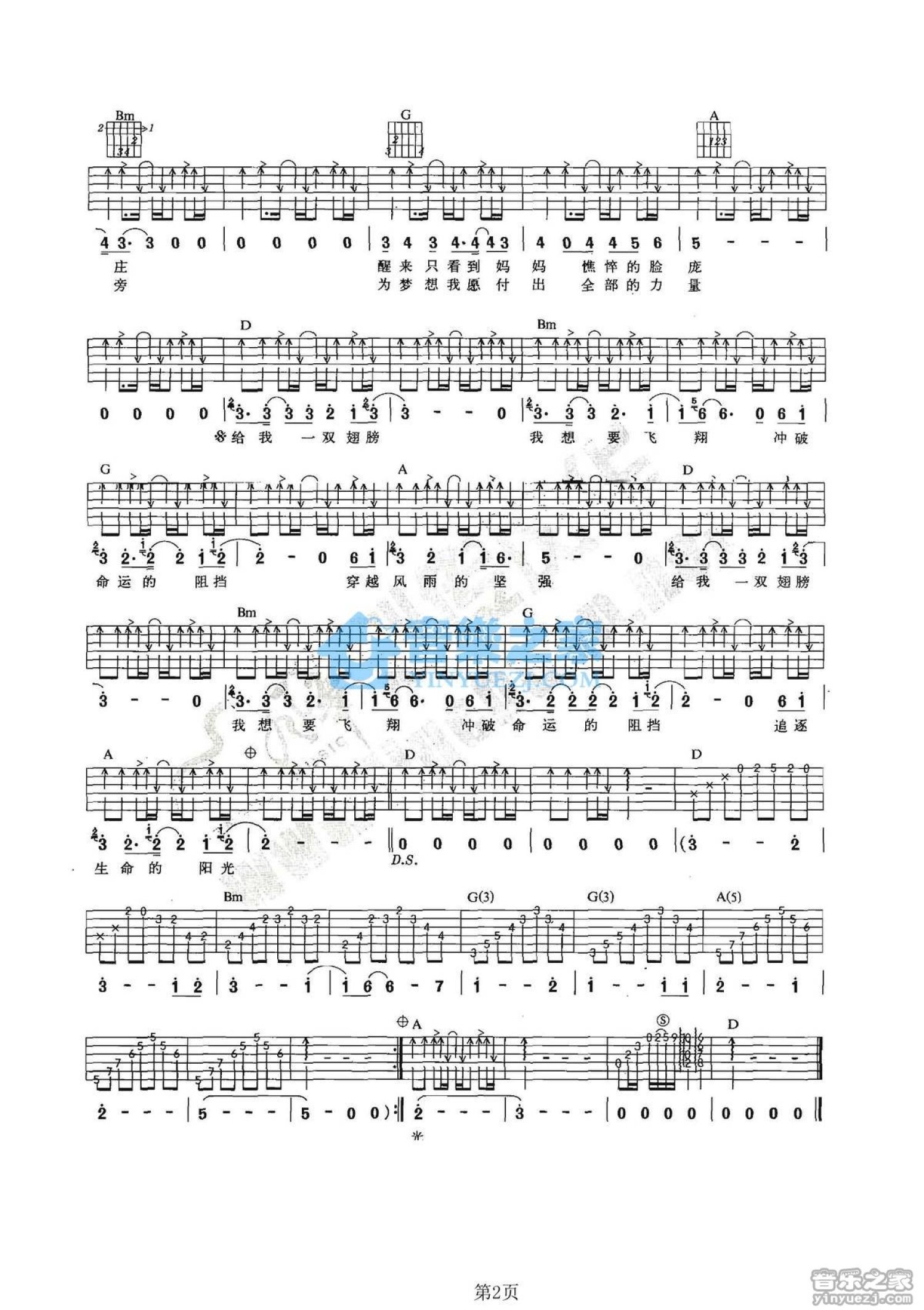 曲谱介绍: D调版《给我一双翅膀》吉他弹唱六线谱