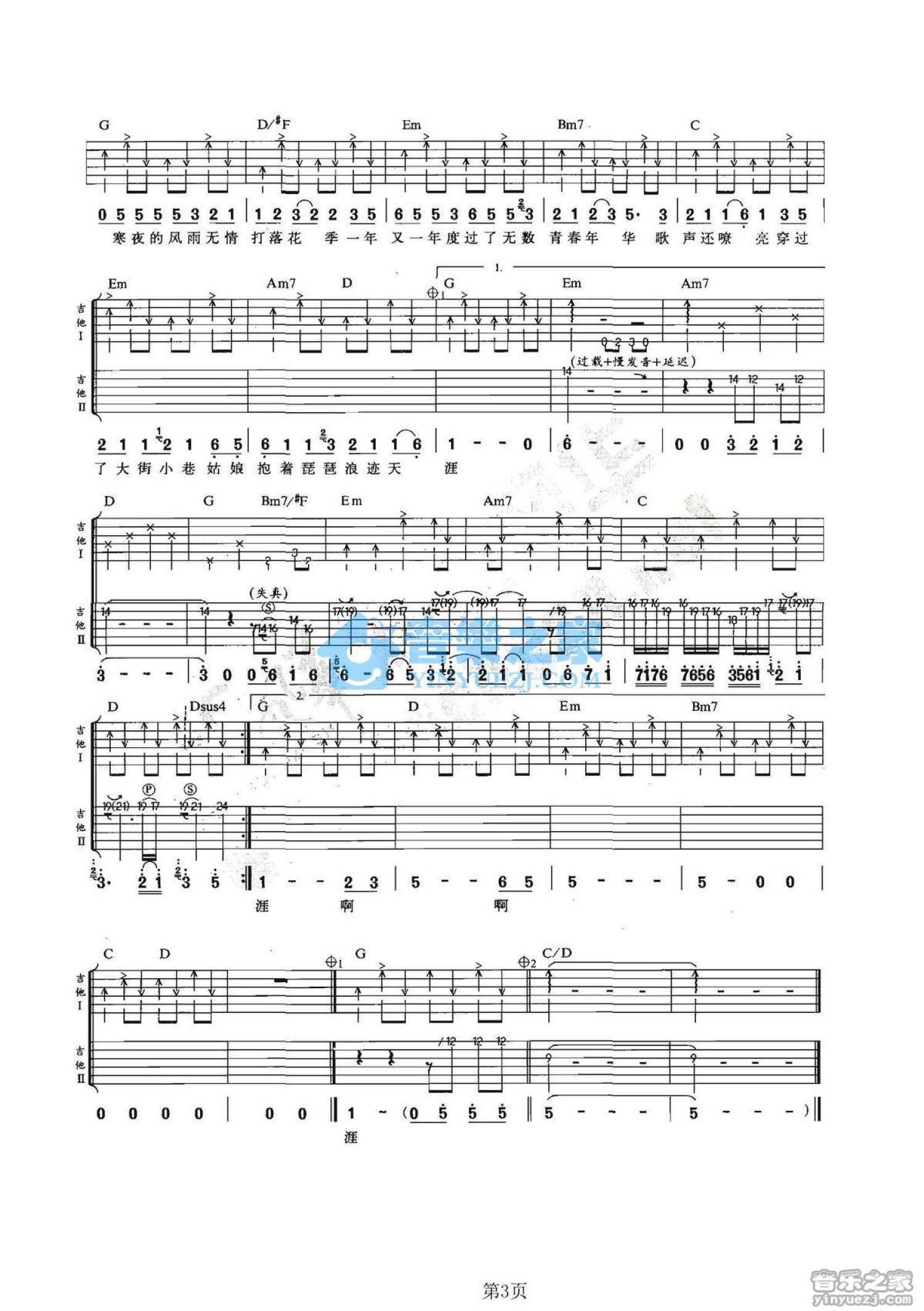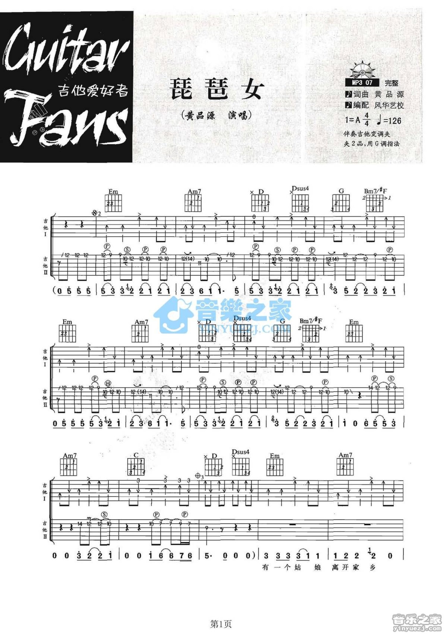 曲谱介绍: G调双吉他版黄品源《琵琶女》吉他弹唱六线谱