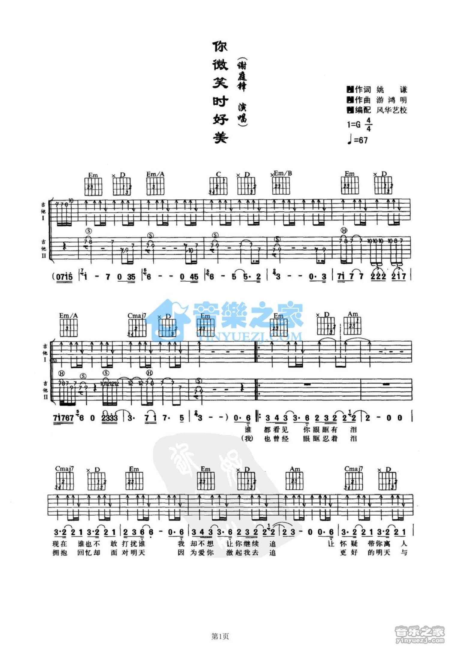 曲谱介绍: G调双吉他版谢霆锋《你微笑时好美》吉他弹唱六线谱
