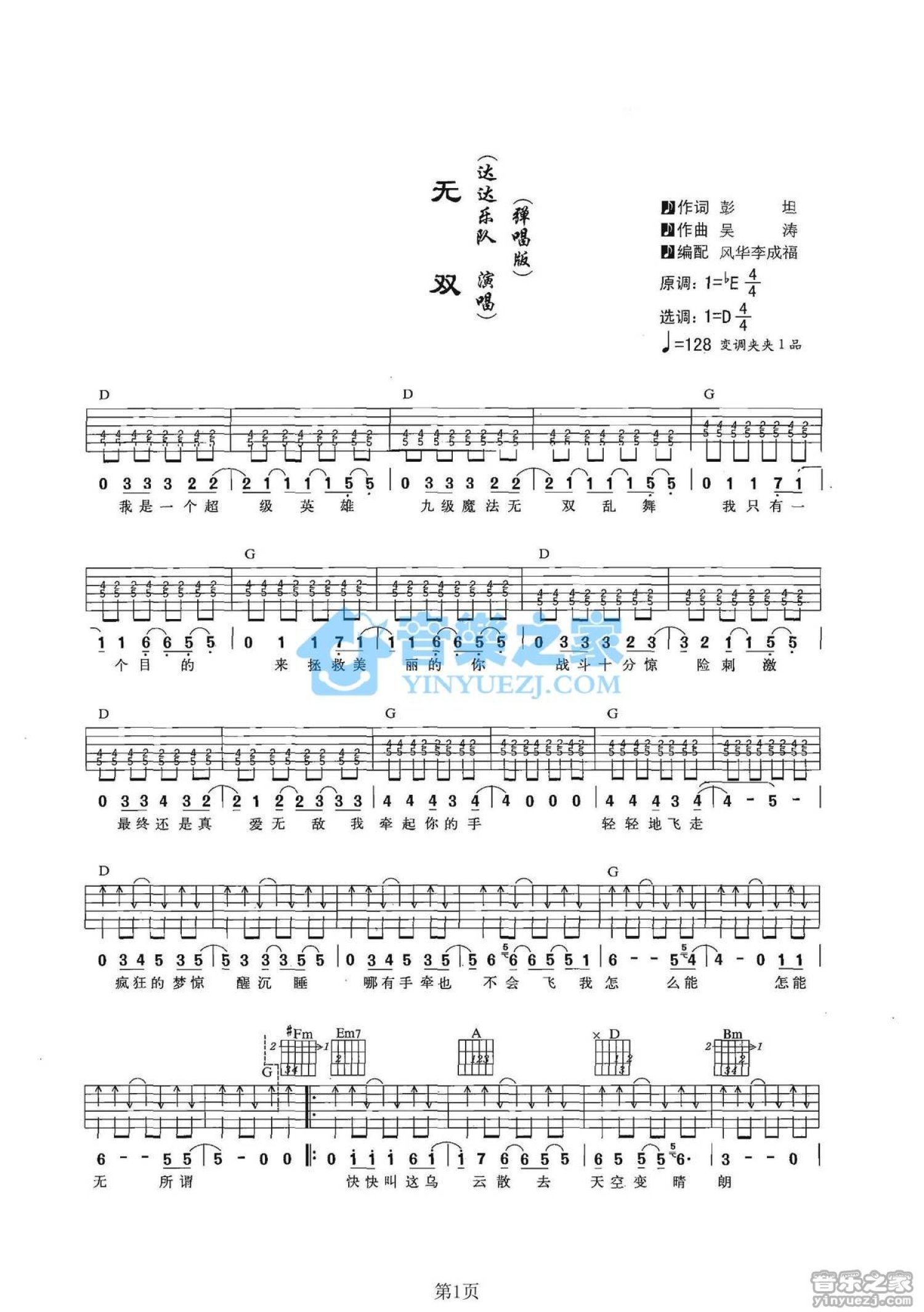 曲谱介绍: D调版达达乐队《无双》吉他弹唱六线谱