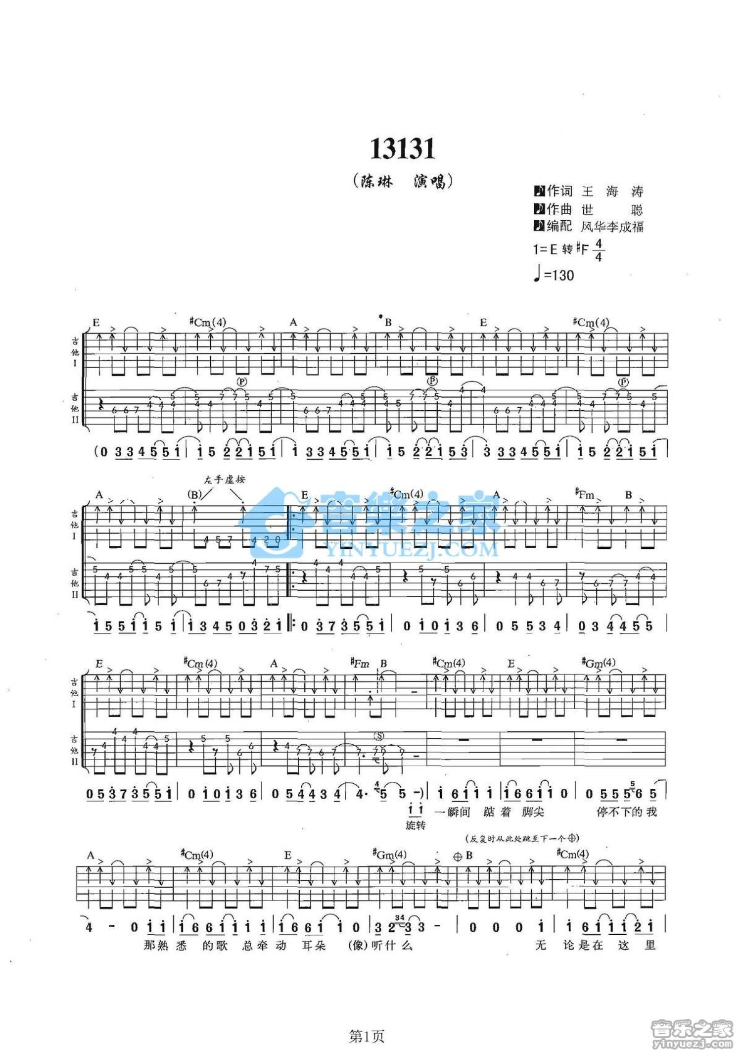 曲谱介绍: E转#F调双吉他版 陈琳《13131》吉他弹唱六线谱