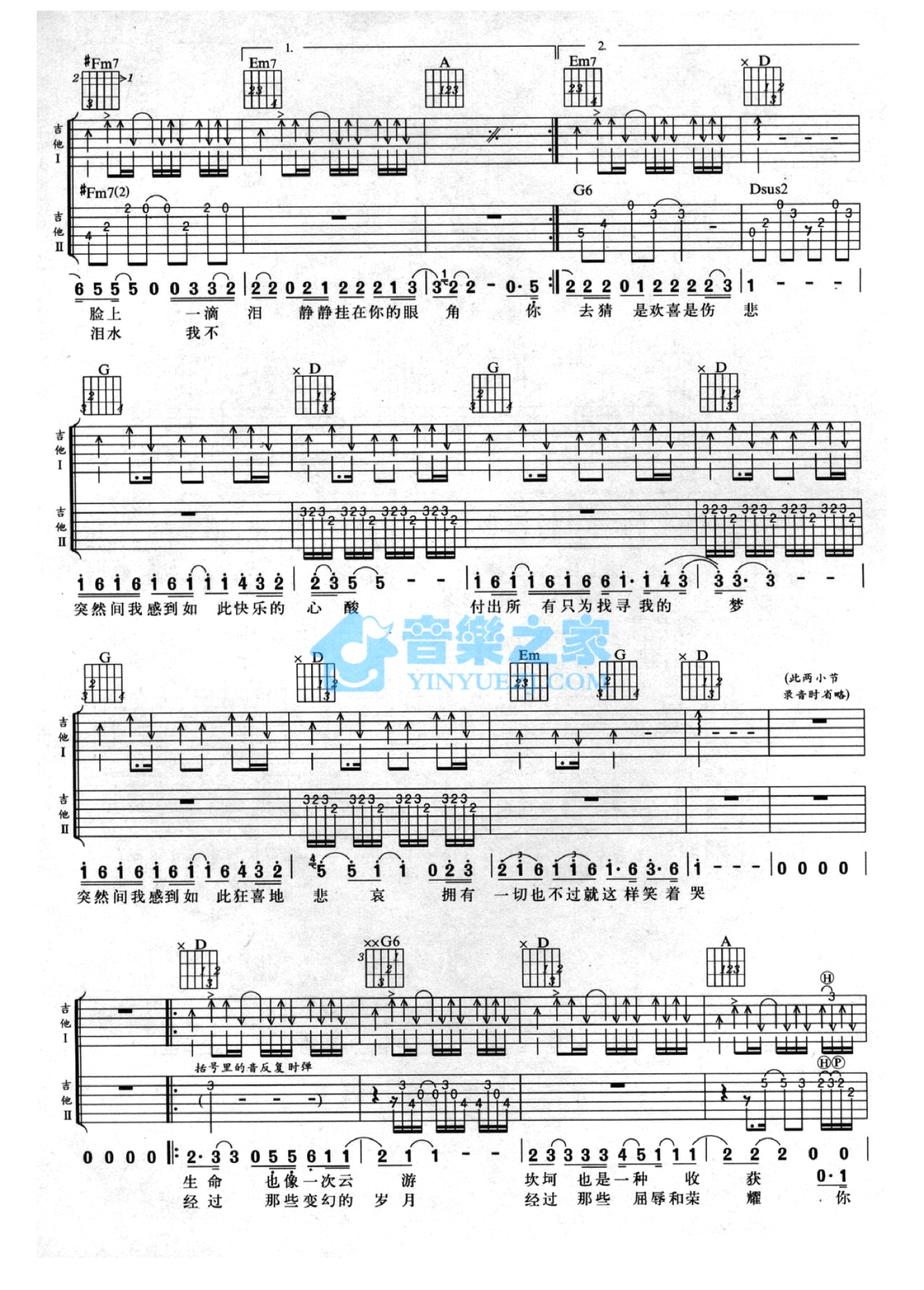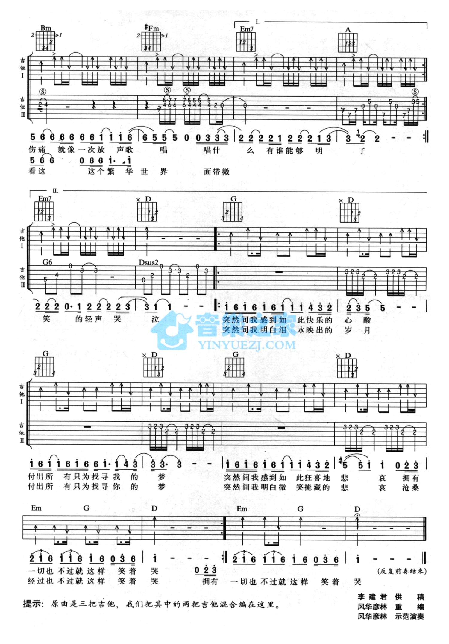 曲谱介绍: D调双吉他版汪峰《笑着哭》吉他弹唱六线谱