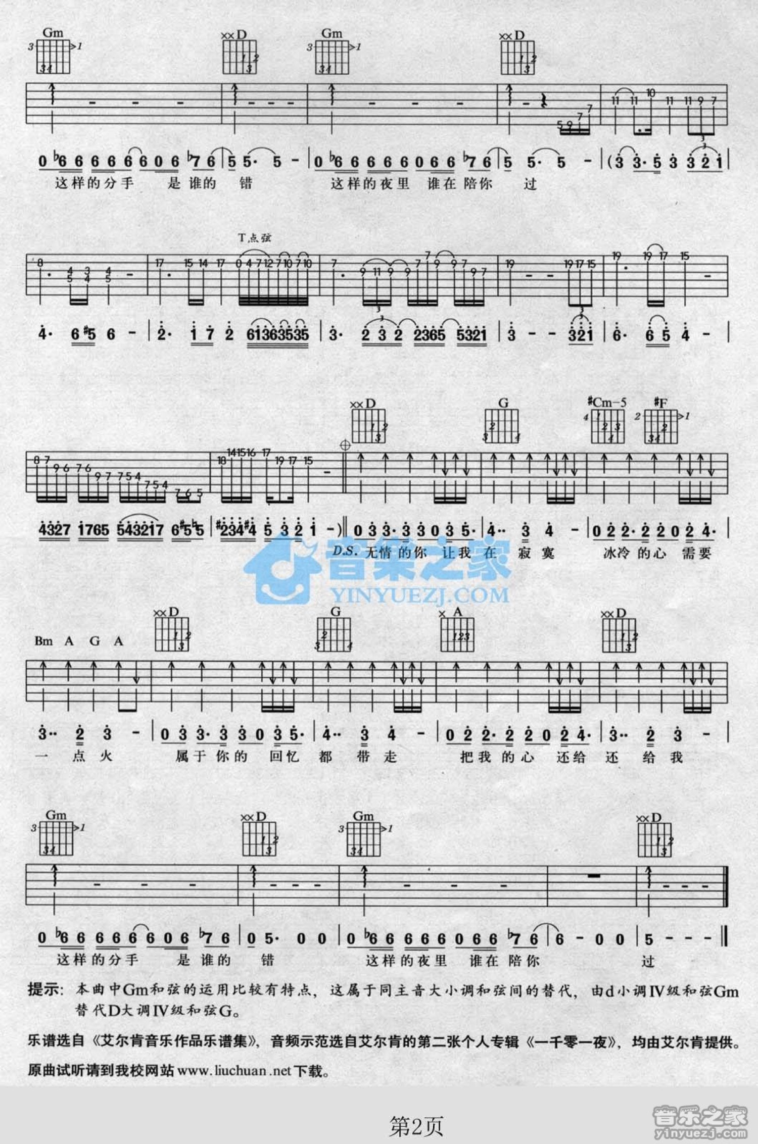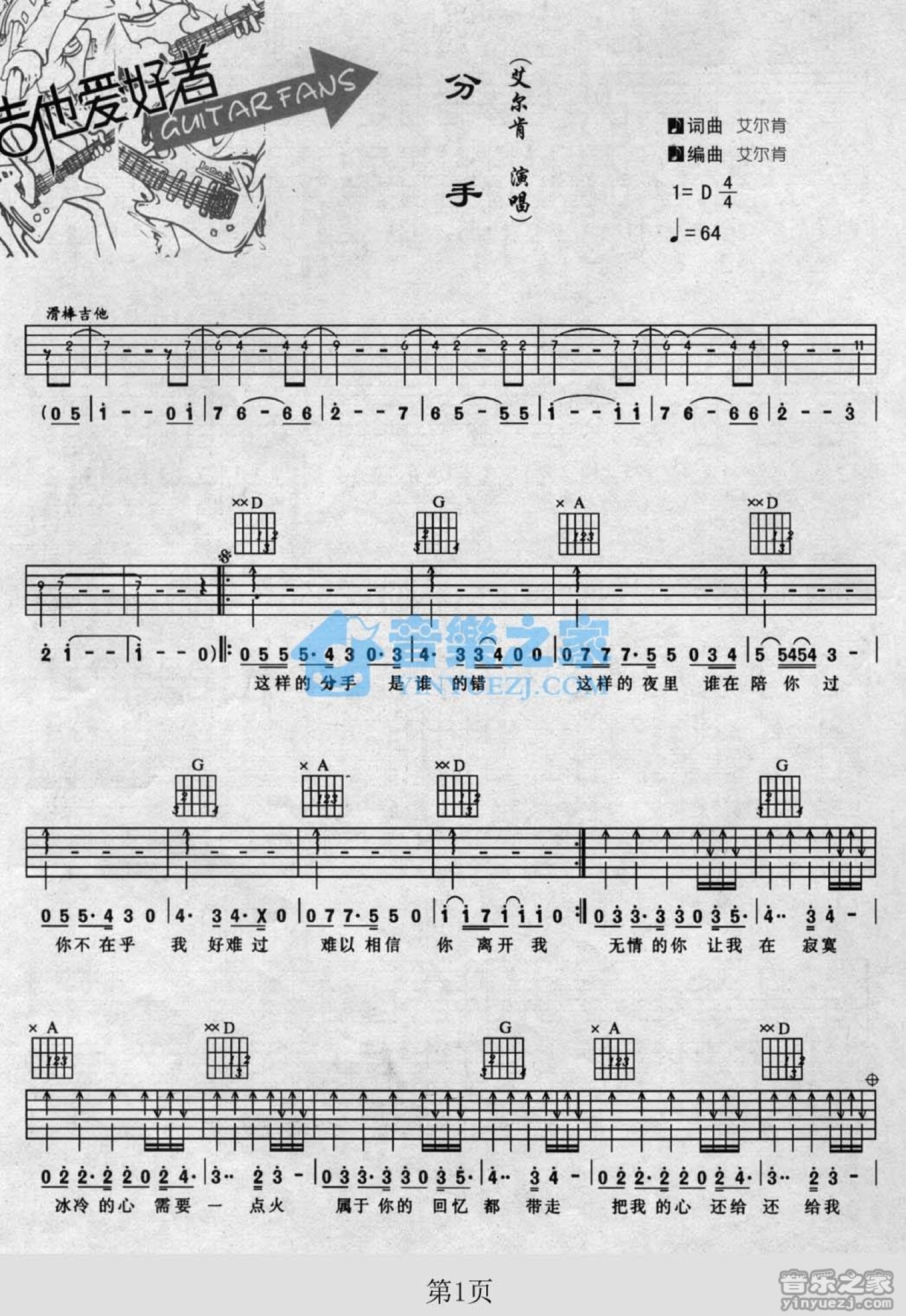 曲谱介绍: D调版艾尔肯《分手》吉他弹唱六线谱