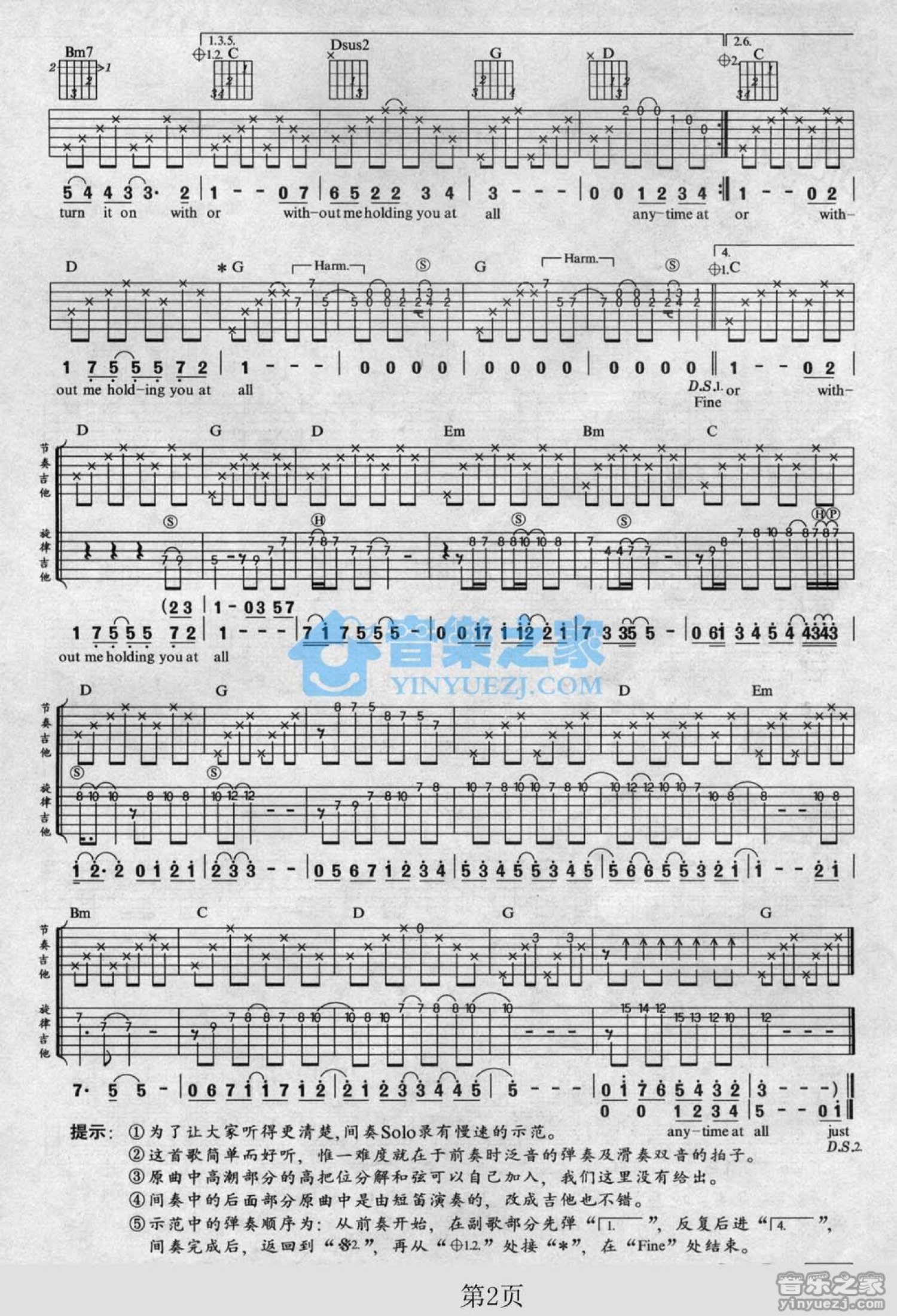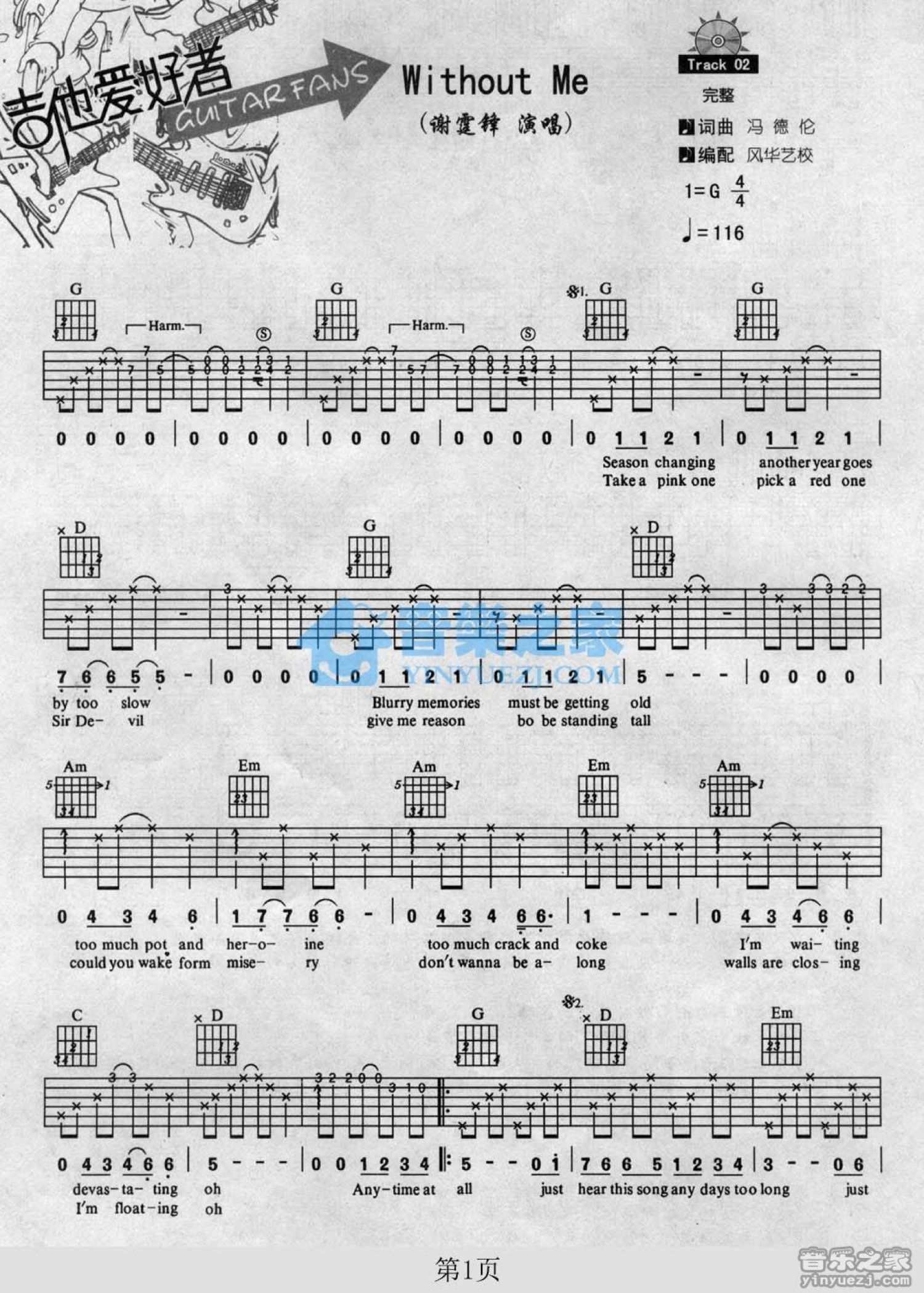 曲谱介绍: G调双吉他版谢霆锋《WithoutMe》吉他弹唱六线谱