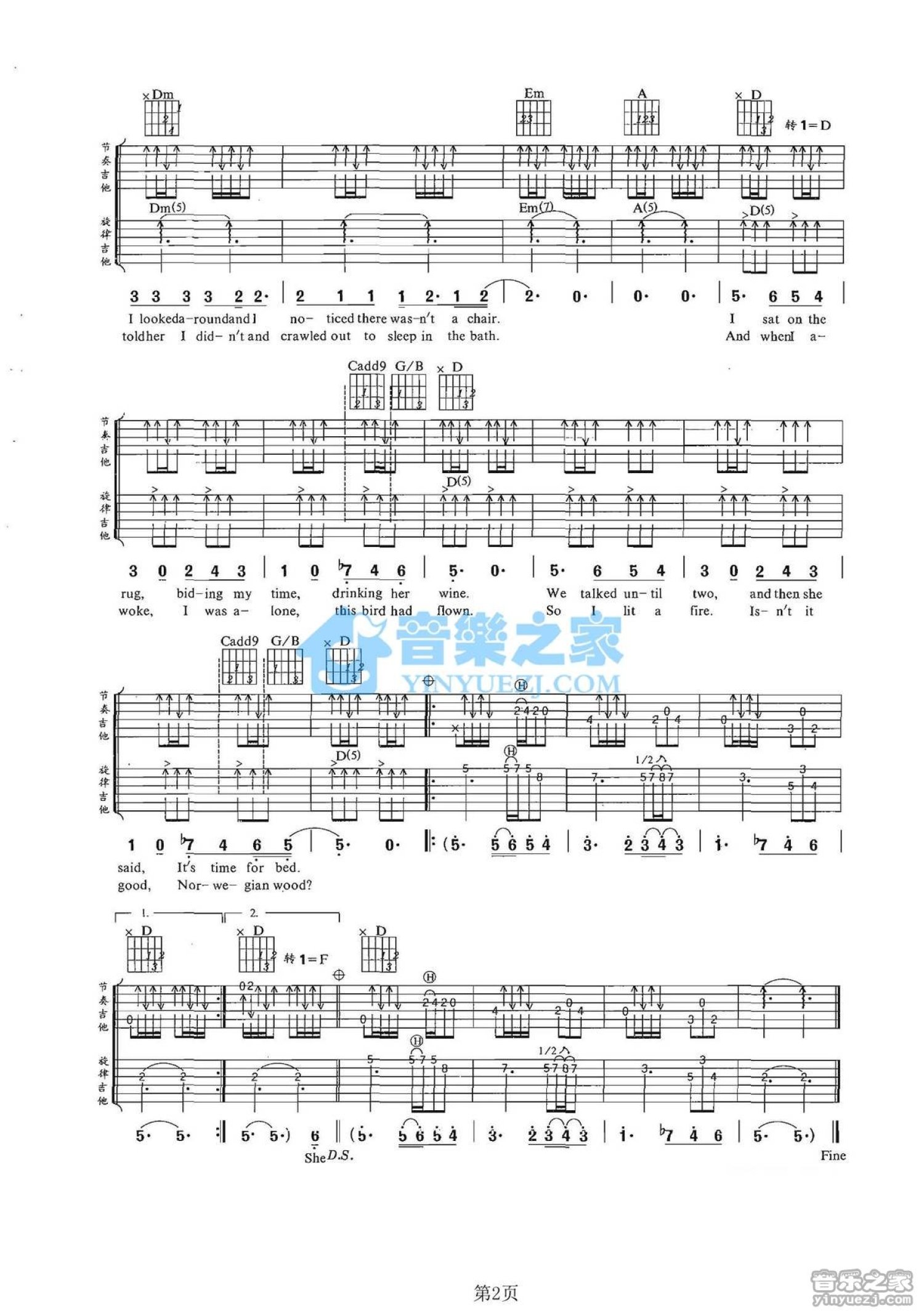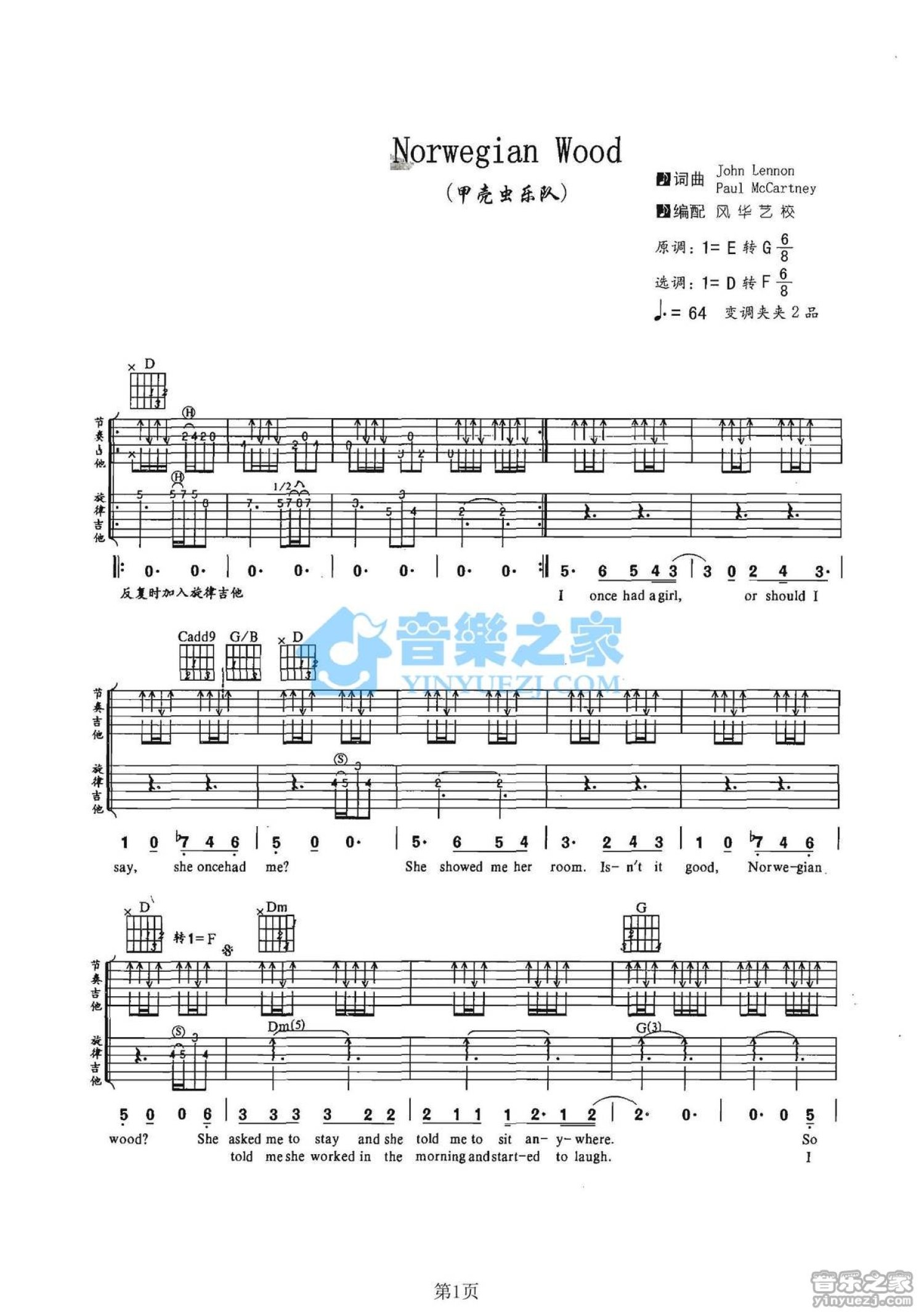 曲谱介绍: D转F调双吉他版TheBeatles《NorwegianWood》吉他弹唱六线谱