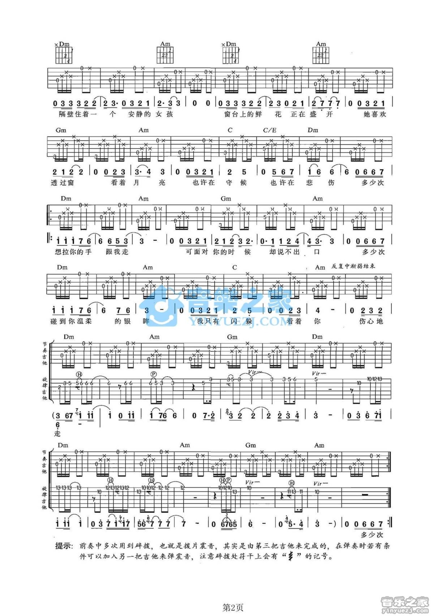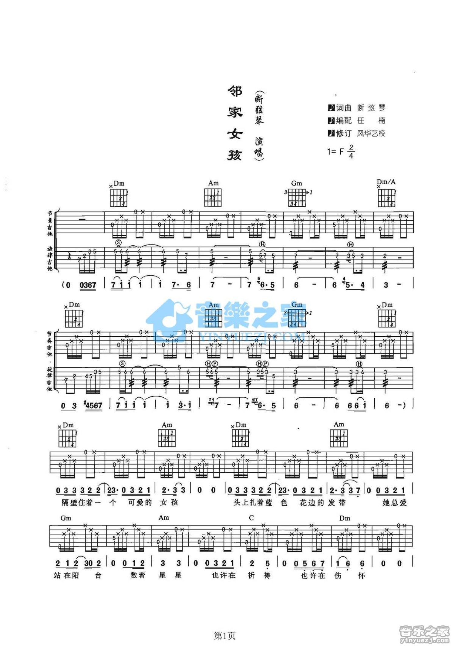曲谱介绍: F调双吉他版断弦琴《邻家女孩》吉他弹唱六线谱