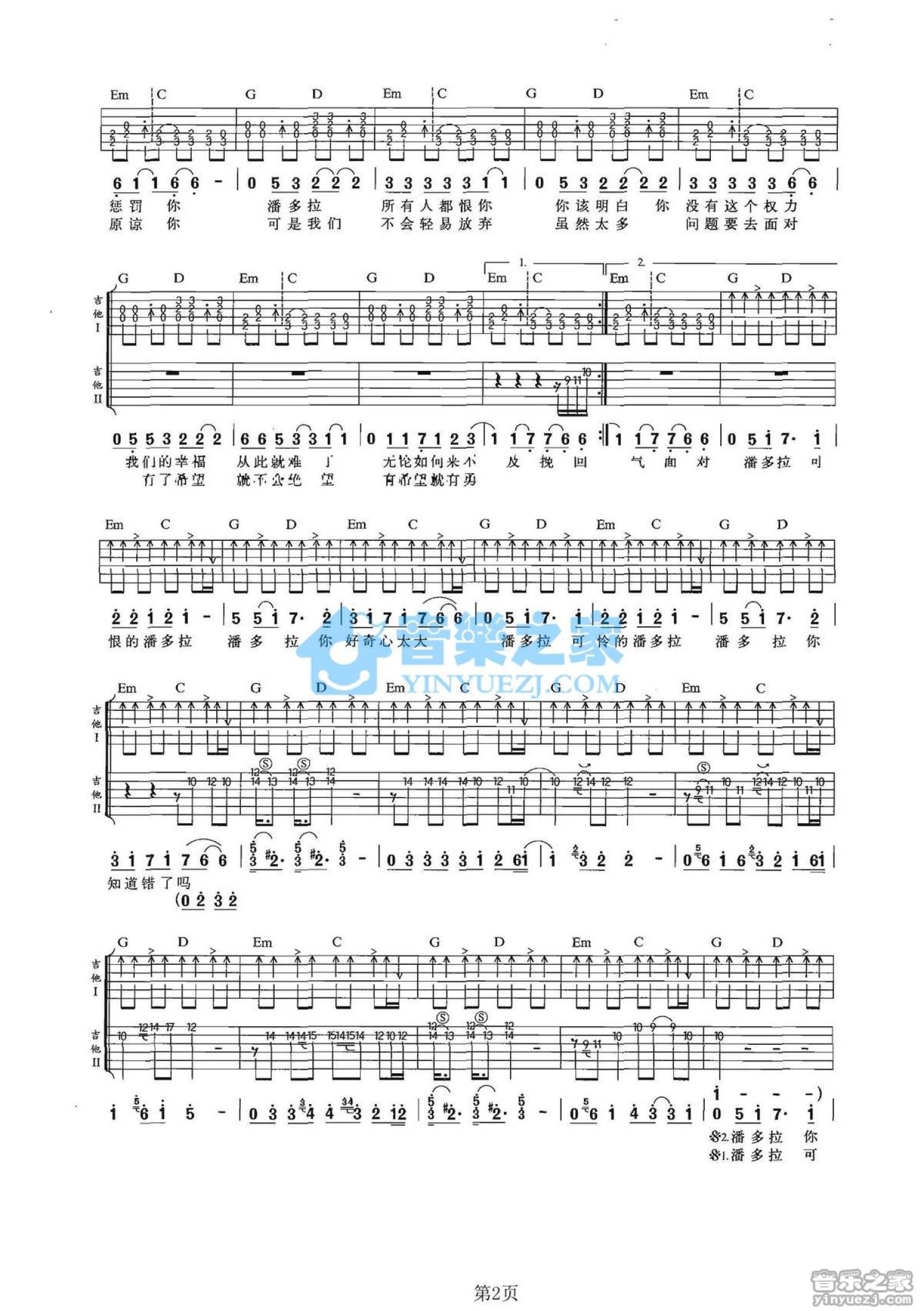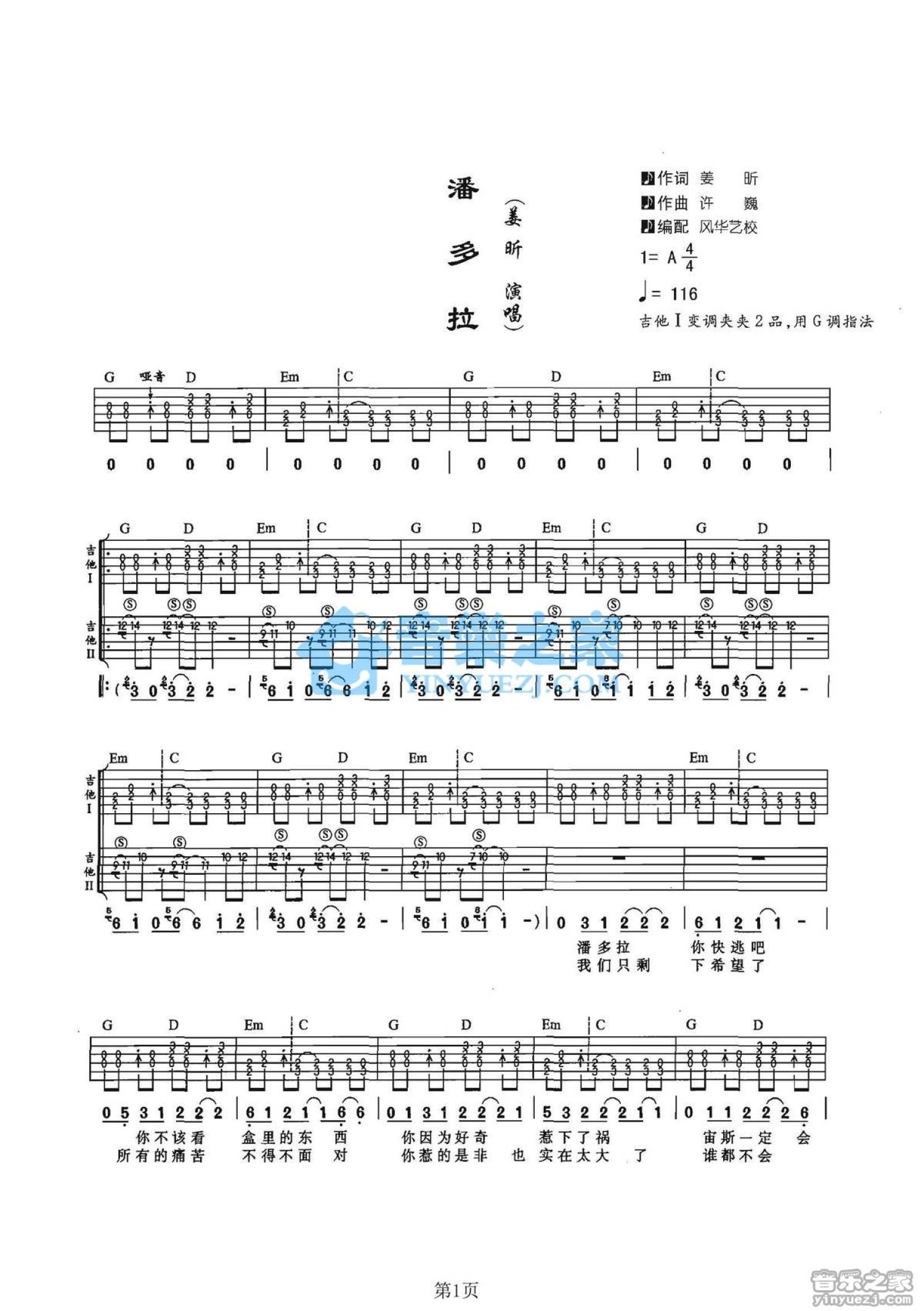 曲谱介绍: G调双吉他版姜昕《潘朵拉》吉他弹唱六线谱