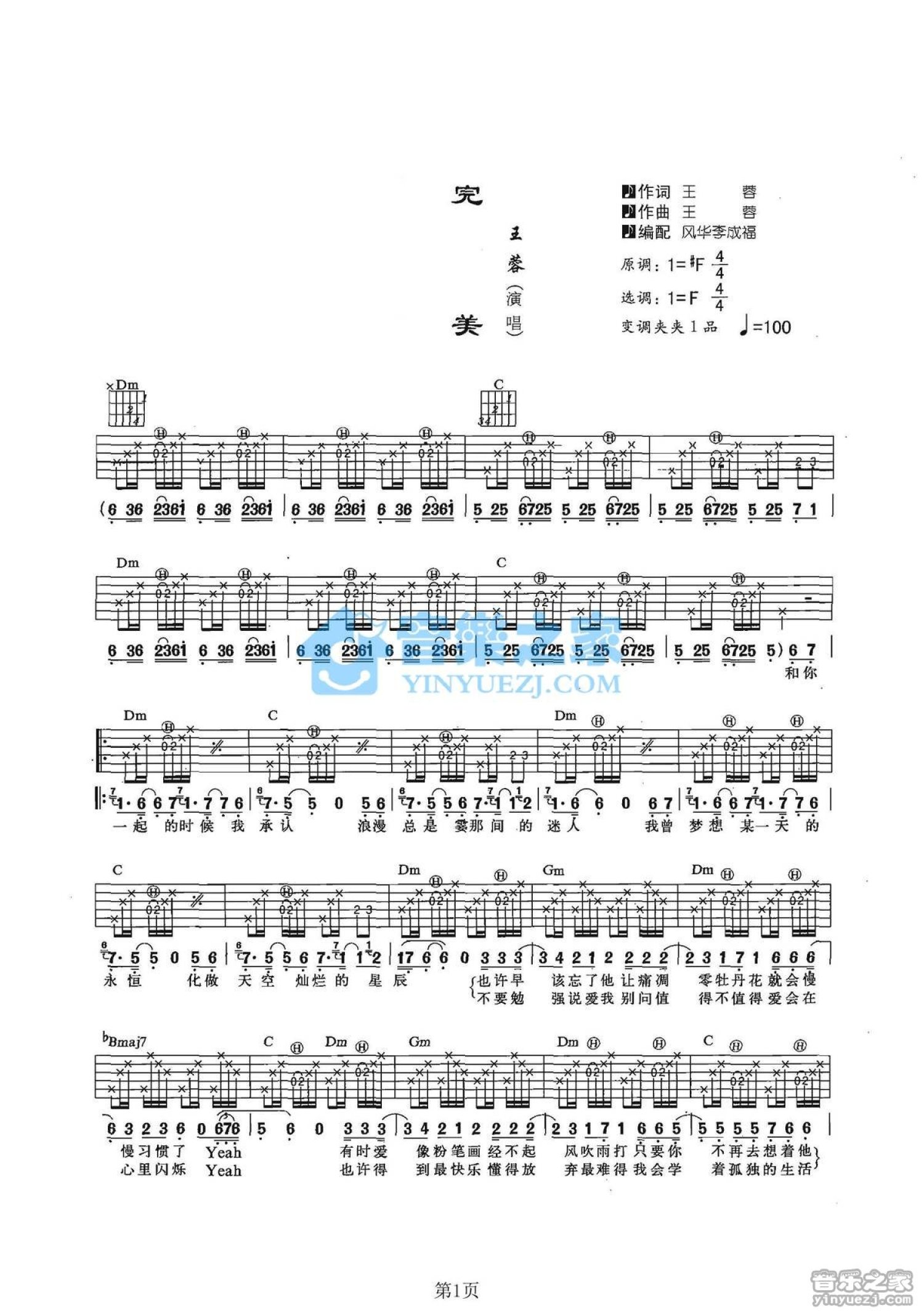 曲谱介绍: F调版王蓉《完美》吉他弹唱六线谱
