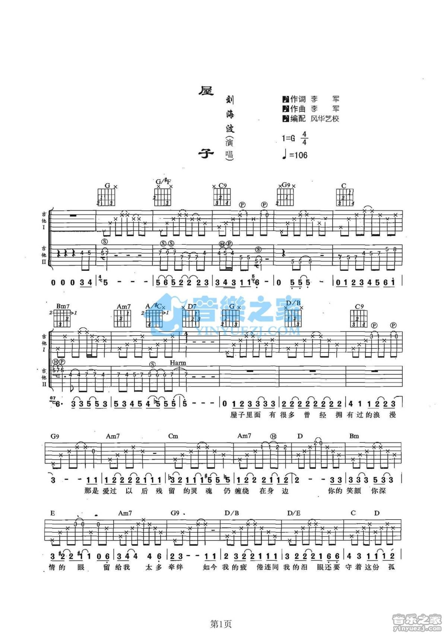 屋子吉他谱 - 刘海波 - G调吉他弹唱谱 - 双吉他版