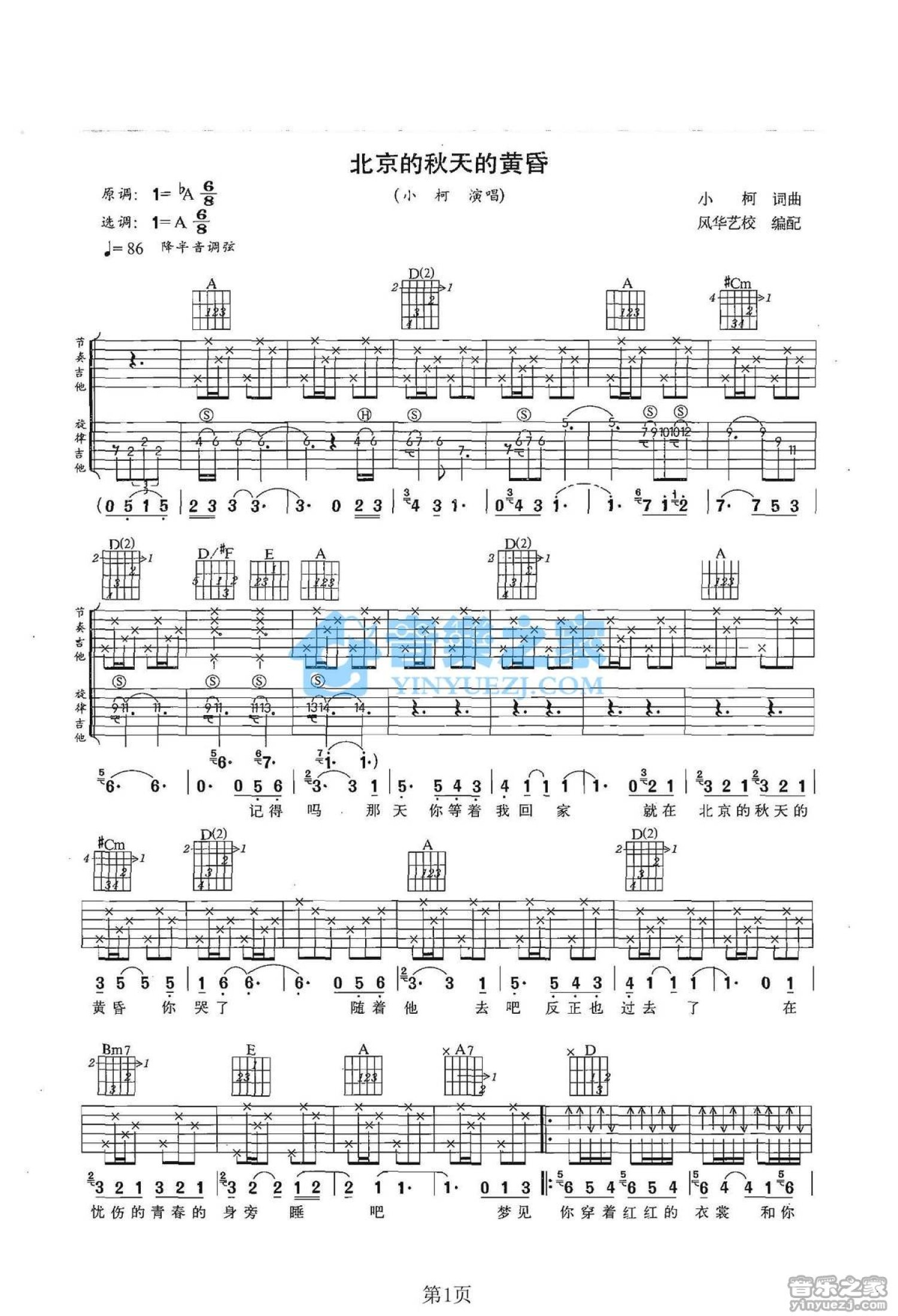 北京秋天的黄昏吉他谱 - 小柯 - A调吉他弹唱谱 - 双吉他版