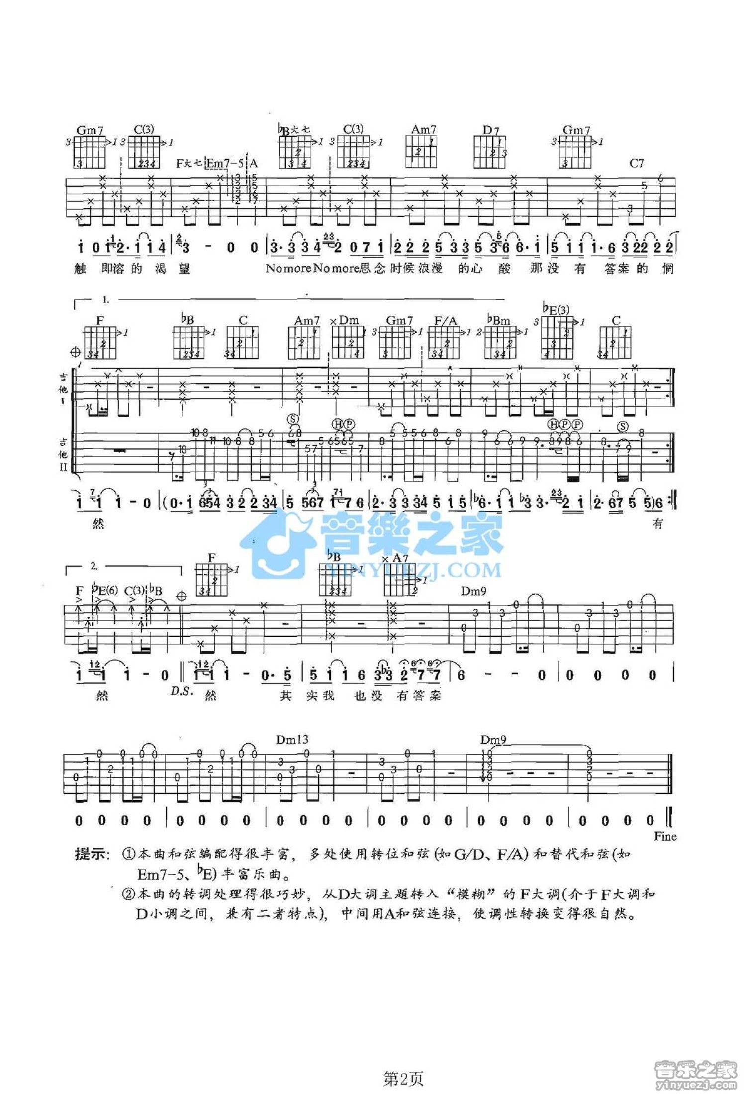曲谱介绍: F转D调双吉他版那英《NoMore》吉他弹唱六线谱