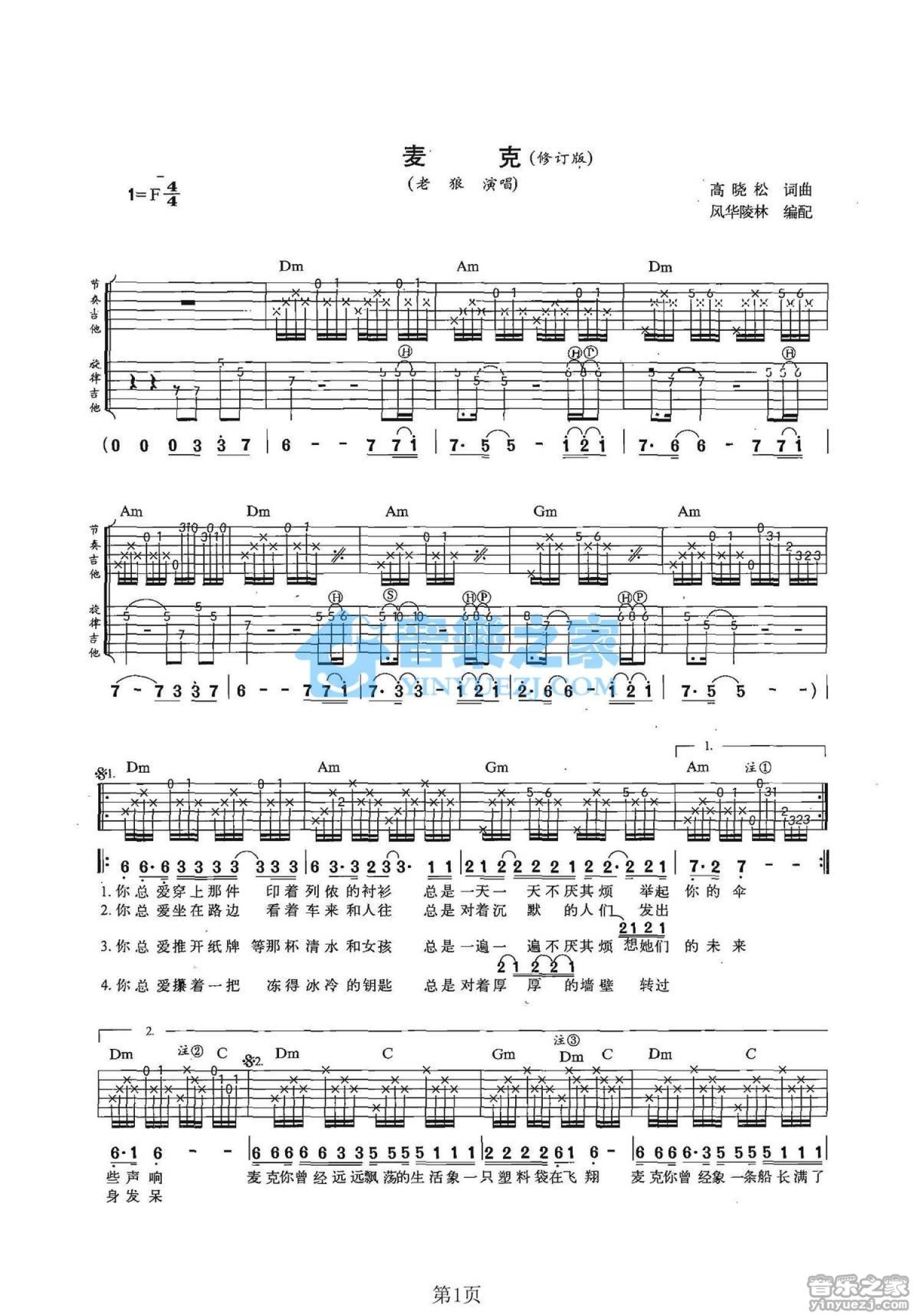 曲谱介绍: F调双吉他修订版老狼《麦克》吉他弹唱六线谱