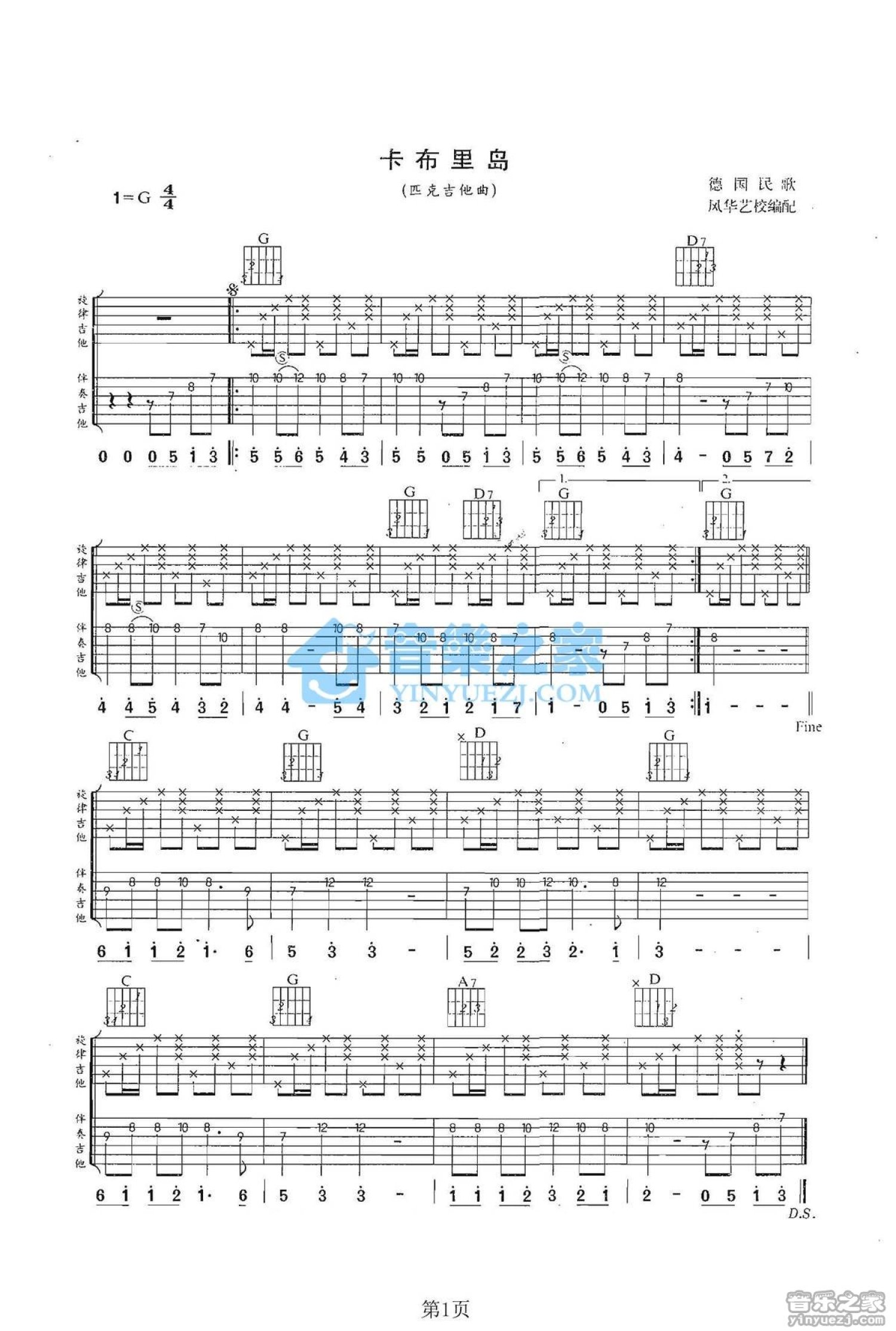 曲谱介绍: G调版德国民歌《卡布里岛》吉他弹唱六线谱