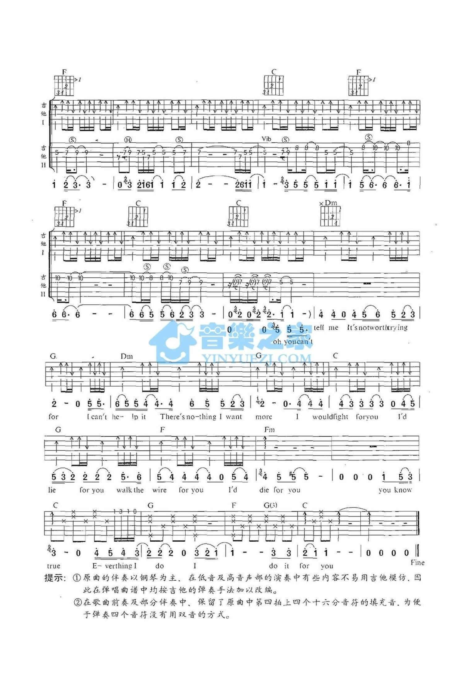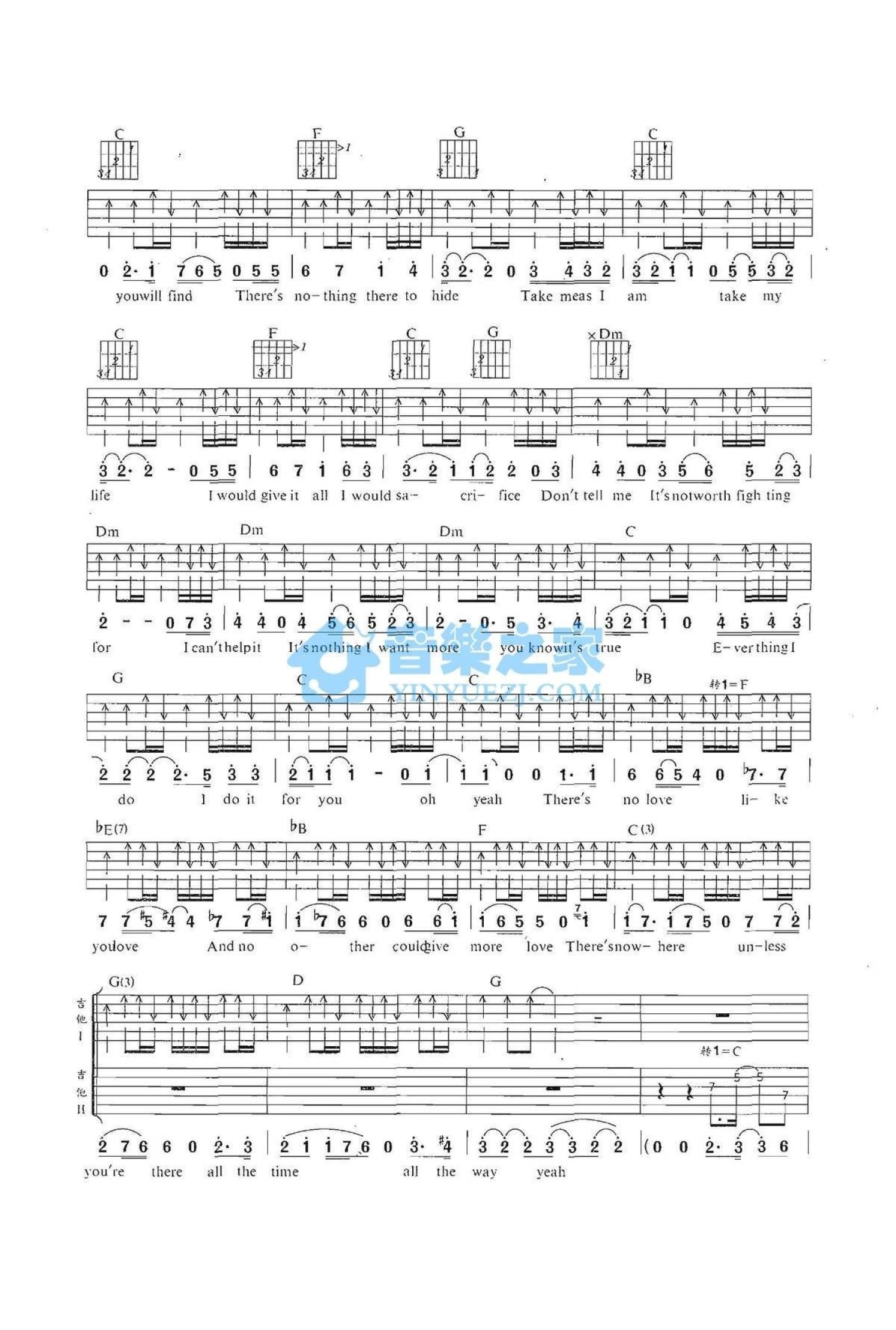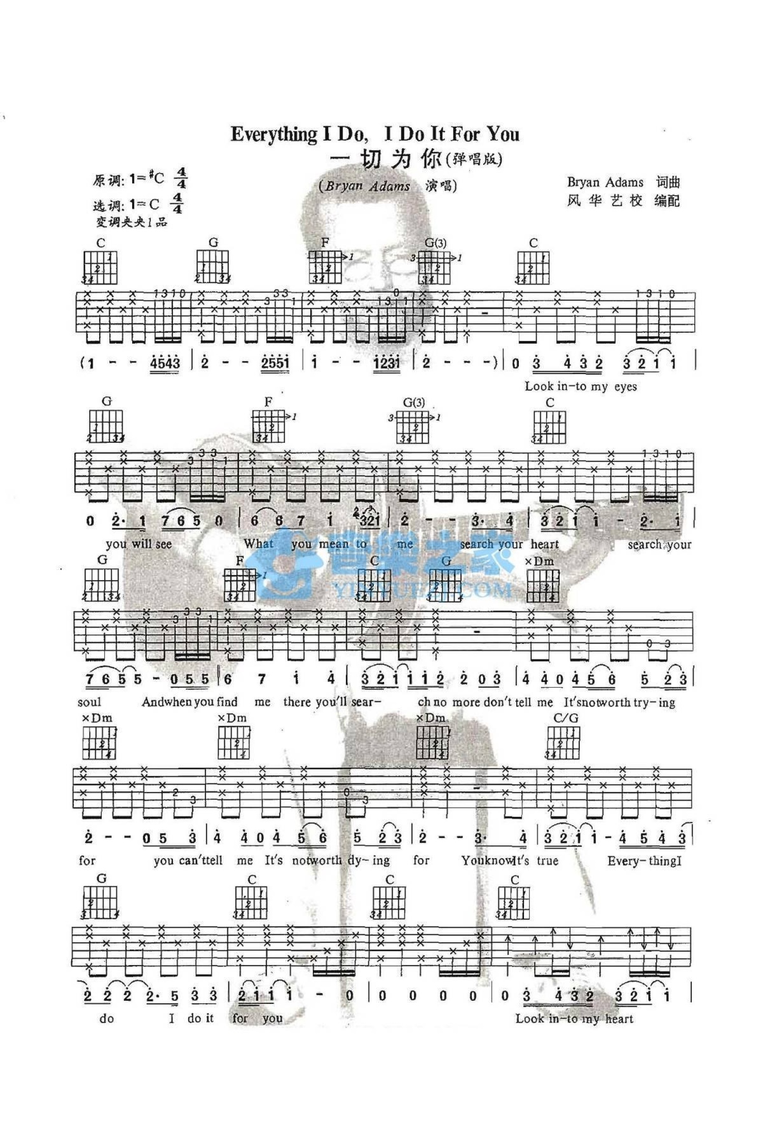 曲谱介绍: C调《EverythingIDoIDoItForYou》吉他弹唱六线谱