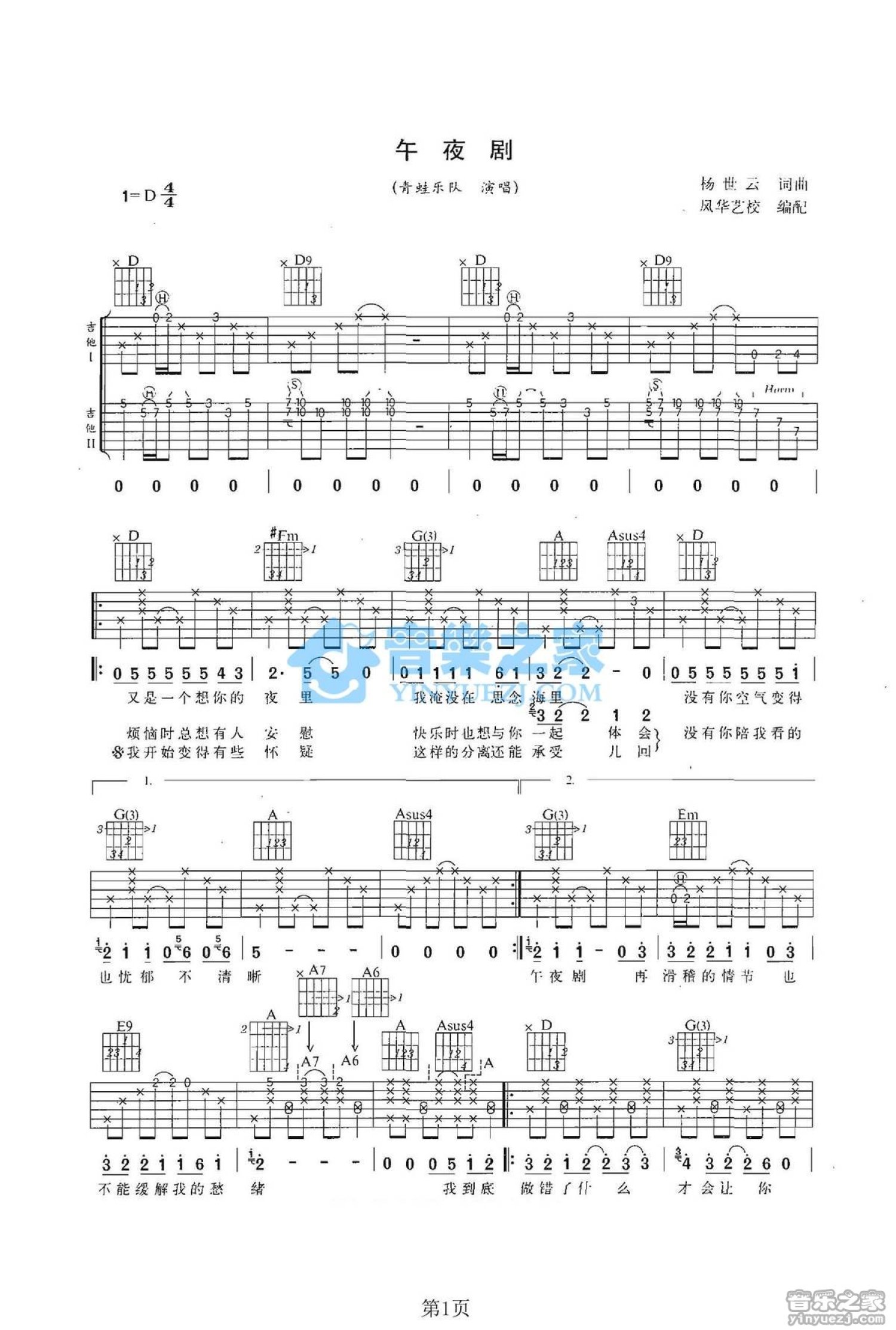 曲谱介绍: D调双吉他版青蛙乐队《午夜剧》吉他弹唱六线谱