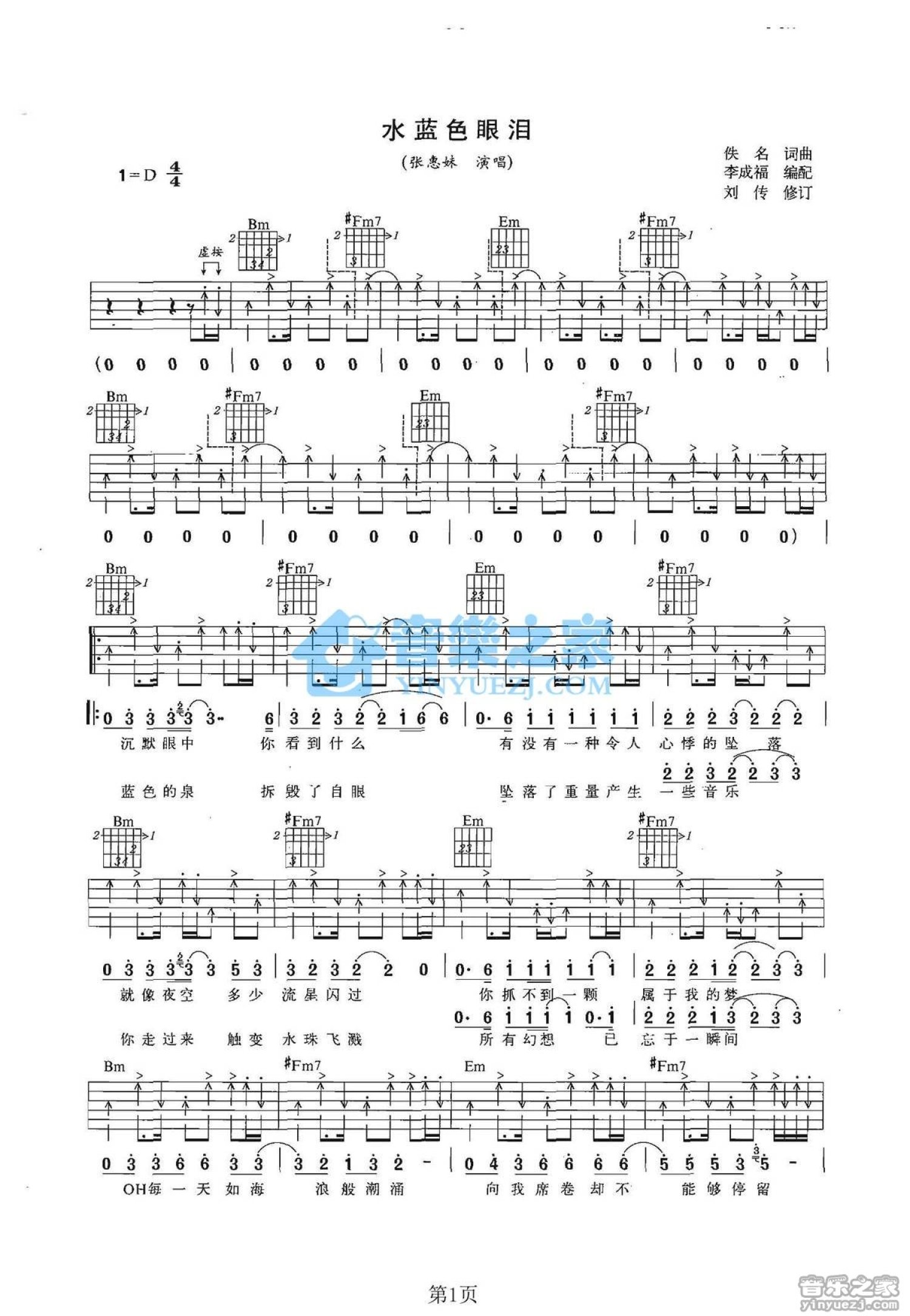 曲谱介绍: D调双吉他版张惠妹《水蓝色眼泪》吉他弹唱六线谱