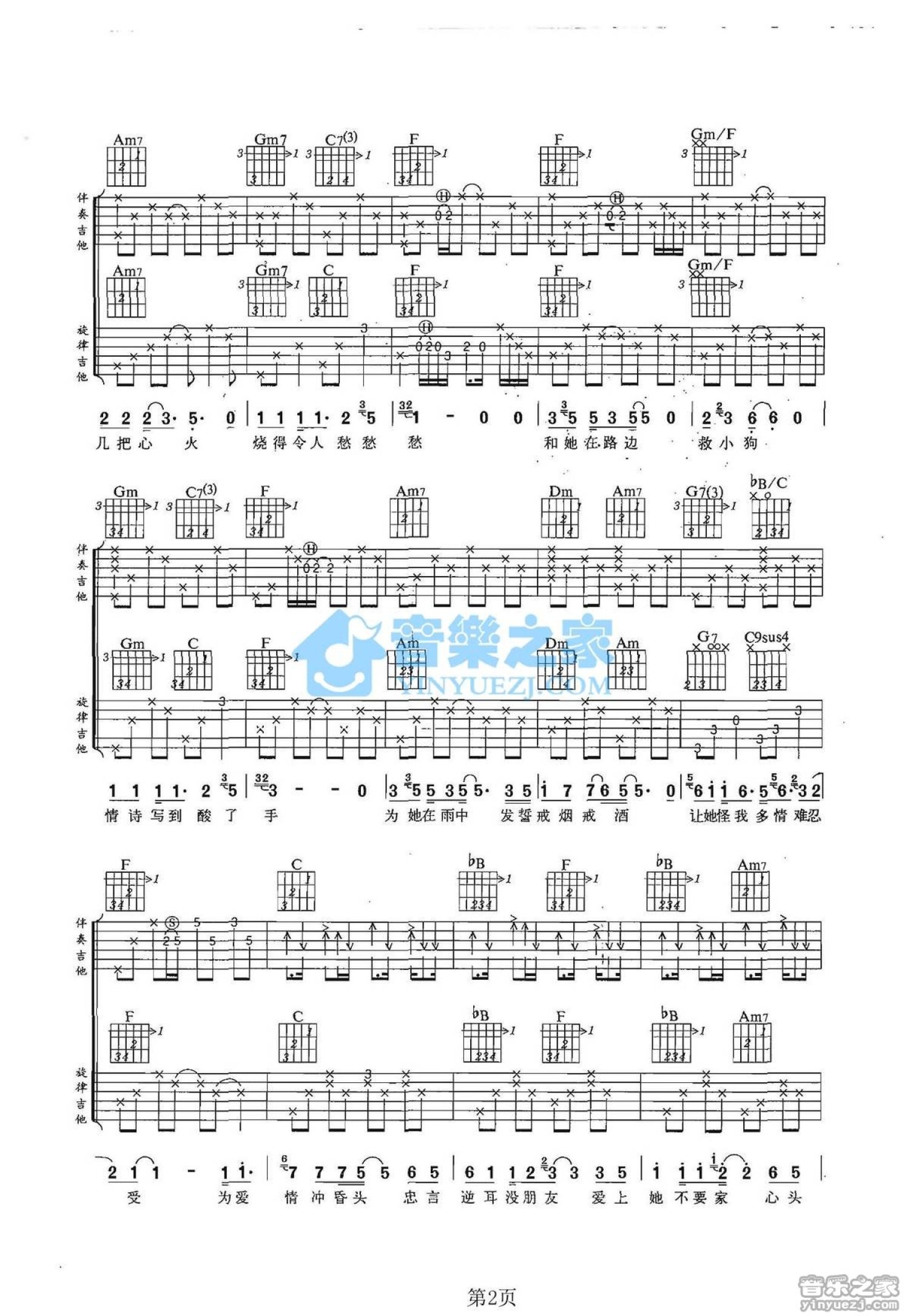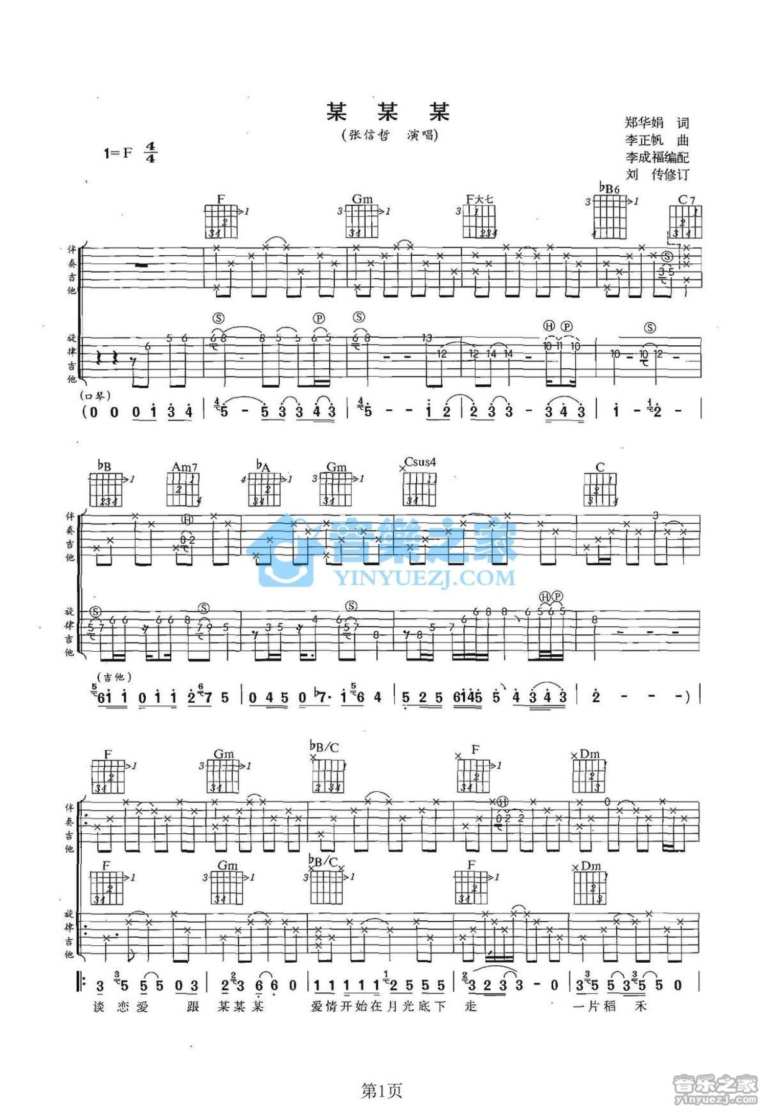 曲谱介绍: F调双吉他版张信哲《某某某》吉他弹唱六线谱