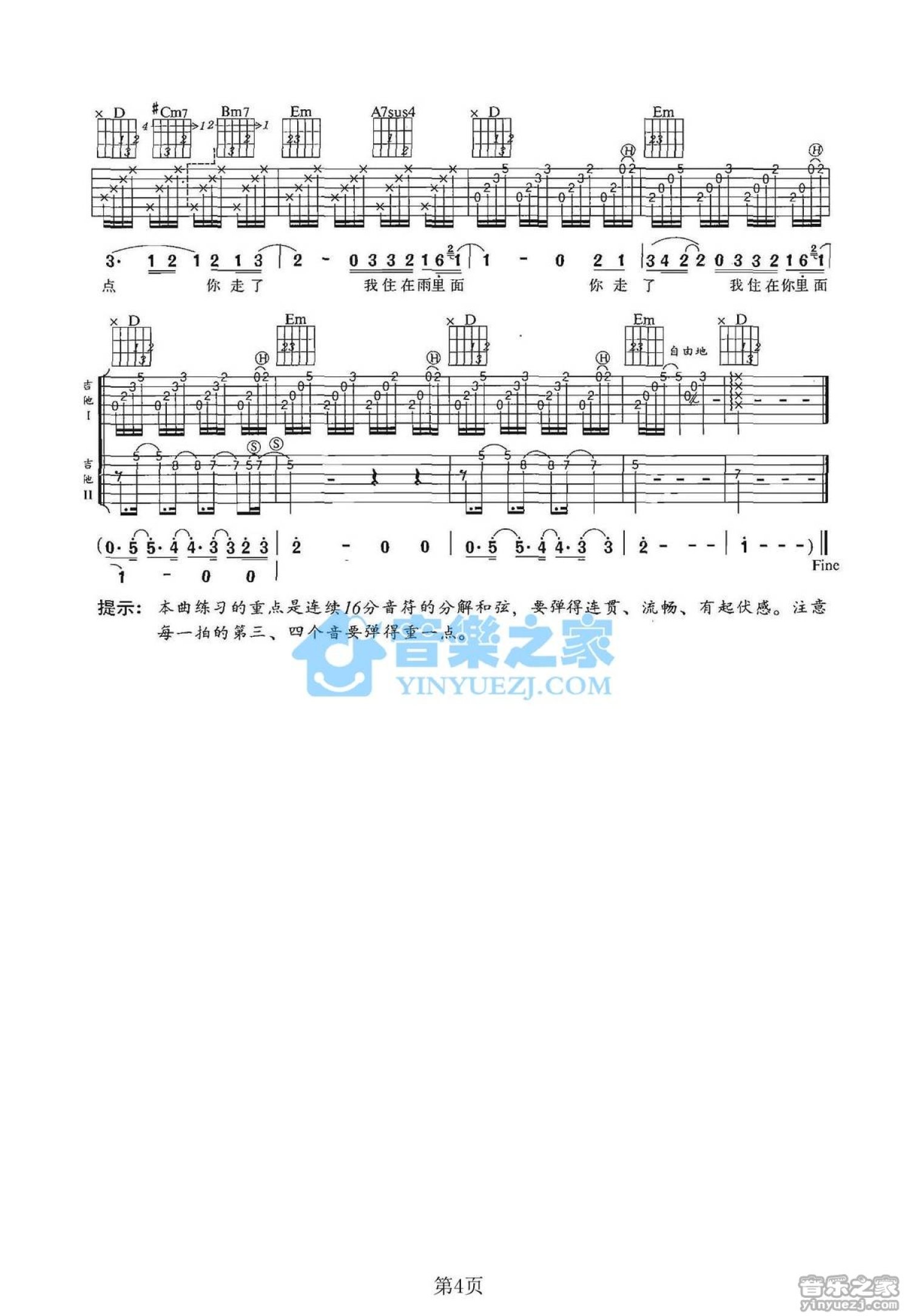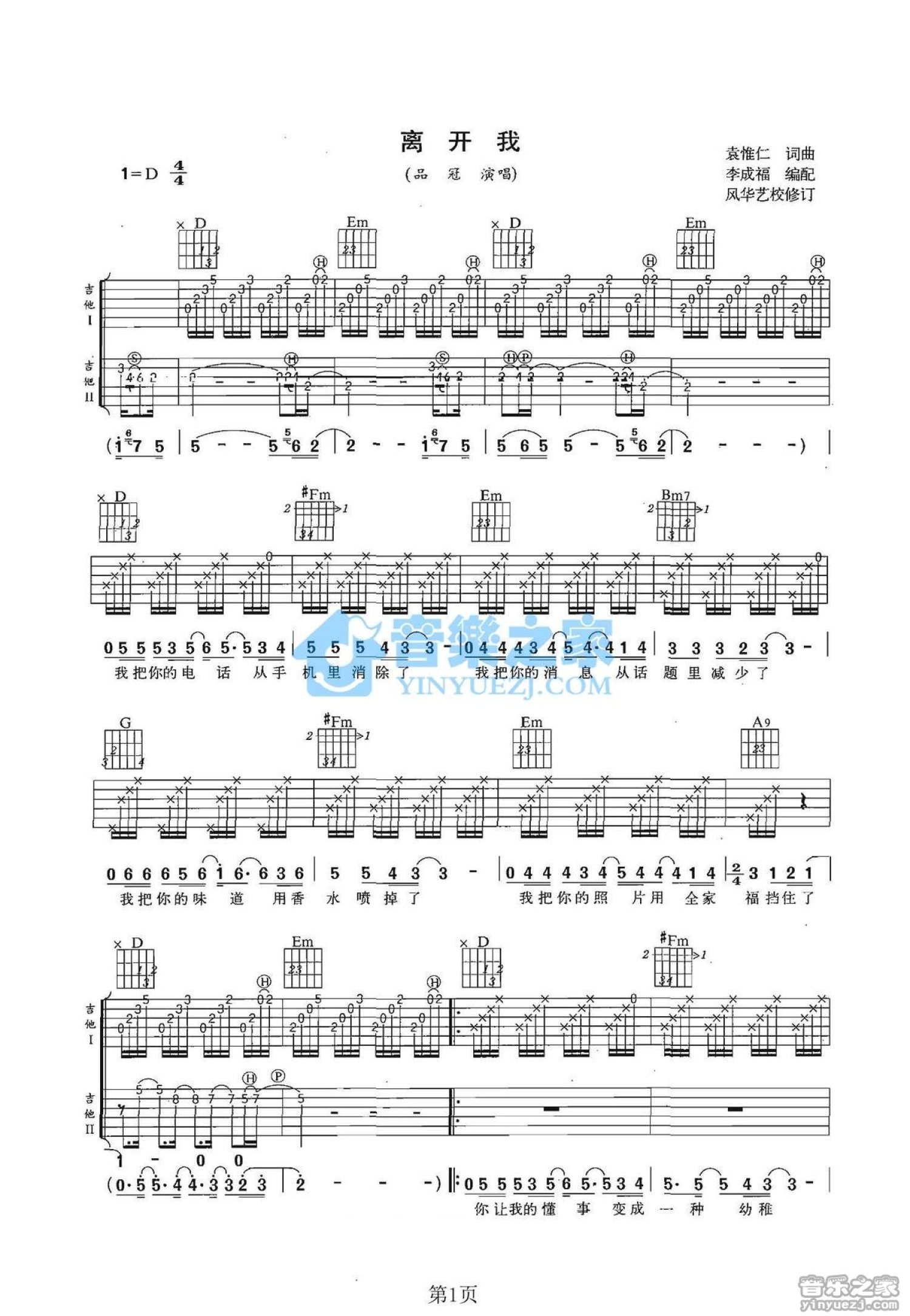 曲谱介绍: D调双吉他版品冠《离开我》吉他弹唱六线谱