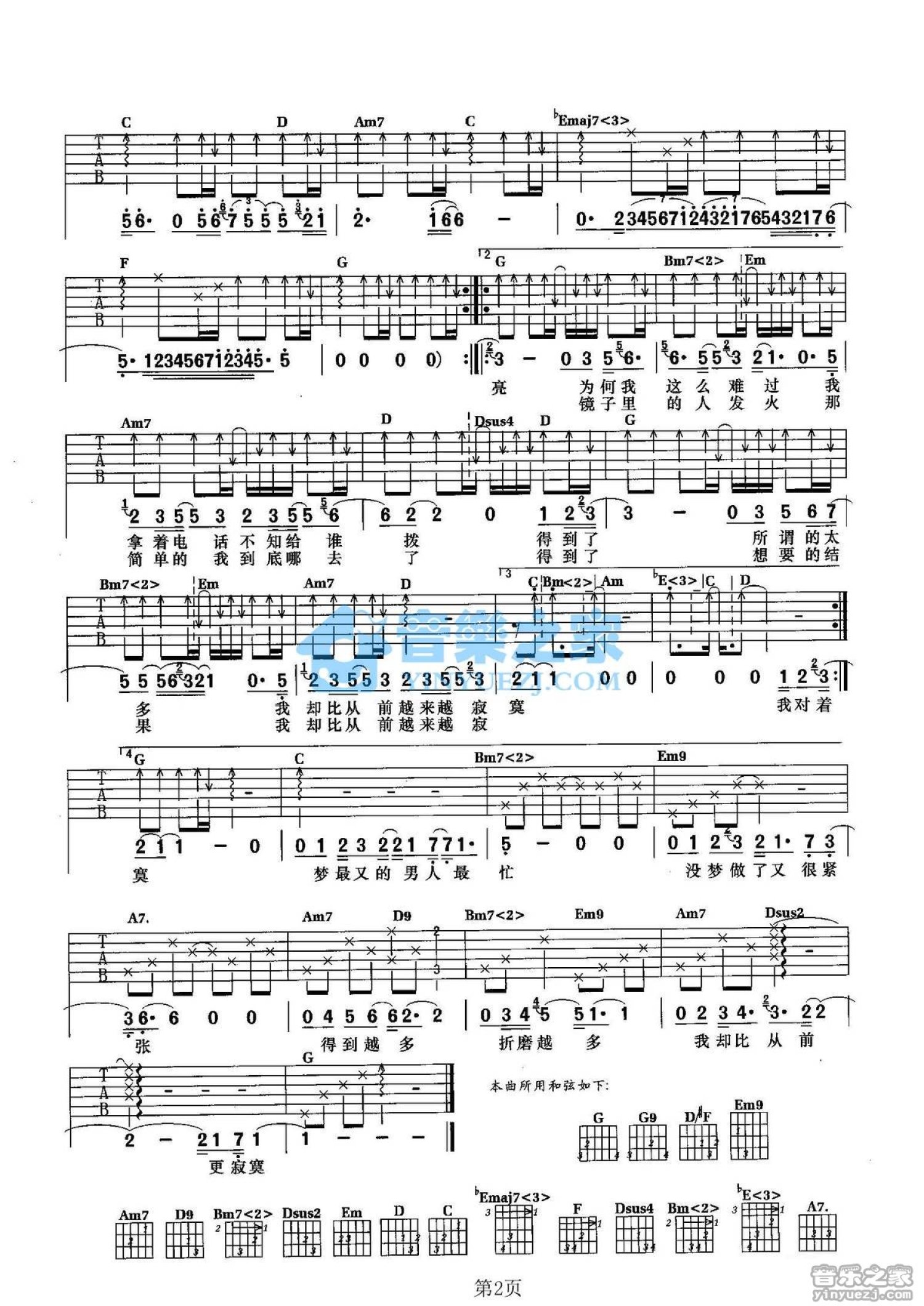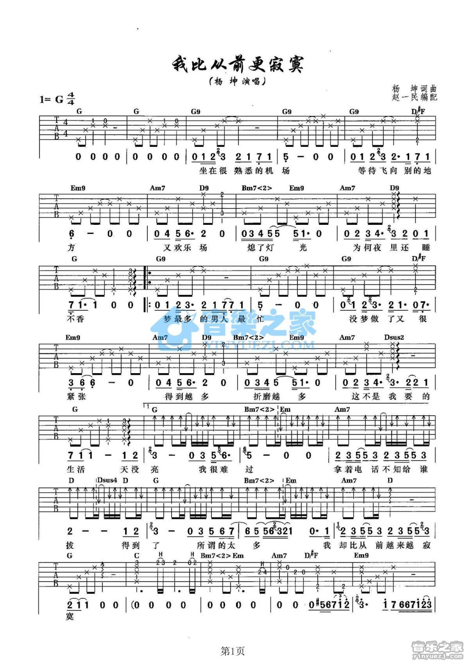 曲谱介绍: G调版杨坤《我比以前更寂寞》吉他弹唱六线谱