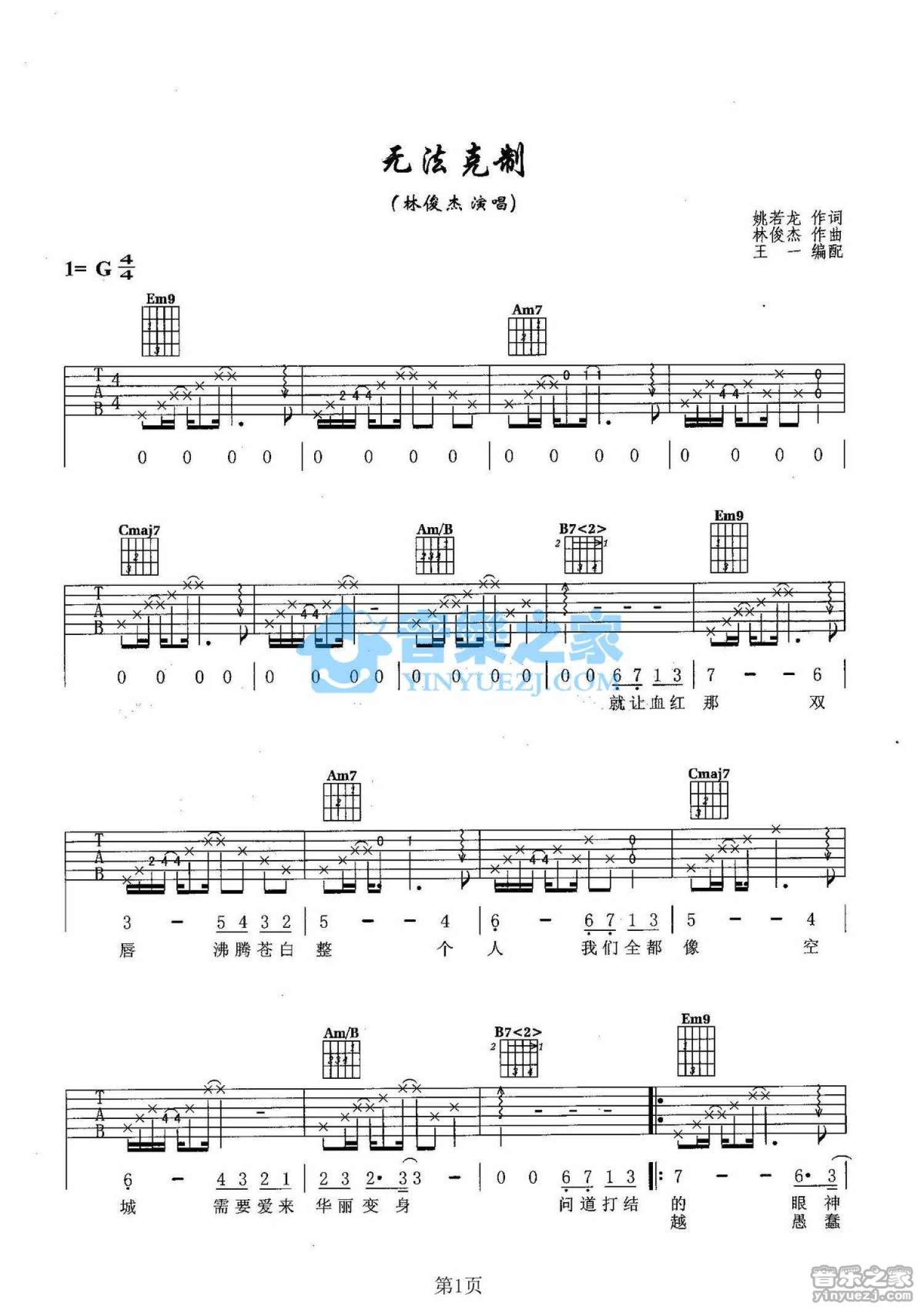 曲谱介绍: G调版林俊杰《无法克制》吉他弹唱六线谱