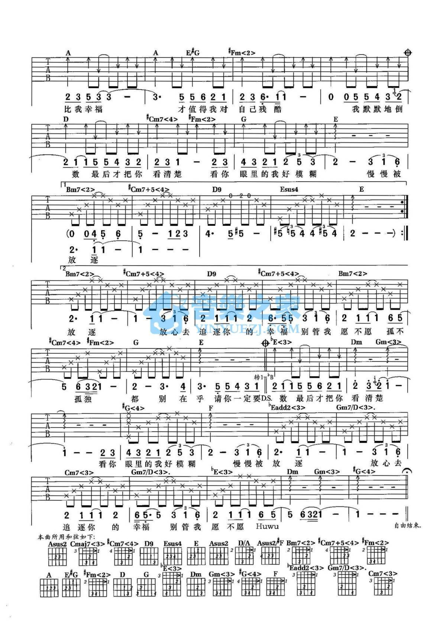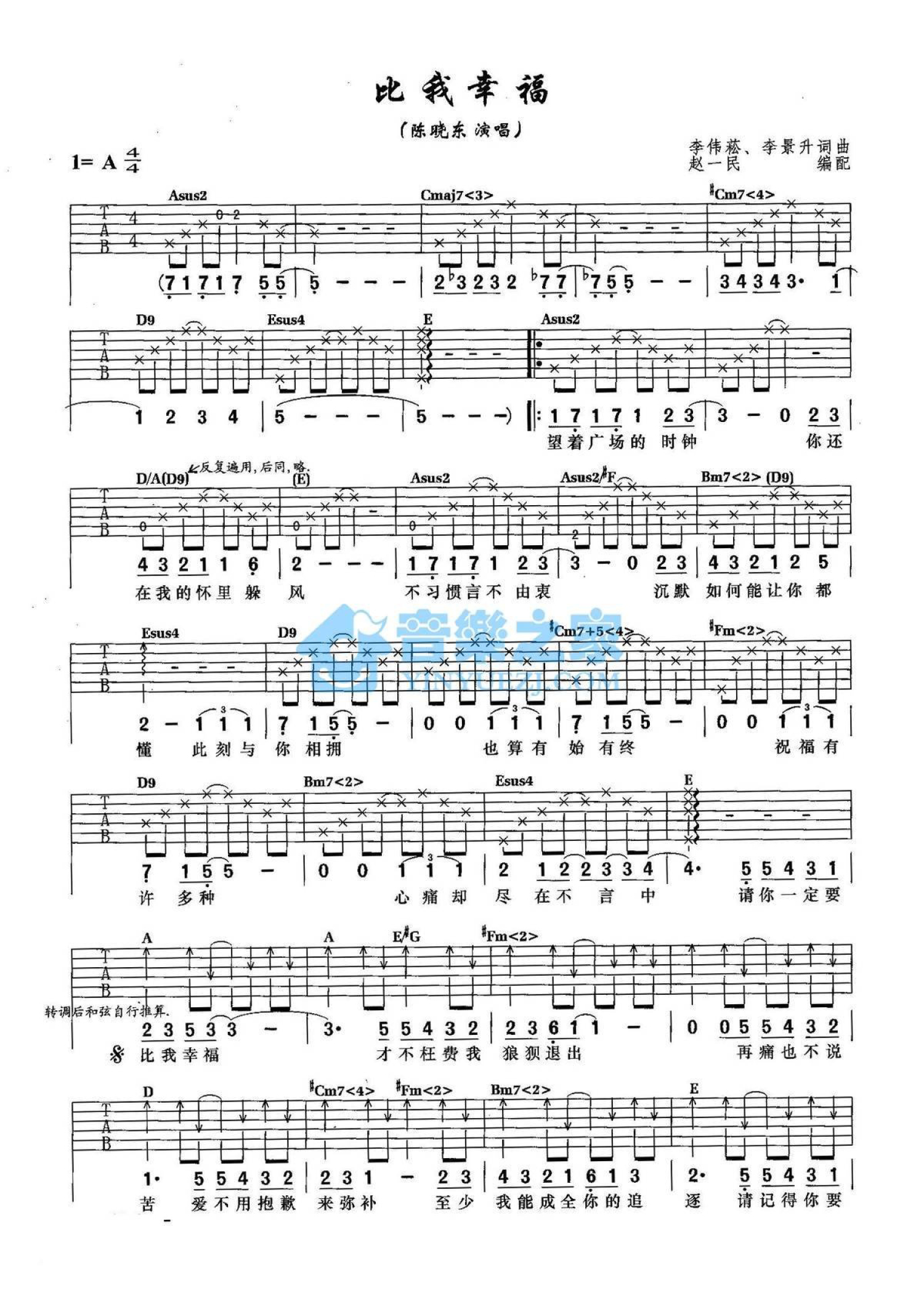 曲谱介绍: A调版陈晓东《比我幸福》吉他弹唱六线谱